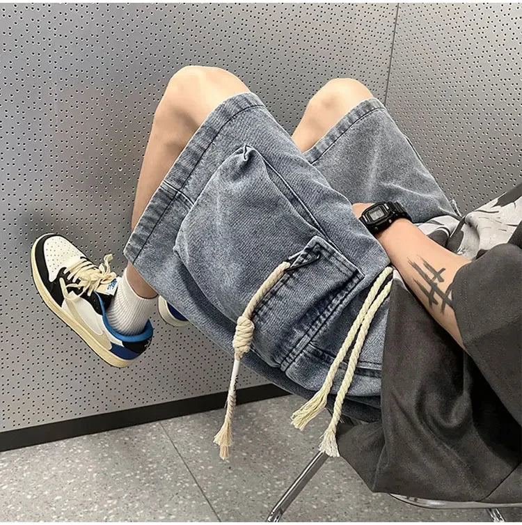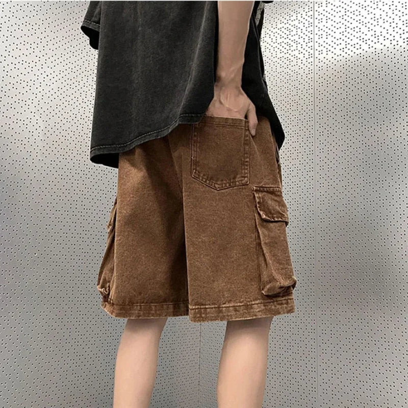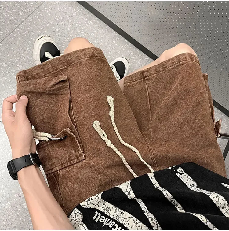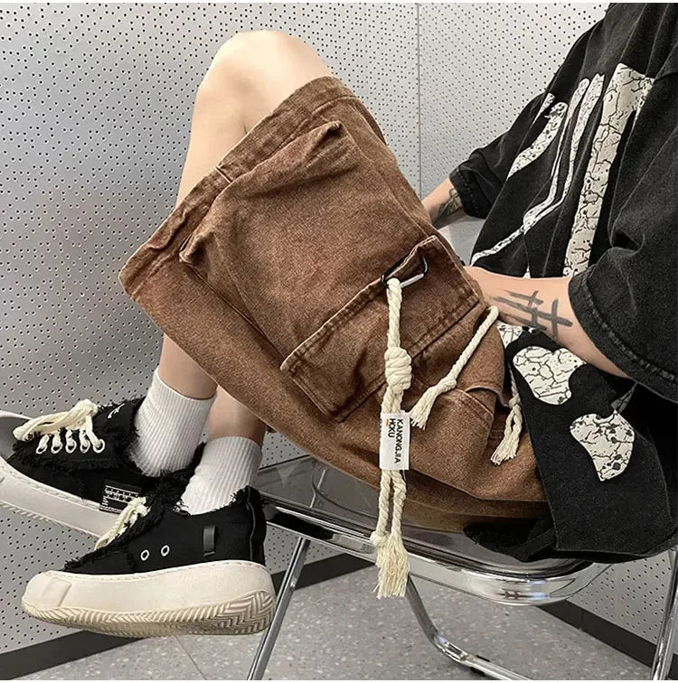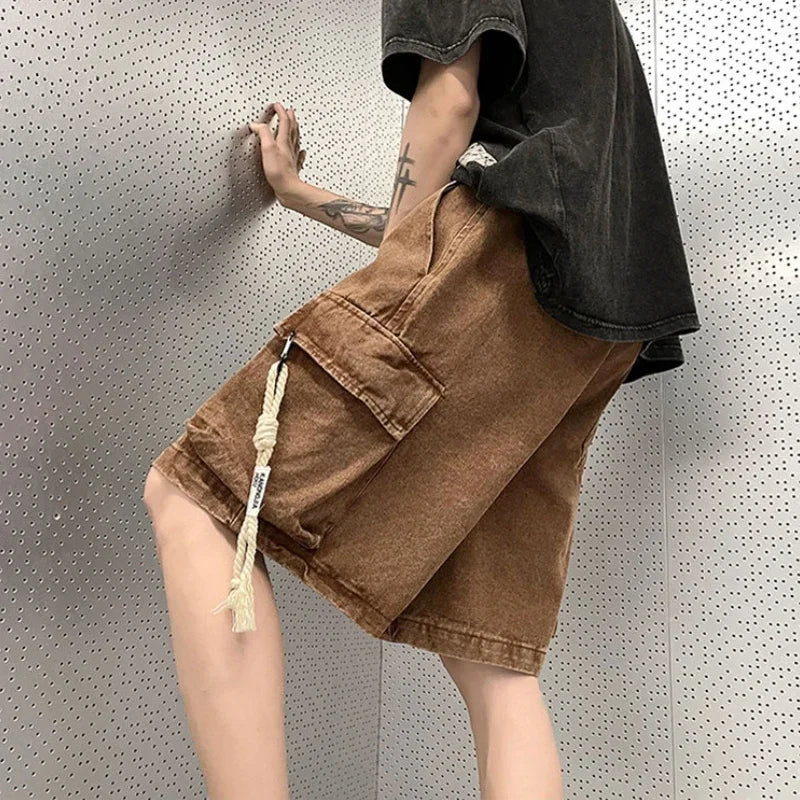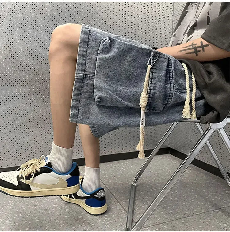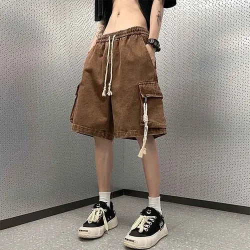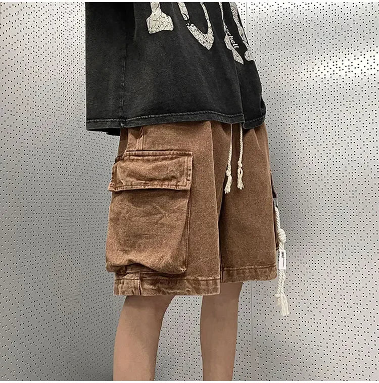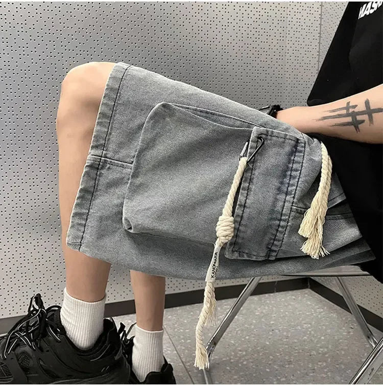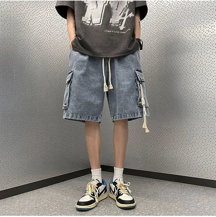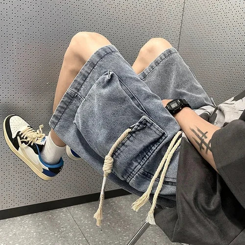 Cargo Shorts Men Denim Trousers Multi Pockets S-3XL Teens Hip Hop Washed Chic American Streetwear Fashion Elastic Waist Vintage