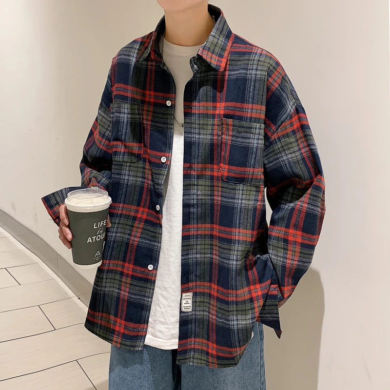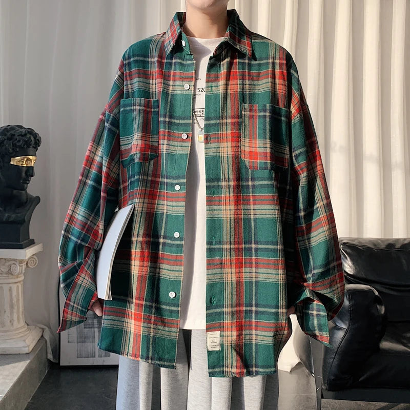 Threebooy Harajuku Long Sleeve Plaid Shirts Men Big Size M-5XL Autumn Chic Loose Vintage High Street All-match Gentleman Camisa