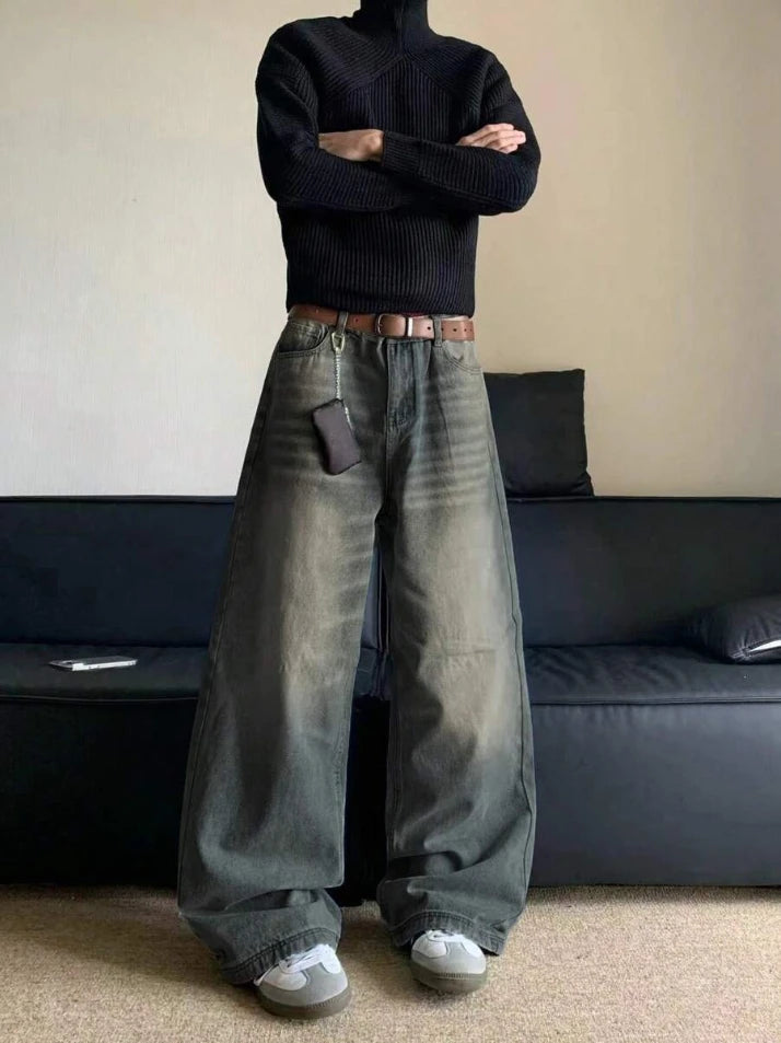 Threebooy 1pcs Vintage Style Men's American Street Casual Jeans Washed Overalls Comfortable and Versatile for Daily Seasonal Wear
