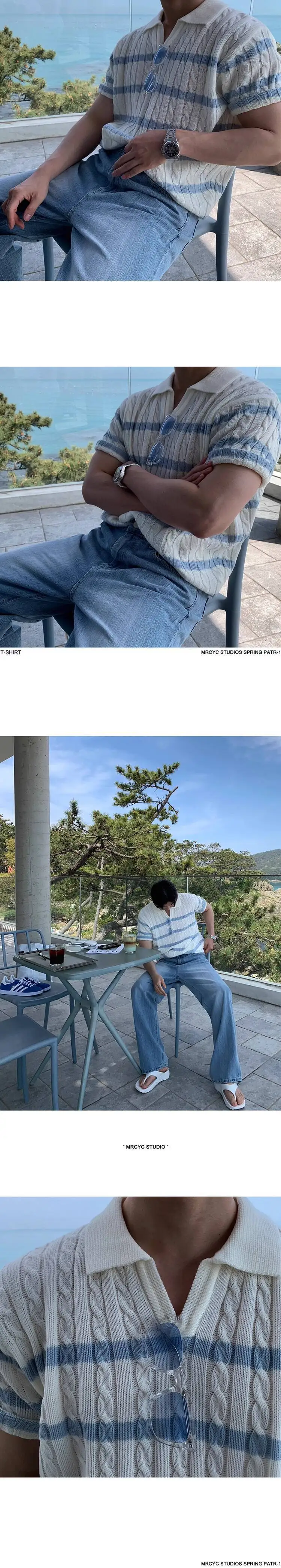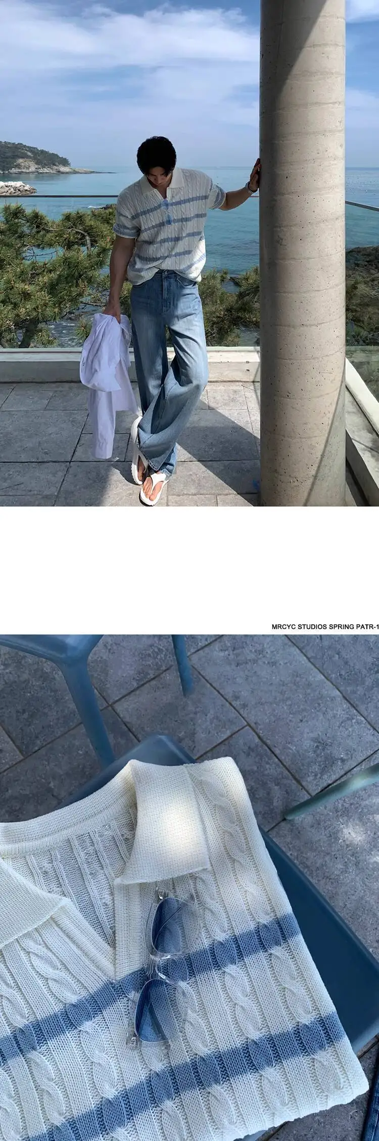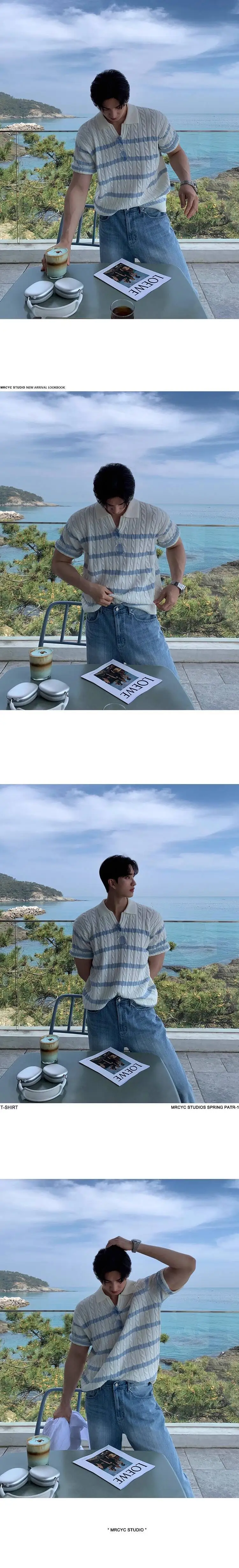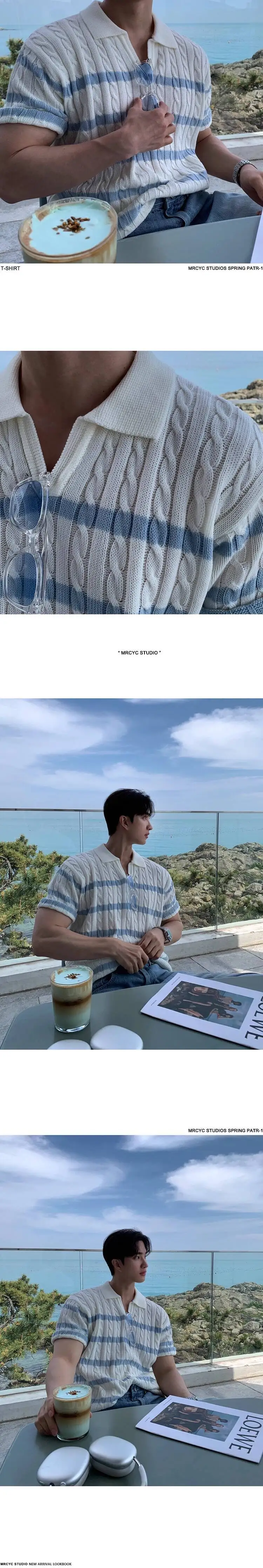 Threebooy 2025 Summer Simple Men's T-shirts Lapel Striped Button Design Knitted Clothing Short Sleeved Casual Male Tees Menswear