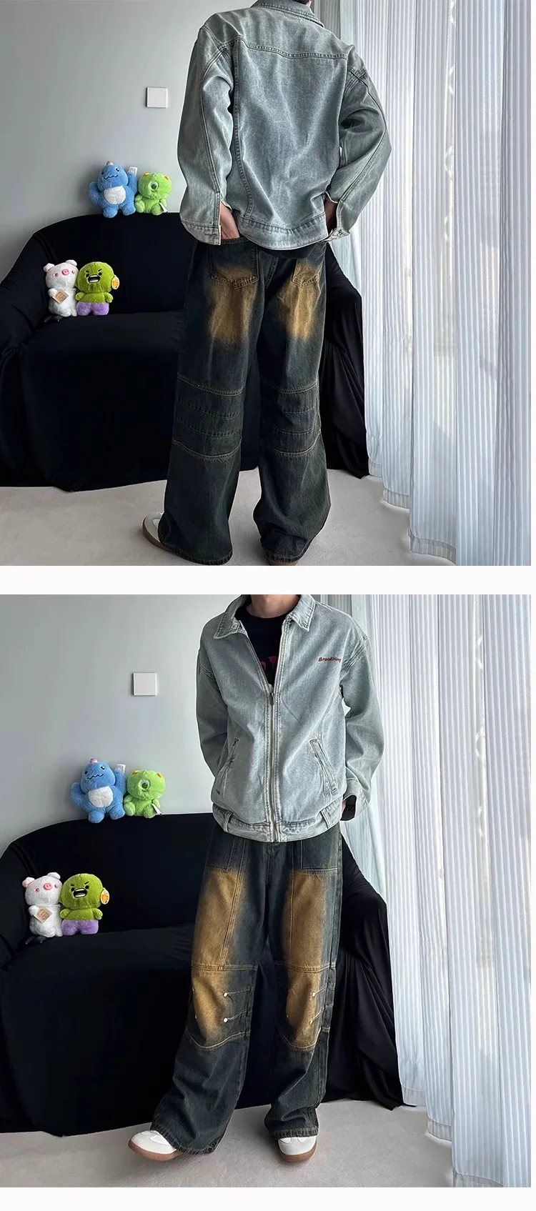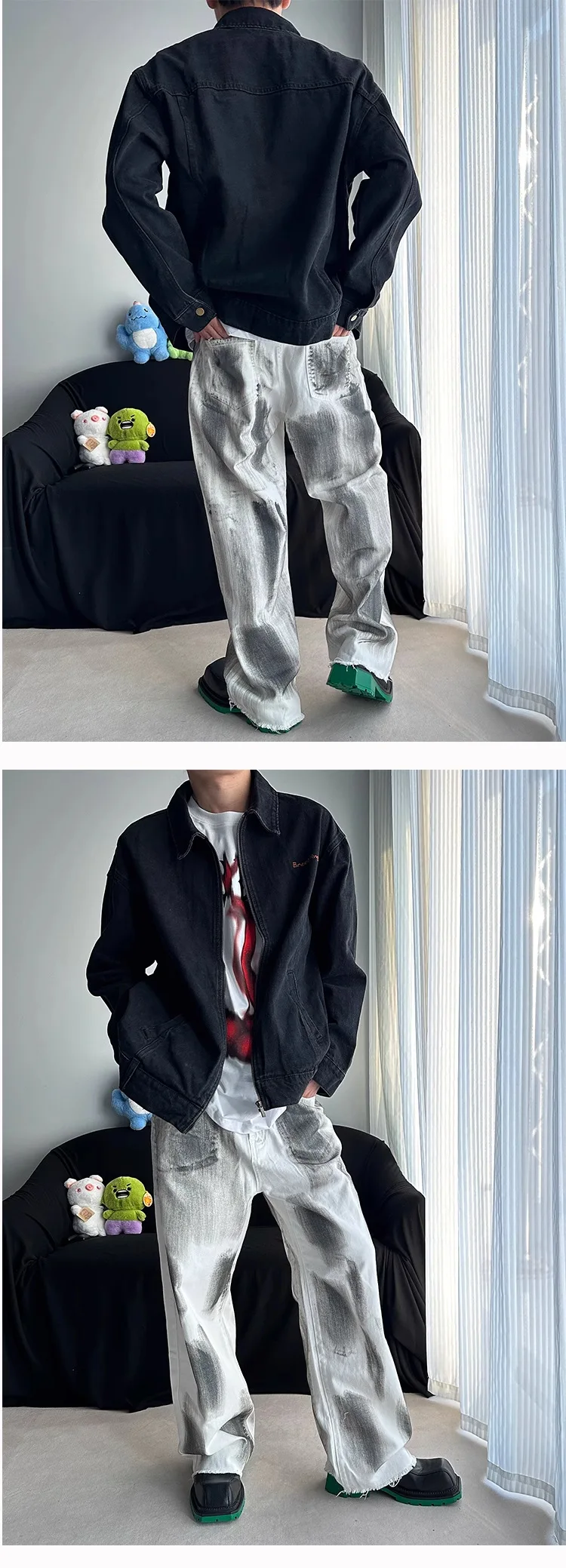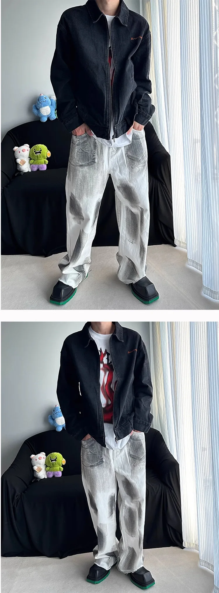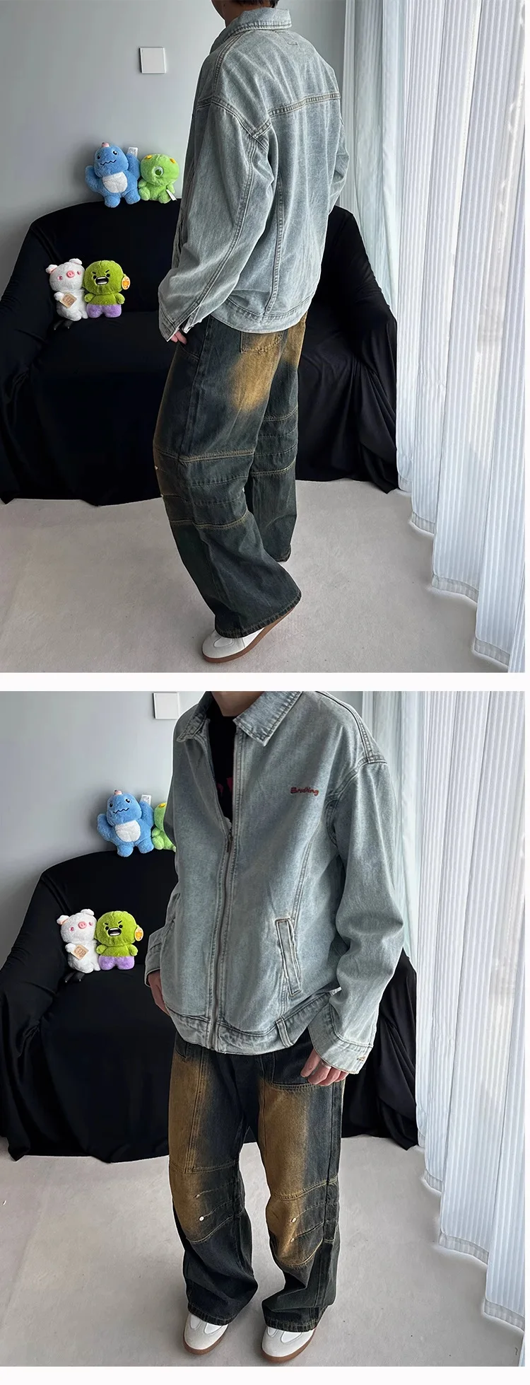 Threebooy 90s Fashion American Embroidery Washed Denim Jacket Men's Spring and Autumn New Style Loose Casual Jacket Top Couple