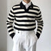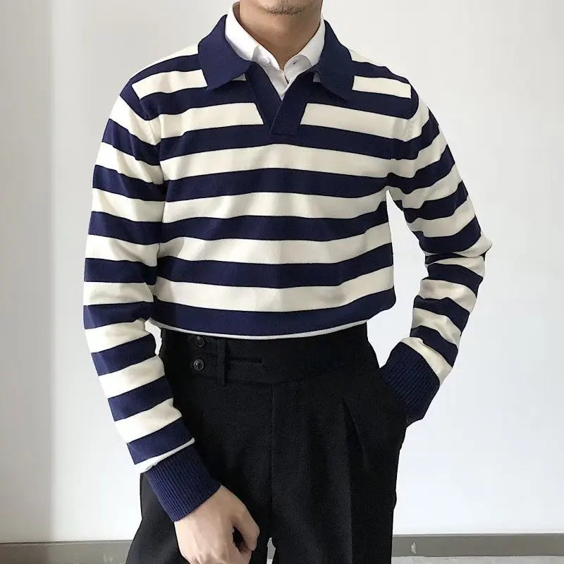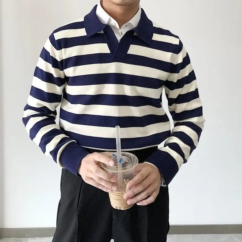 Threebooy American Chic Striped Men Polo Sweater Luxury Trendy Business V Neck Knit Solid Color Pullover Leisure Slim Long Sleeve Knitwear