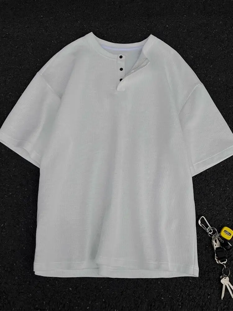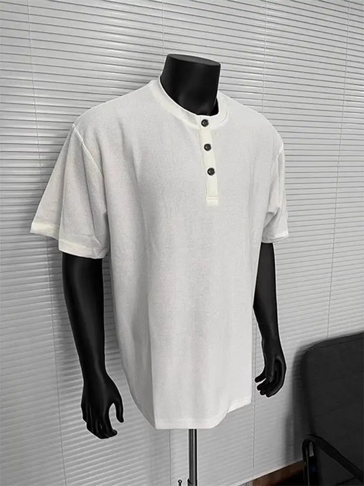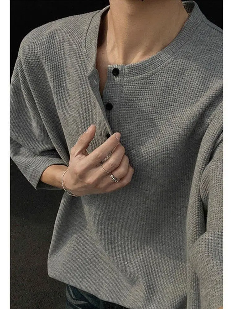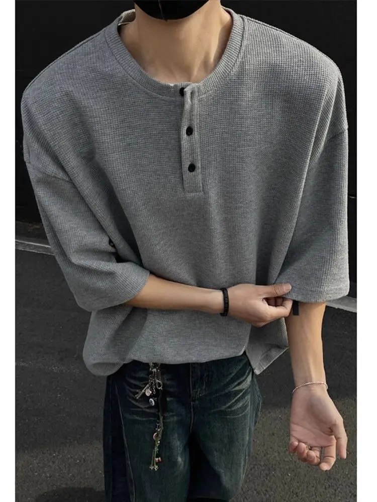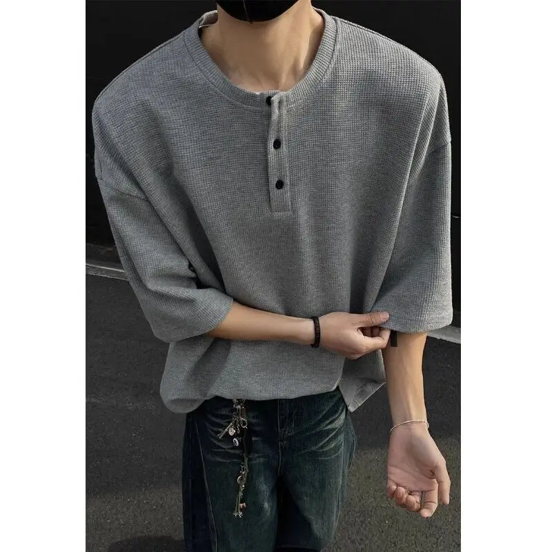 Threebooy American Cleanfit Shirt Henry Neck Waffle Short-sleeved Blouse Men's Summer Retro T-shirt High-end Gray O-neck Half Button Shirt