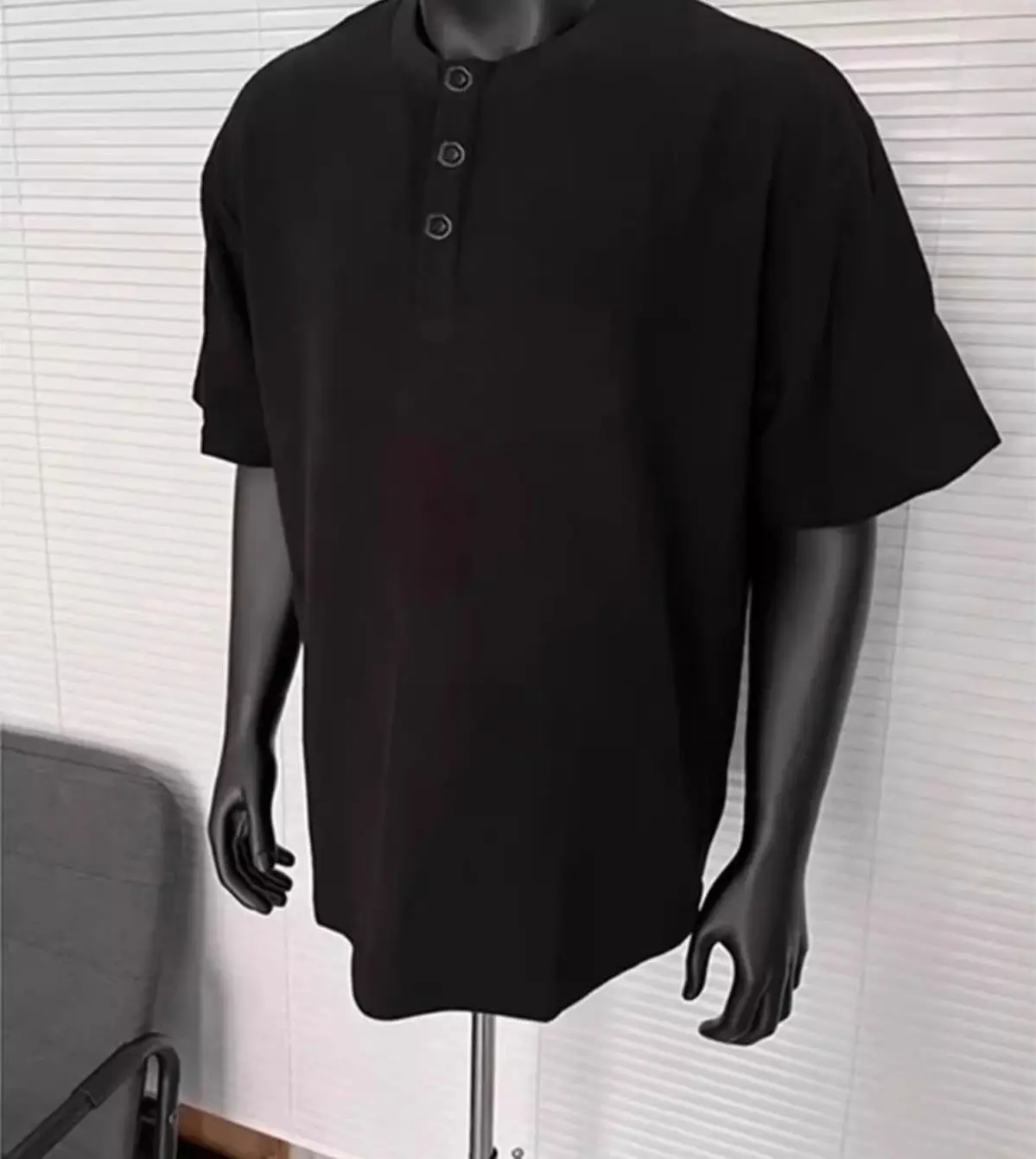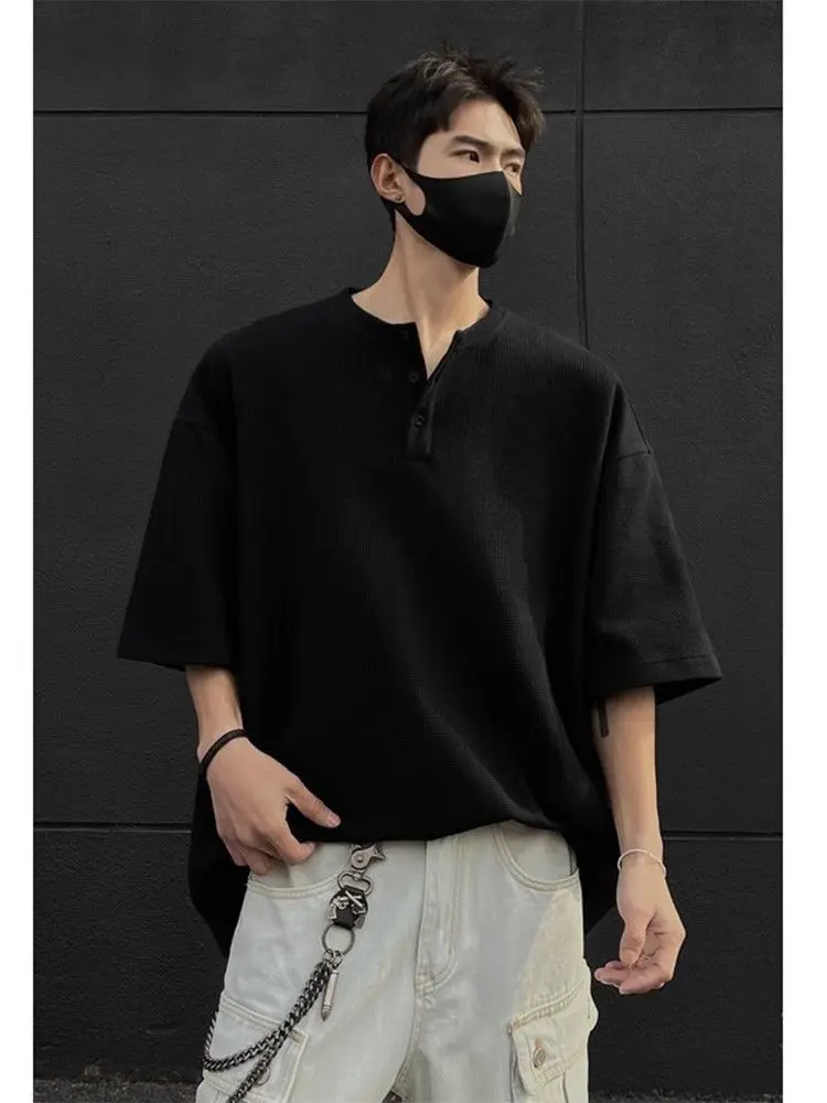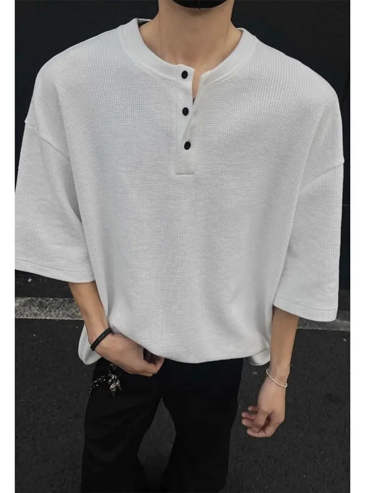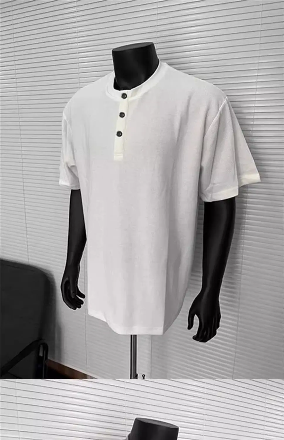 Threebooy American Cleanfit Shirt Henry Neck Waffle Short-sleeved Blouse Men's Summer Retro T-shirt High-end Gray O-neck Half Button Shirt