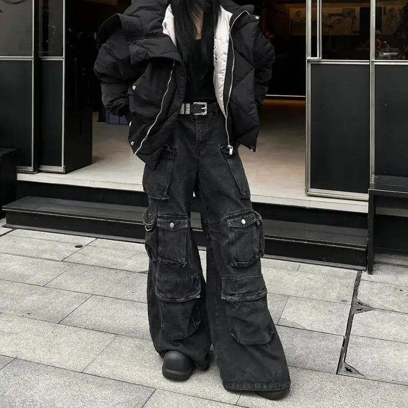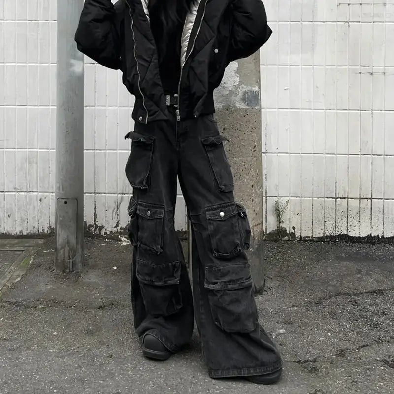 Threebooy American heavy industry multi pocket splicing design straight tube workwear jeans men and women trendy retro casual pants y2k