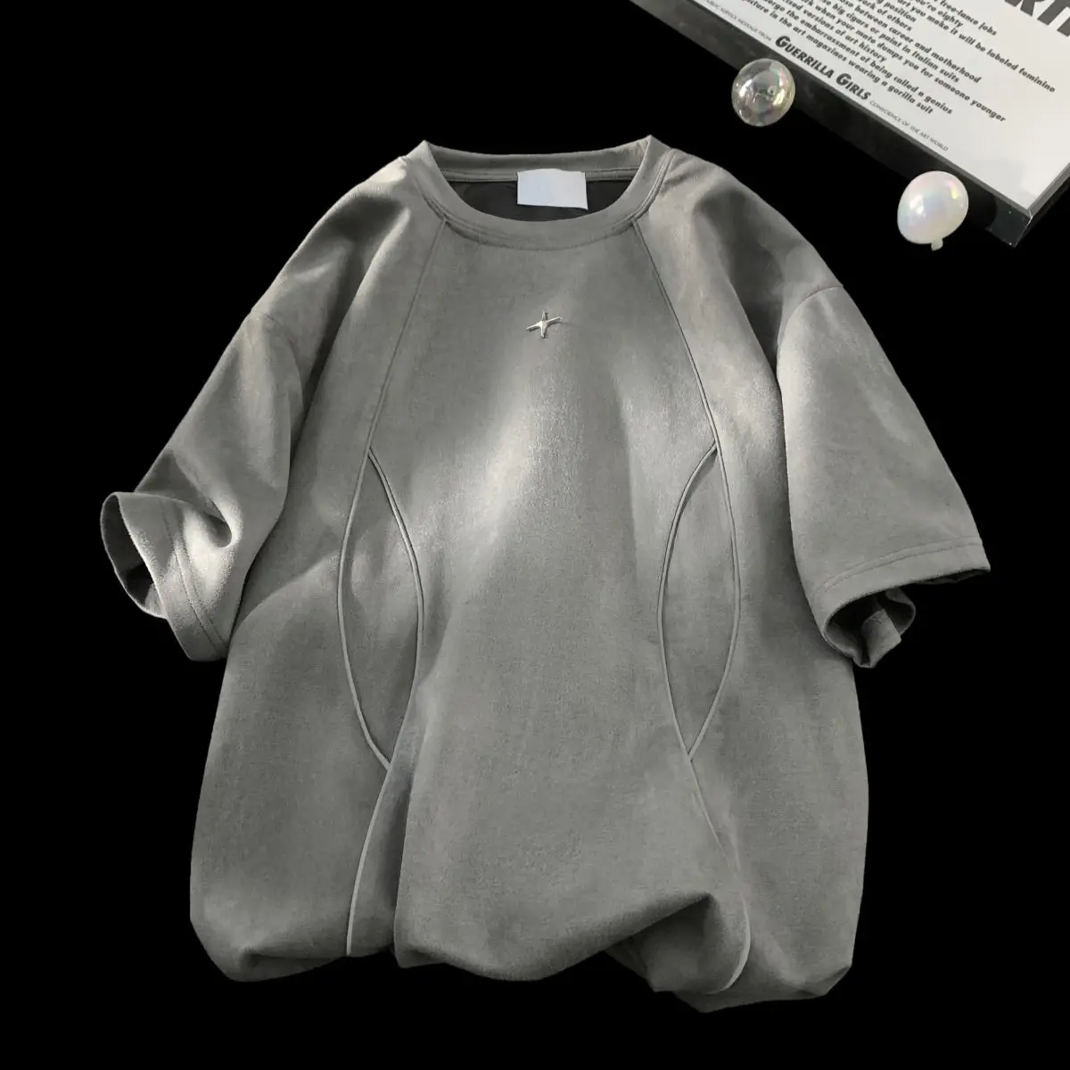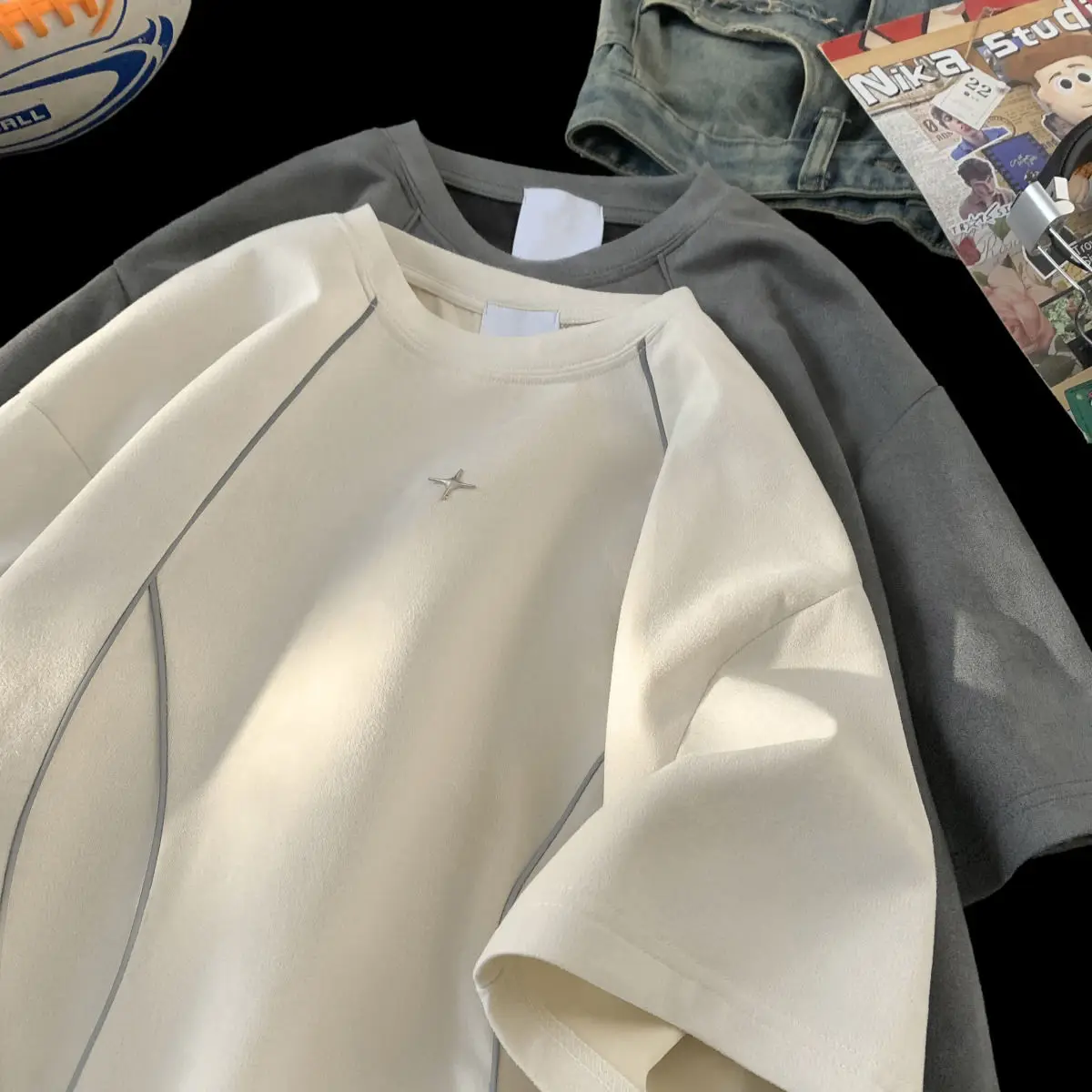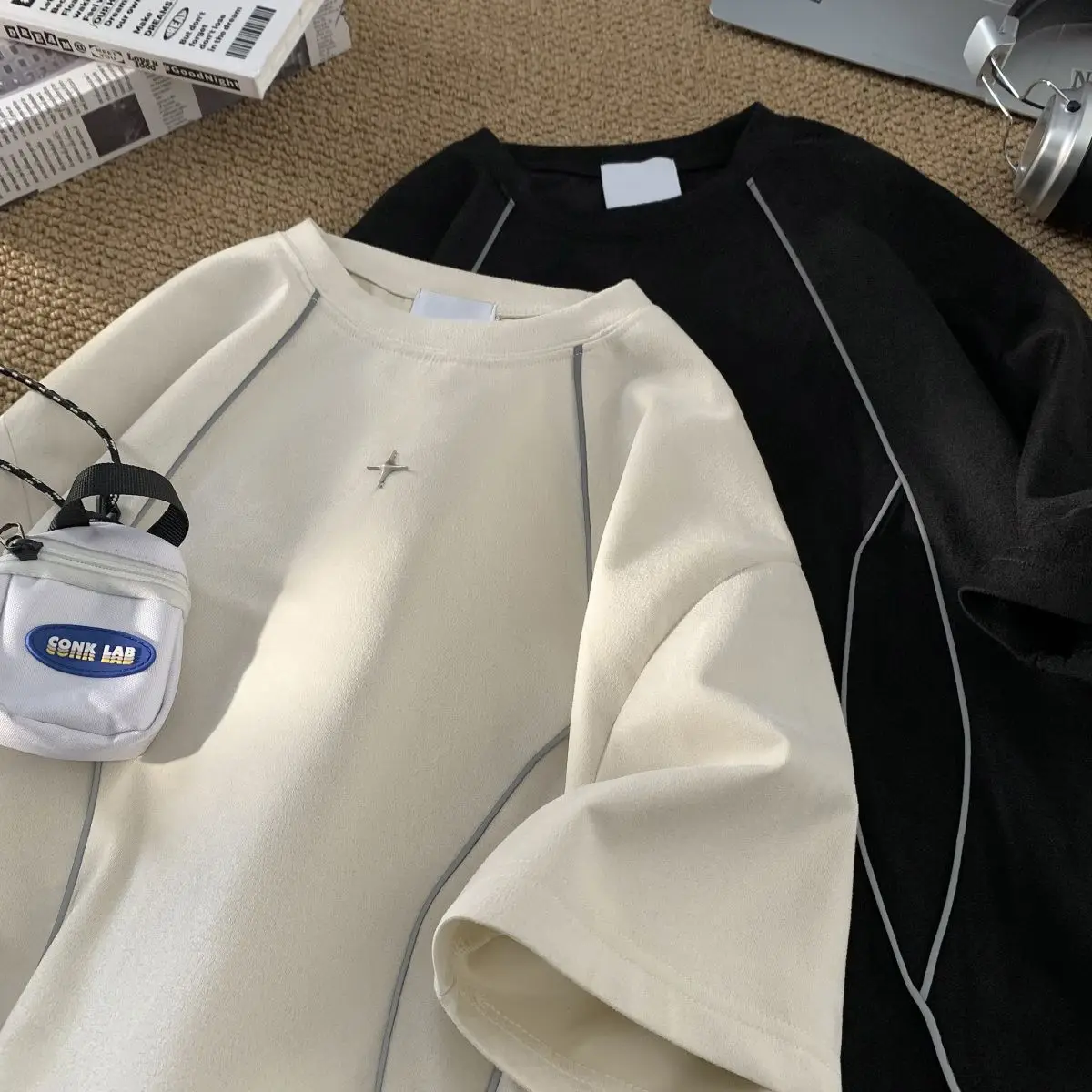 Threebooy American High Street Niche Suede Short-sleeved T-shirt Men's Summer Korean Style Fashion Reflective Strip Loose T-shirt Urban