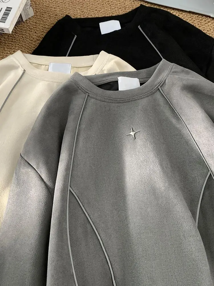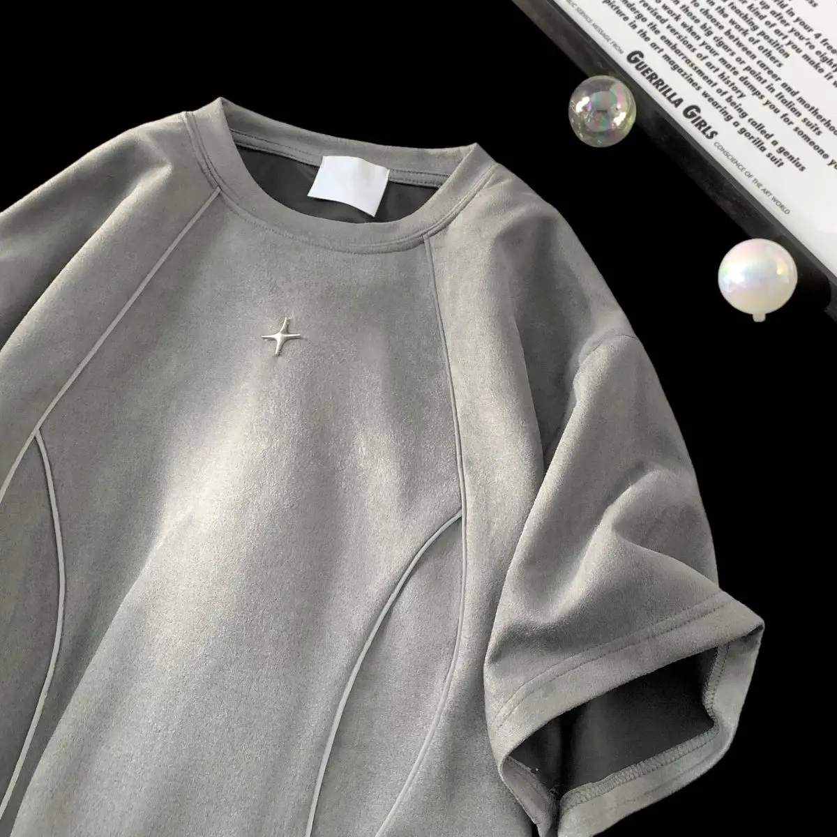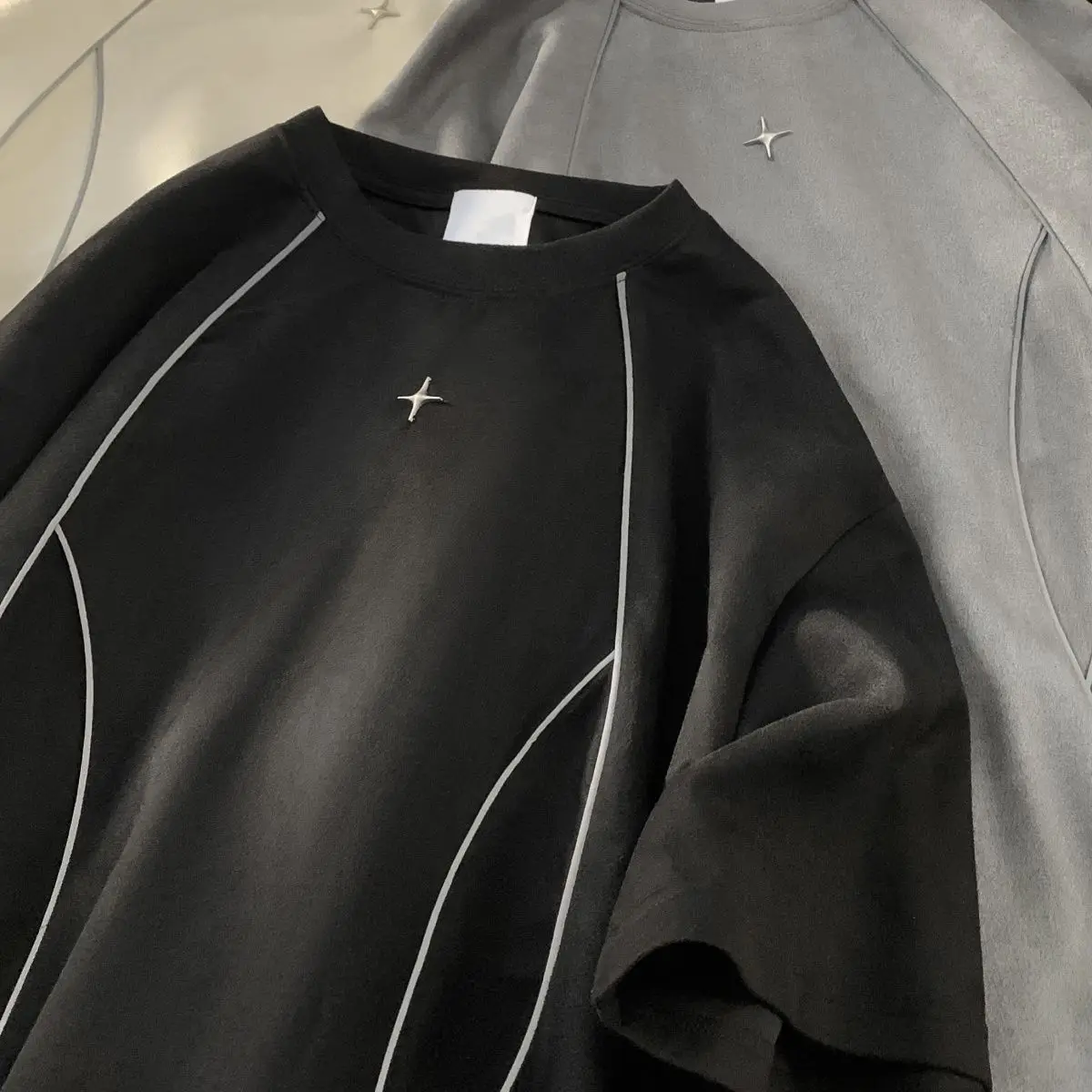 Threebooy American High Street Niche Suede Short-sleeved T-shirt Men's Summer Korean Style Fashion Reflective Strip Loose T-shirt Urban