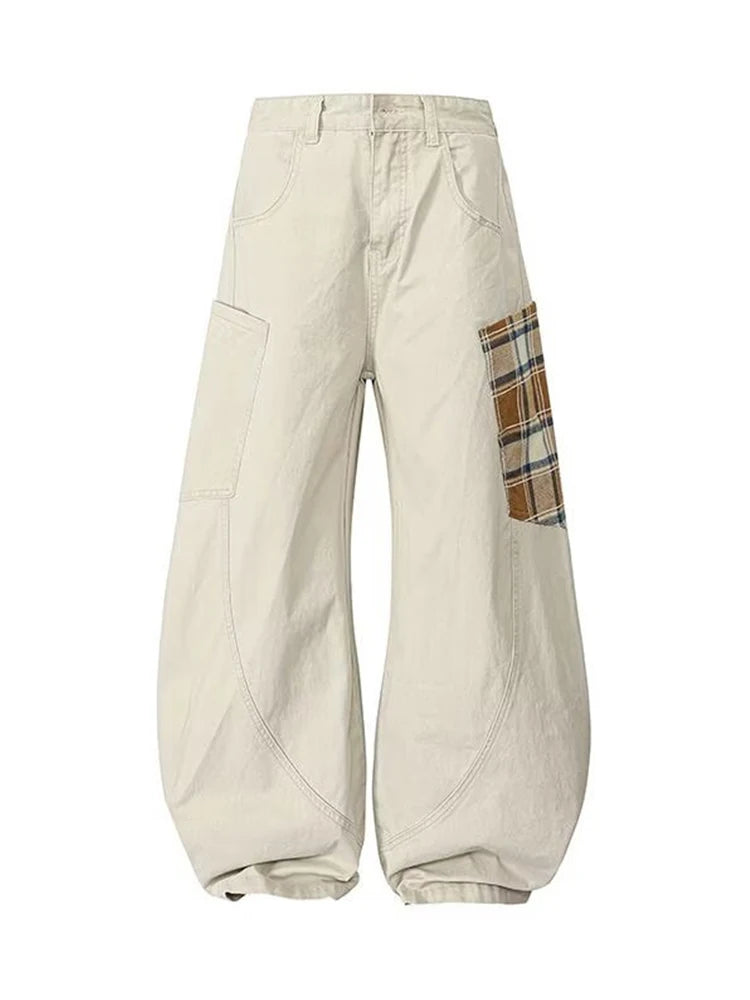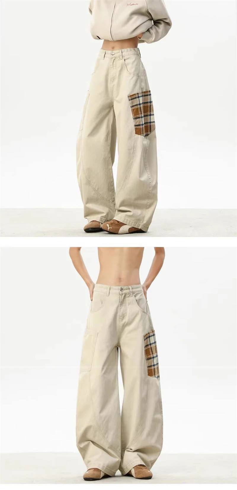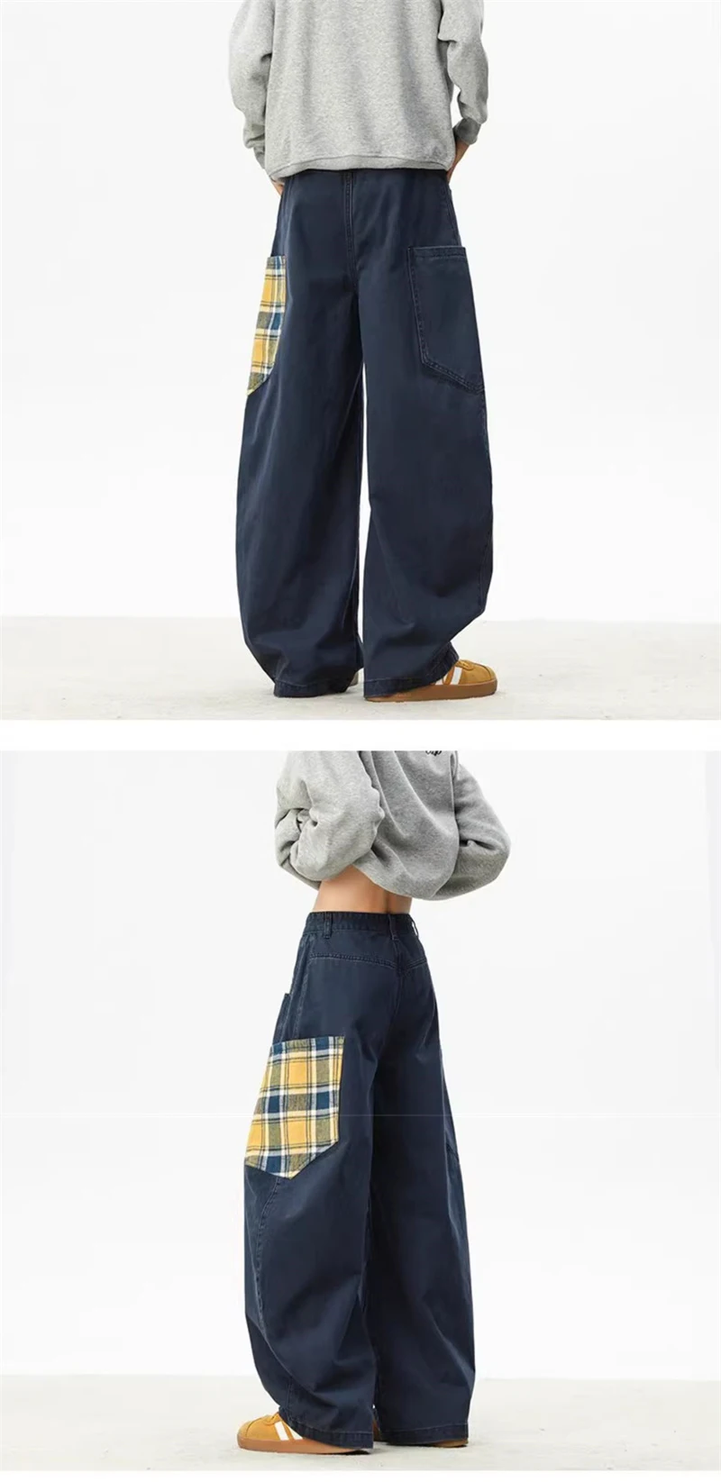 Threebooy American Plaid Multi-pocket Cargo Pants For Men Hip Hop Fashion Straight Wide-leg Trousers New Patchwork Work pantalones