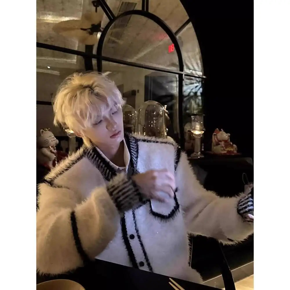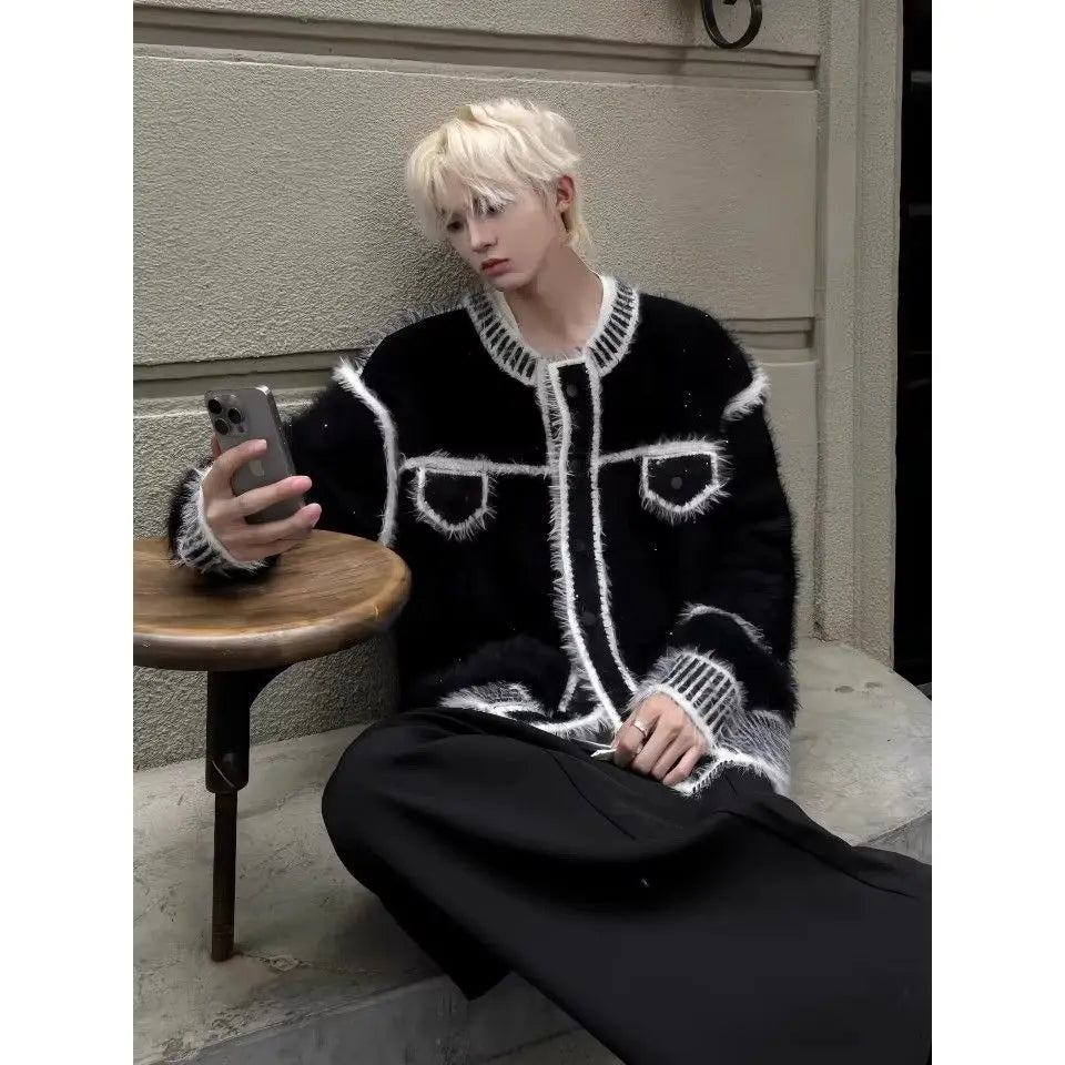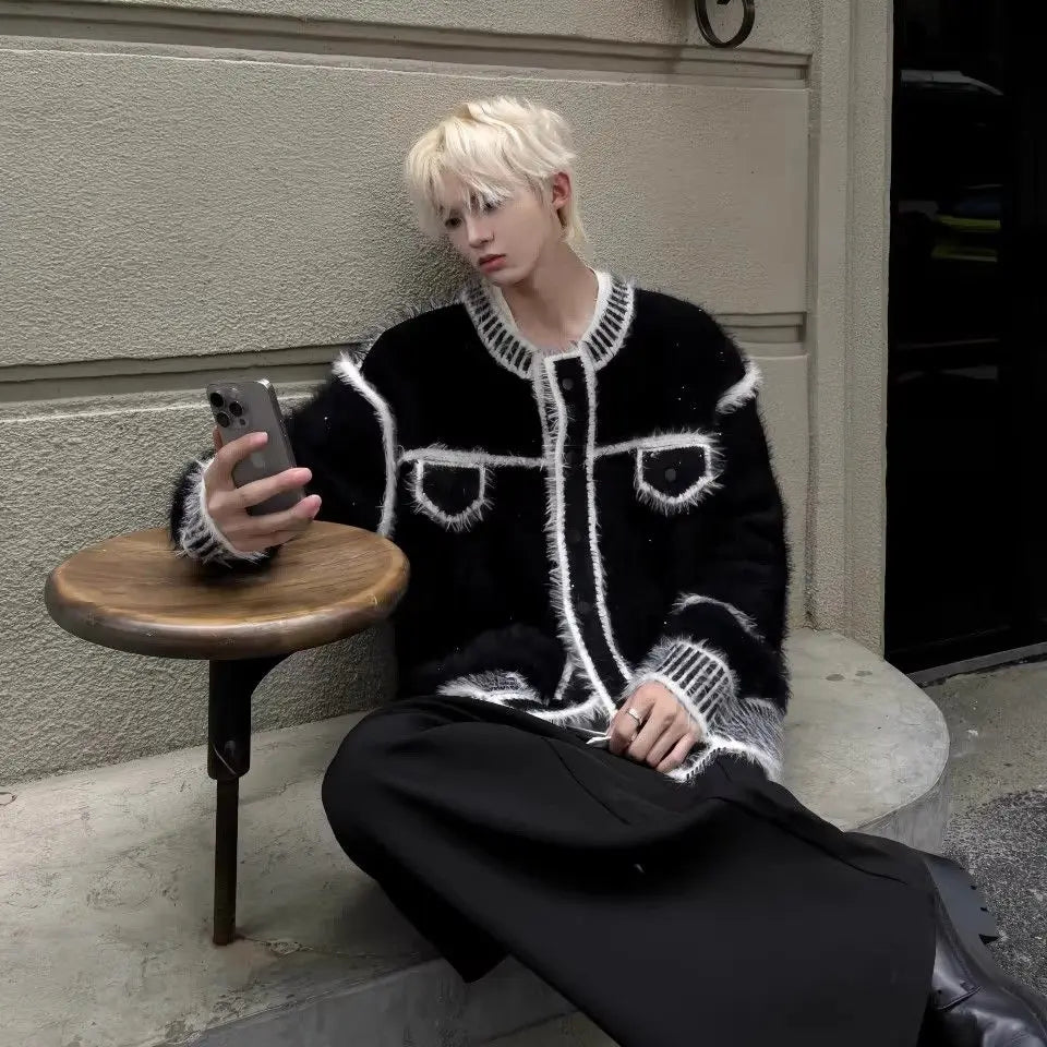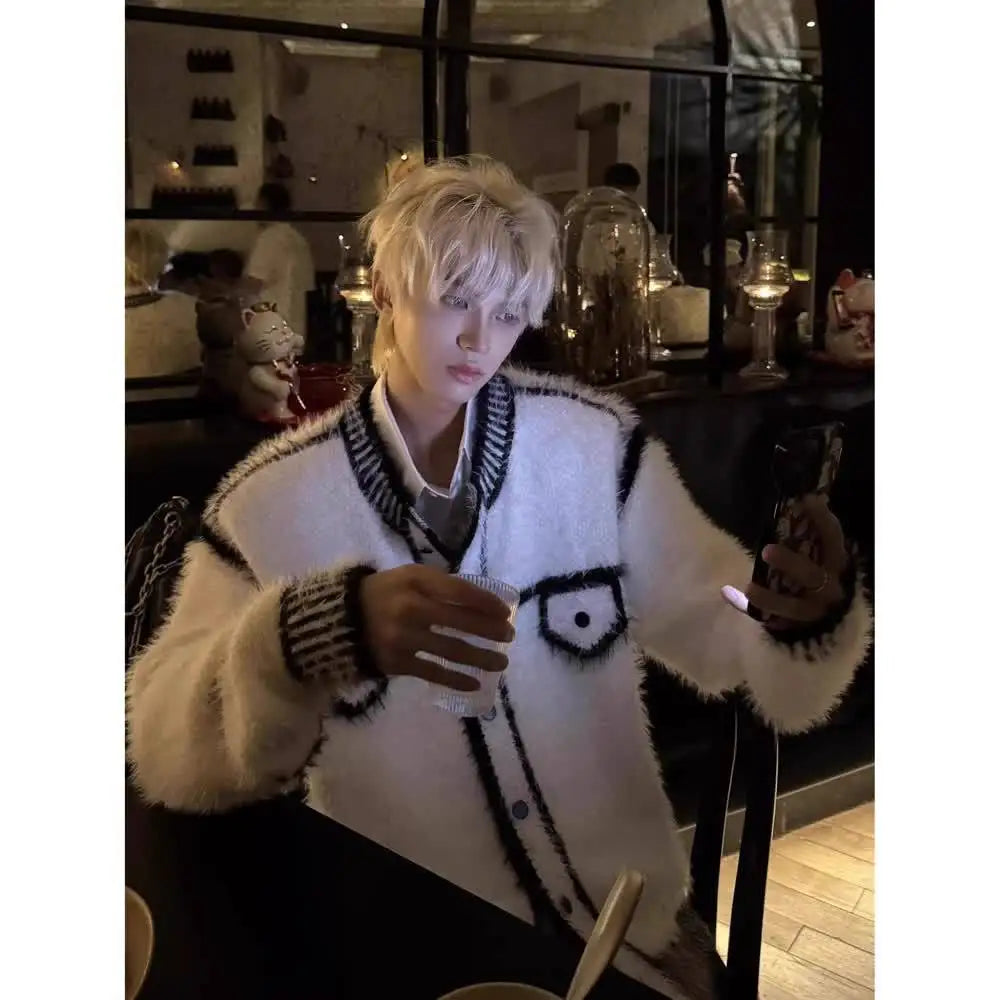 Threebooy American Punk Sweater Imitation Mink Velvet Cardigan Sweater Autumn Winter New Contrast Color High-end Versatile Knitted Jacket