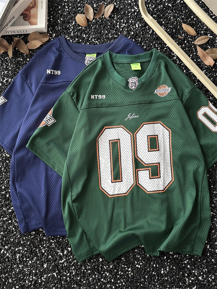 Threebooy American Retro Jersey Short-sleeved T-shirt Men's Trendy Quick-drying Mesh Breathable Loose Casual V-neck Racing Suit Top Chic