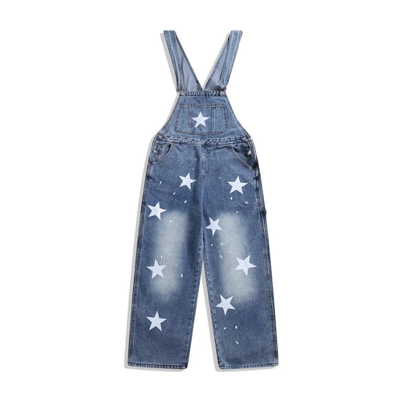 American Retro Star Splashing Print Denim Overalls Korean Style Fashion High-end Solid Color Jumpsuits Aesthetic All-match Chic