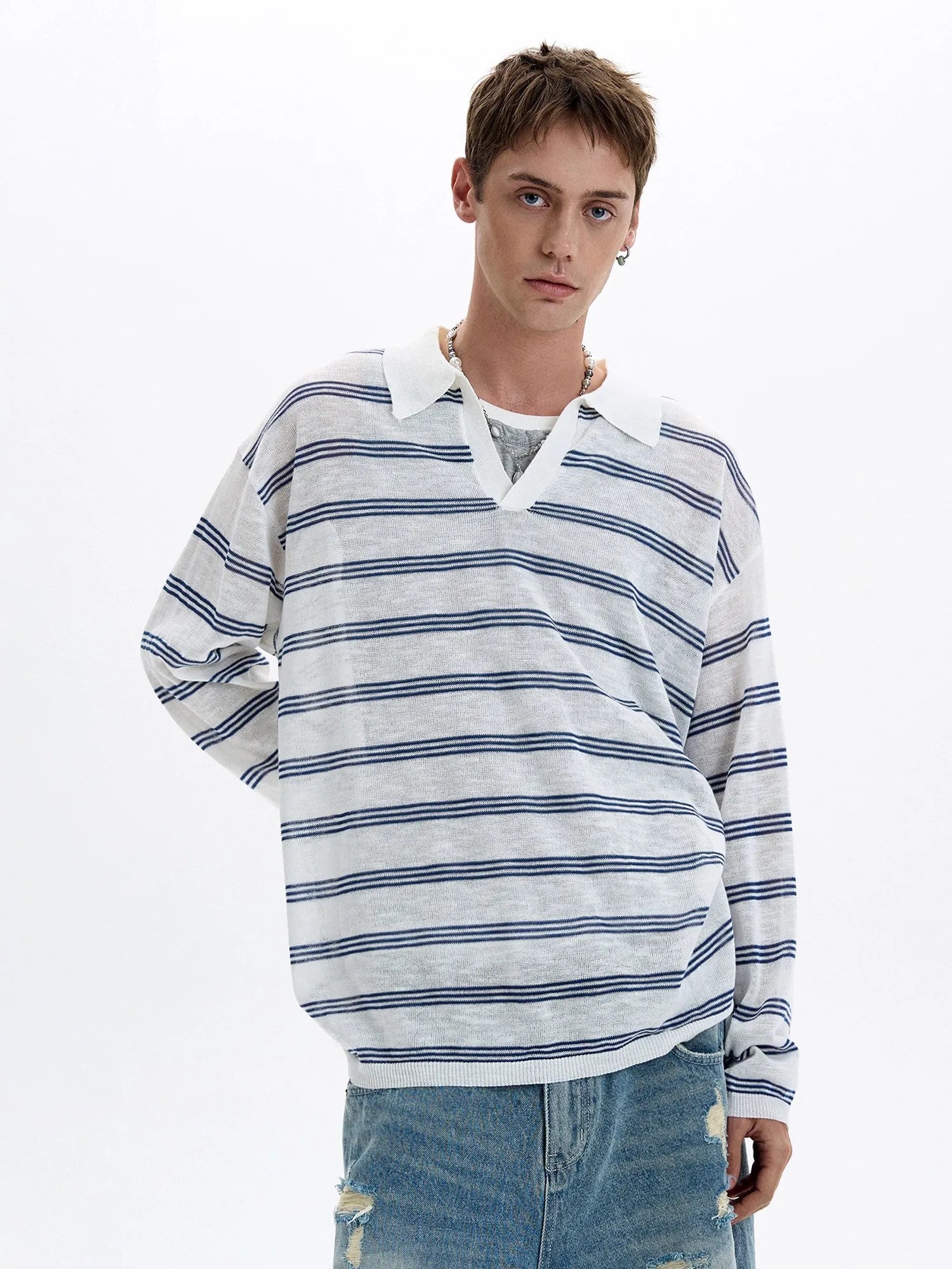 Threebooy American Retro Striped Contrasting Color V-neck Long-sleeved Polo Shirt Men Women Loose Casual Bottoming Trendy Tops Aesthetic