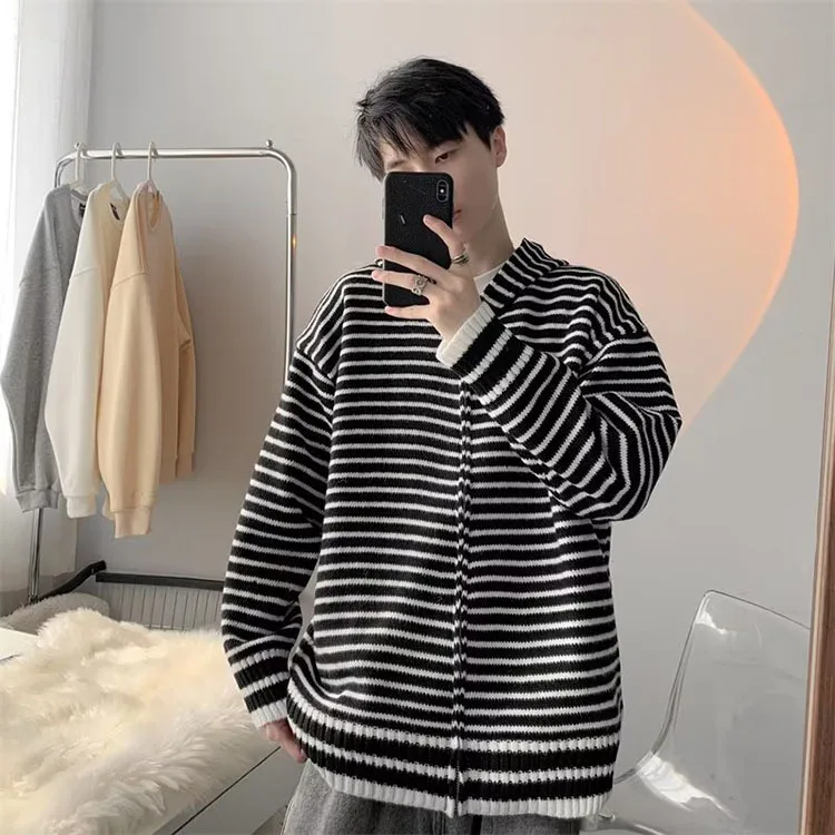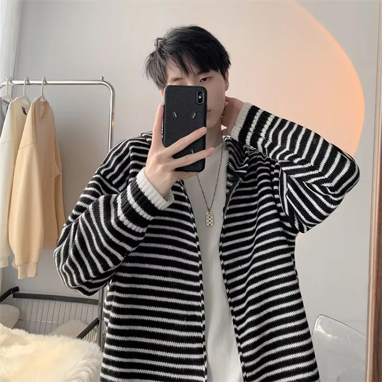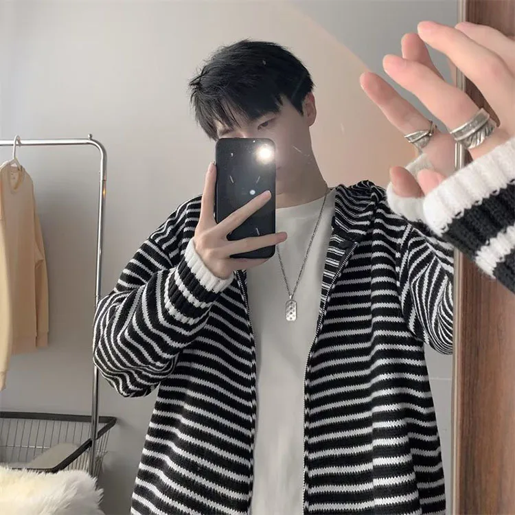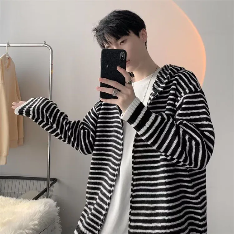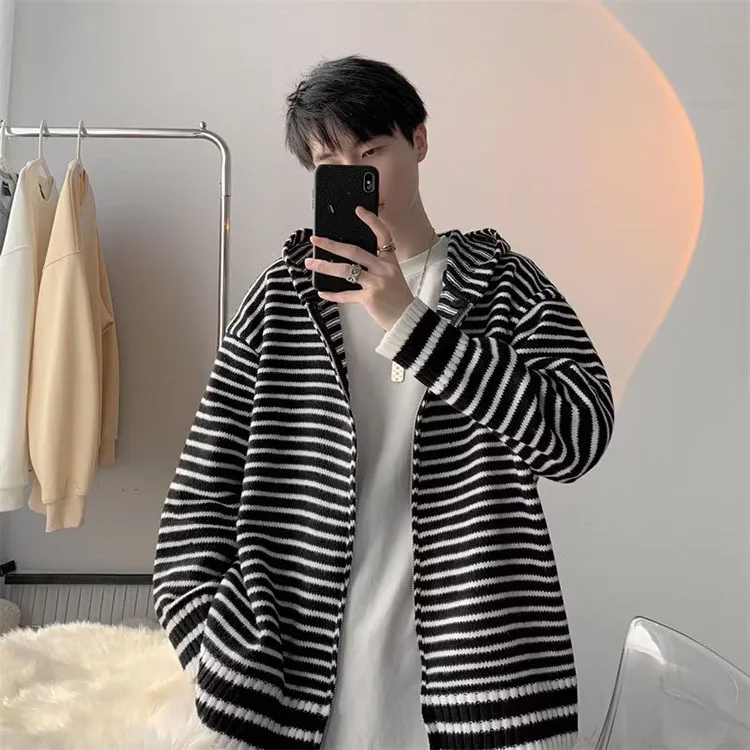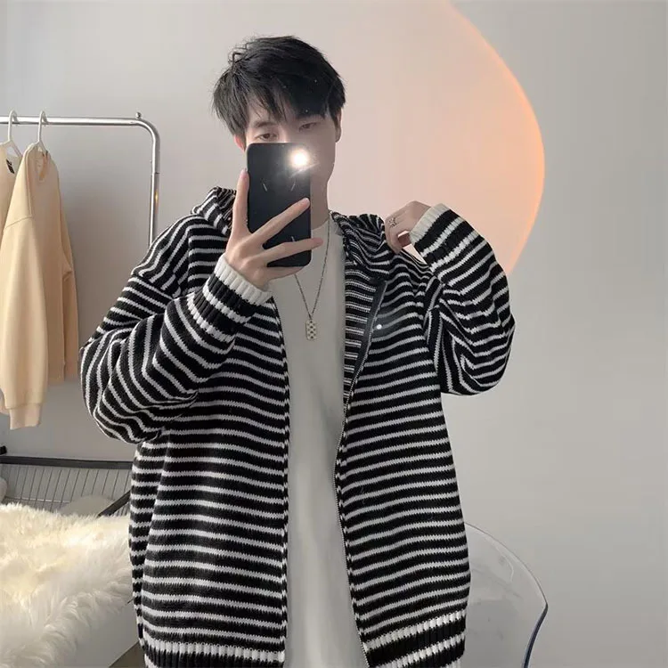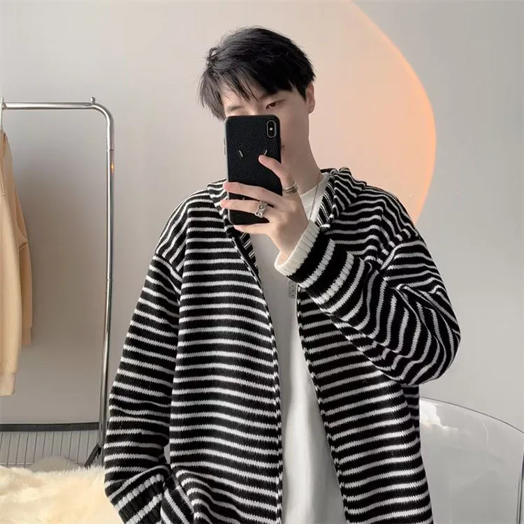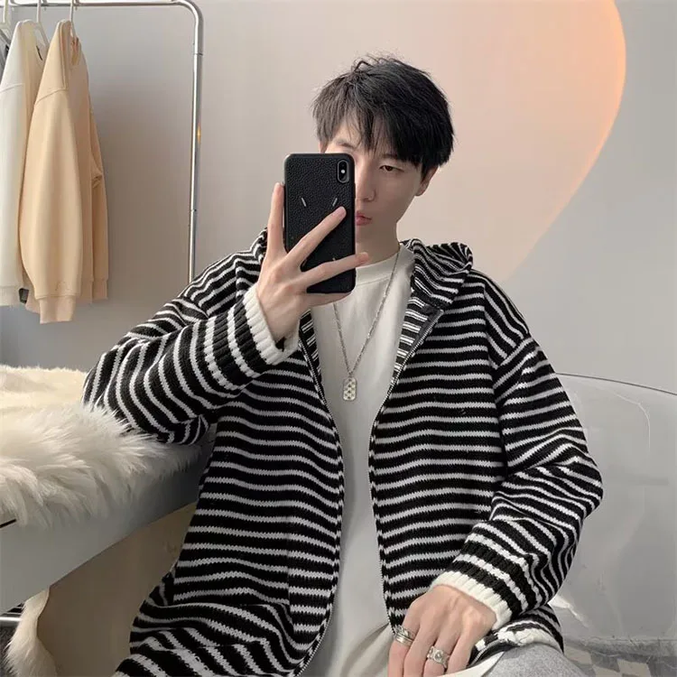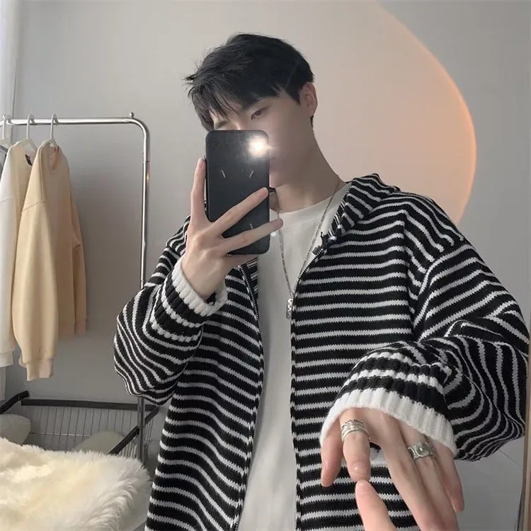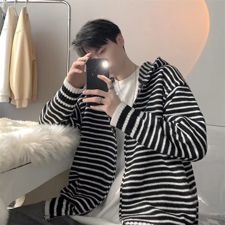 Threebooy Autumn Clothing Men's Light Luxury Knitted Hooded Cardigan Sweatercoat Korean Vintage Zipper Long Sleeve Hoodie Knitwear New