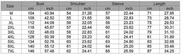 Size: M, L, XL, 2XL, 3XL, 4XL, 5XL, 6XL, 7XL