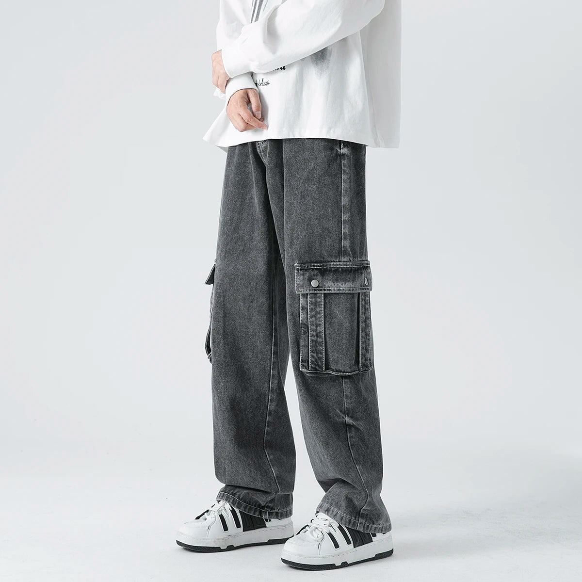 Threebooy Autumn New Men's Denim Wide-leg Pants American Baggy Cargo Jeans Ins Multi-pocket Vintage Streetwear Trousers Grey Blue