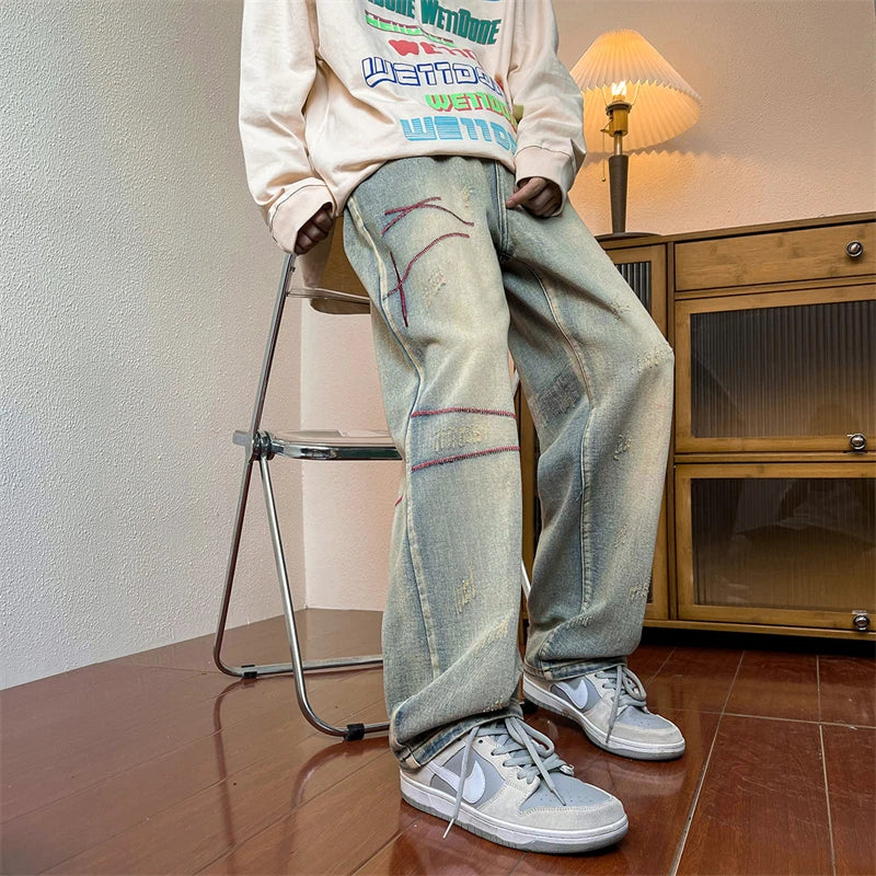 Threebooy Autumn New Style American Retro Straight Jeans for Men Embroidery Design Wide Leg Pants Korean Style Trendy Casual Trousers