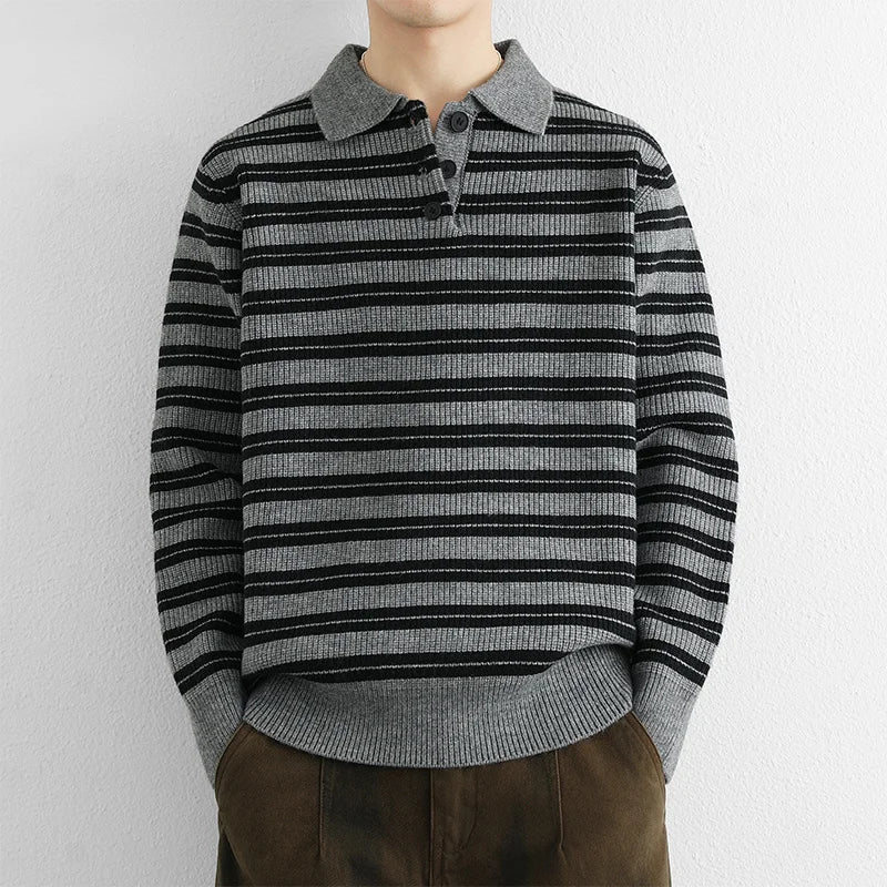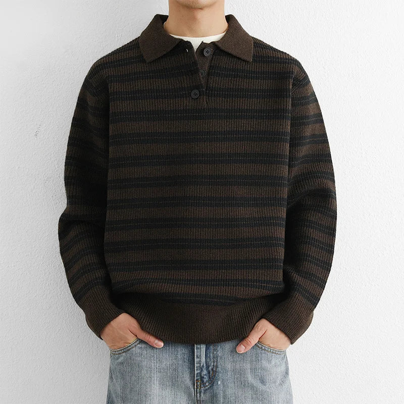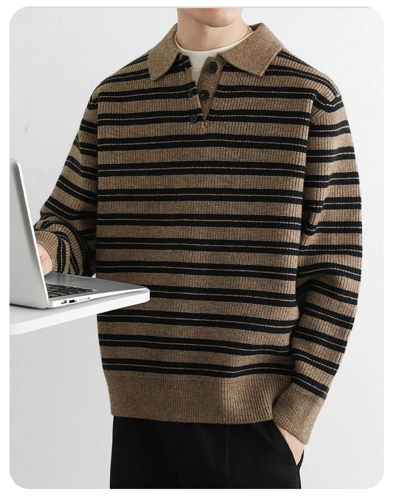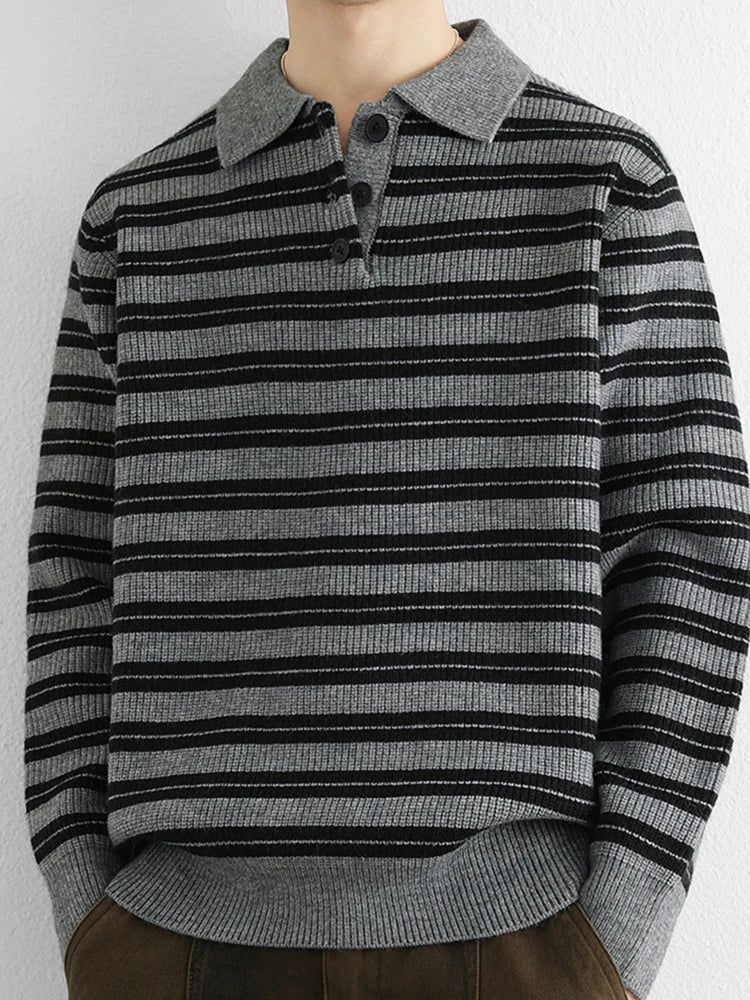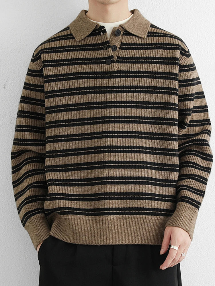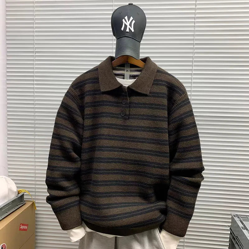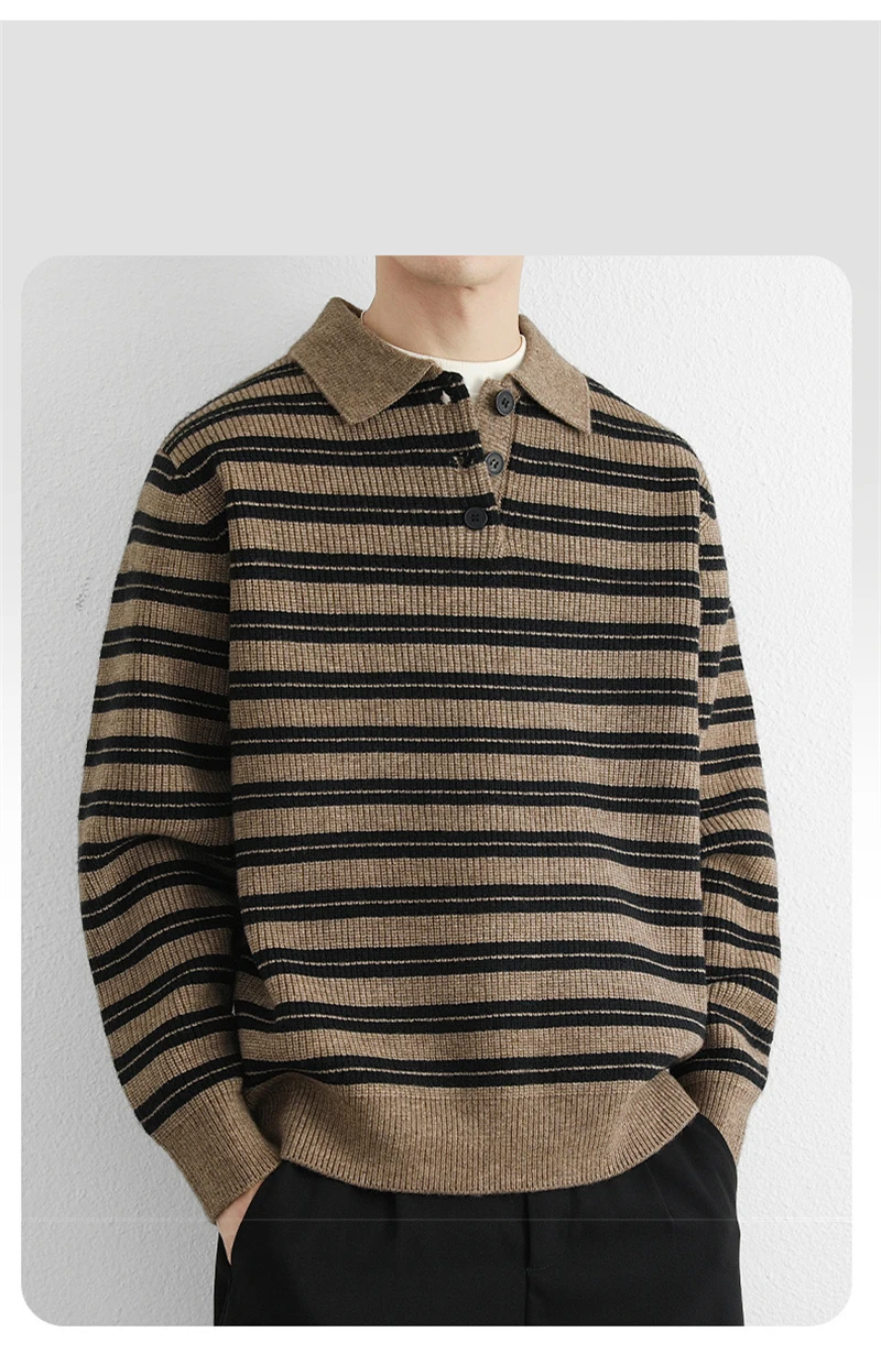 Threebooy Autumn Retro Colorblock Striped Polo Collar Knitwear For Men Korean Fashion Long Sleeve Knitted Pullovers Fleece Y2K Sweaters