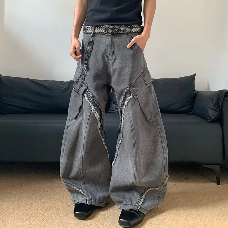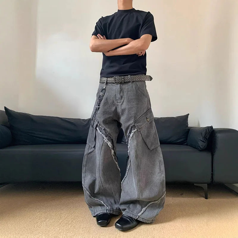 Threebooy Autumn/Winter Korean Vintage Splicing Hairy Zipper Micro Horn Jeans Men's Loose Straight Leg Pants Fashion High Street Jeans