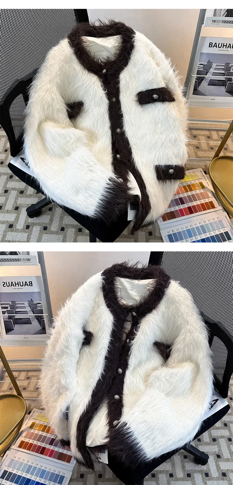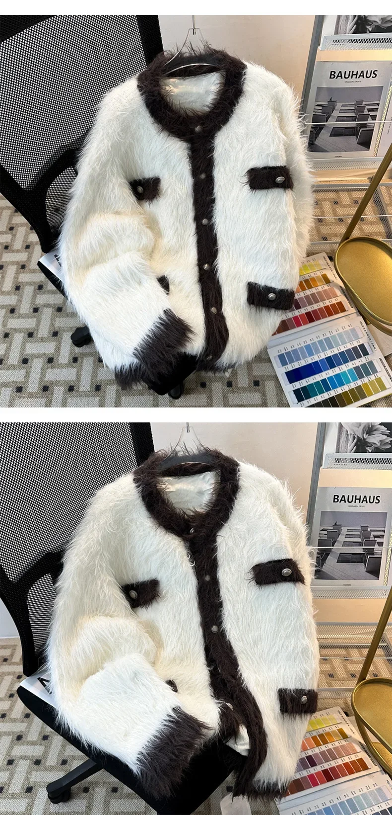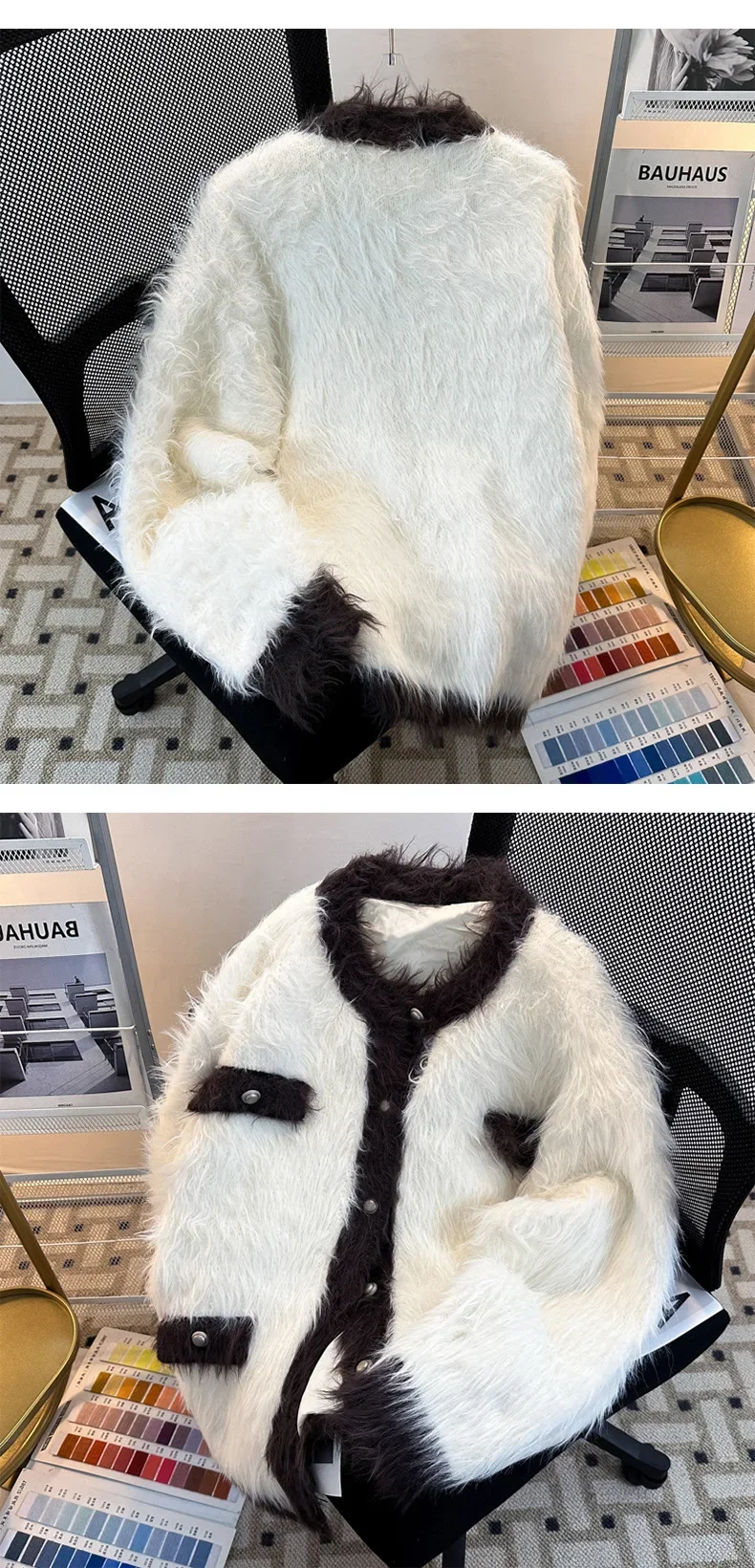 Threebooy Autumn/Winter New Men's Mink Sweater Jacket Sensibility Nichetweed Style Color Blocking Knitted Cardigan Thick
