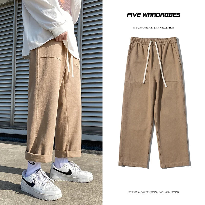 Threebooy Beige/Khaki/Black Casual Pants Men Fashion Cotton Straight Pants Men Streetwear Loose Hip Hop Wide Leg Pants Mens Trousers S-2XL