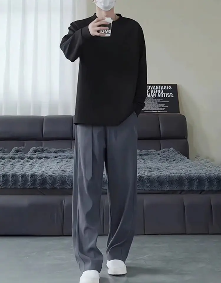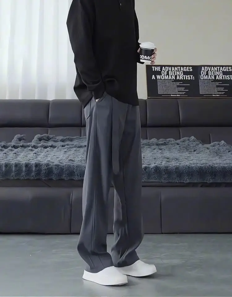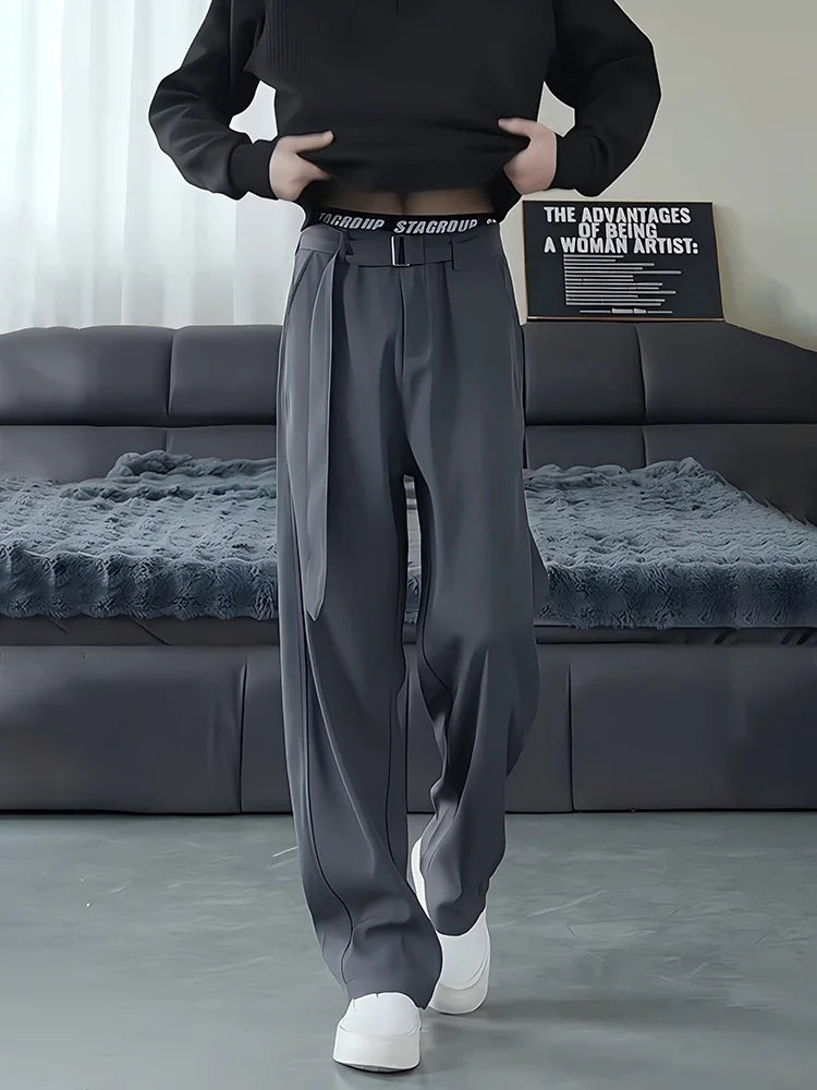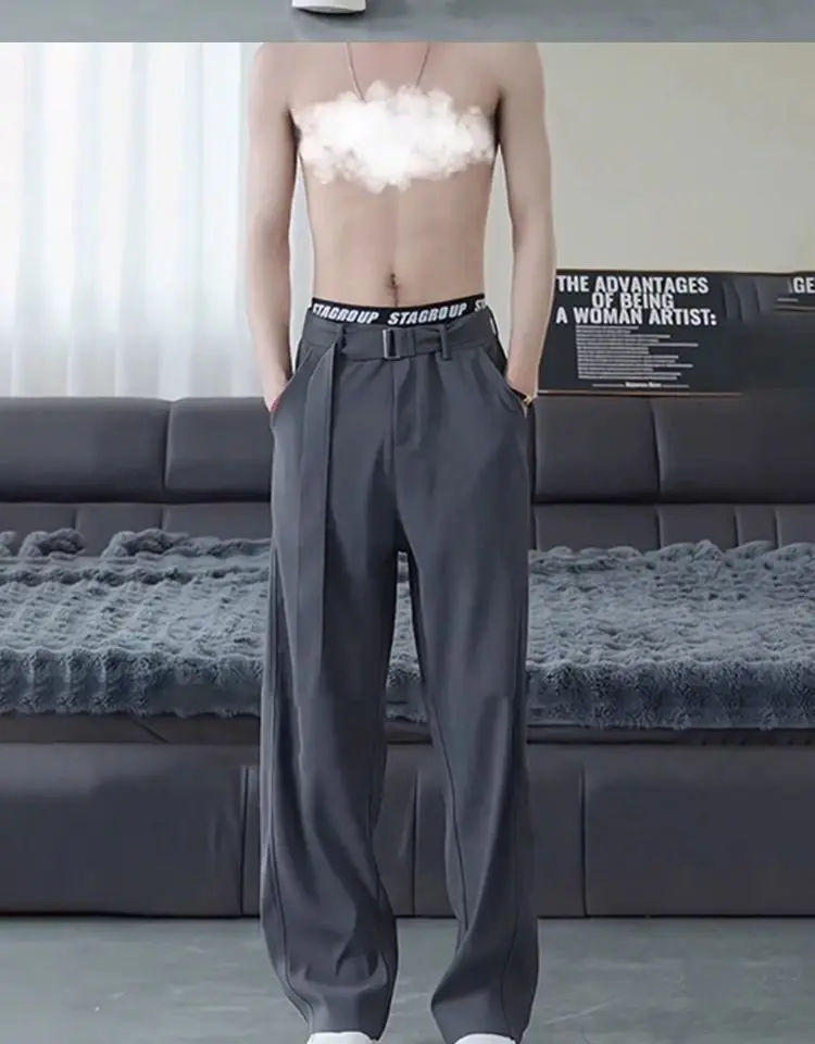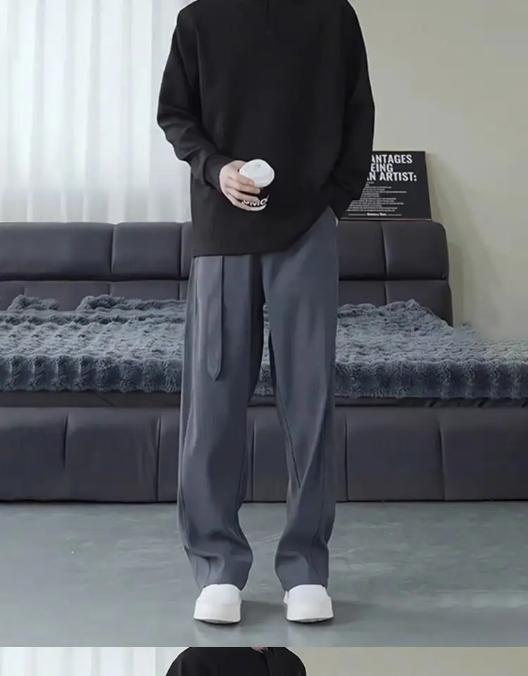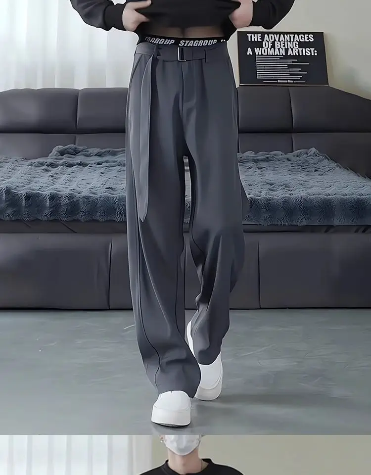 Threebooy Belt Drape Trousers Men's High-end Scimitar Loose Wide-leg Straight Suit Pants