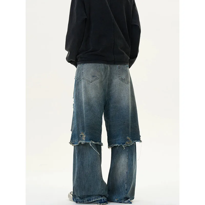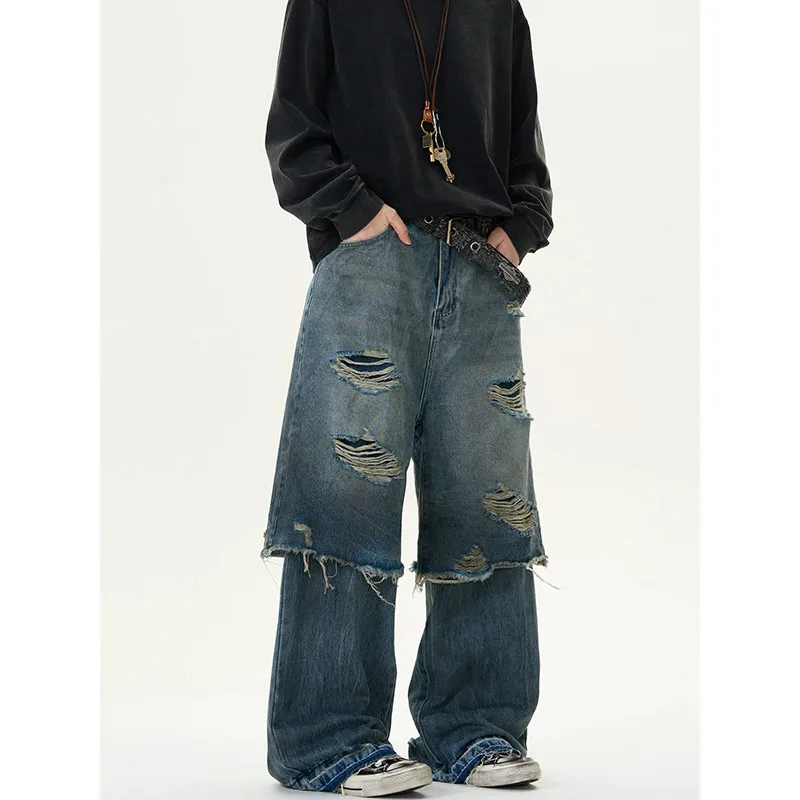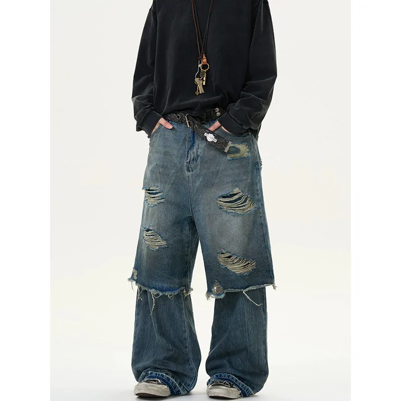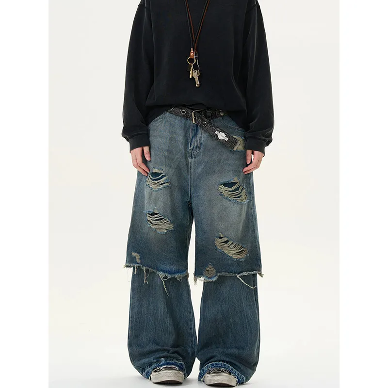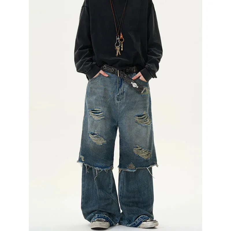 Threebooy Blue Vintage Ripped Harajuku Loose Fit Jeans Y2K Hollow Out Wide Leg Trashy Pants Women's Baggy Tassel Street Denim Trouser