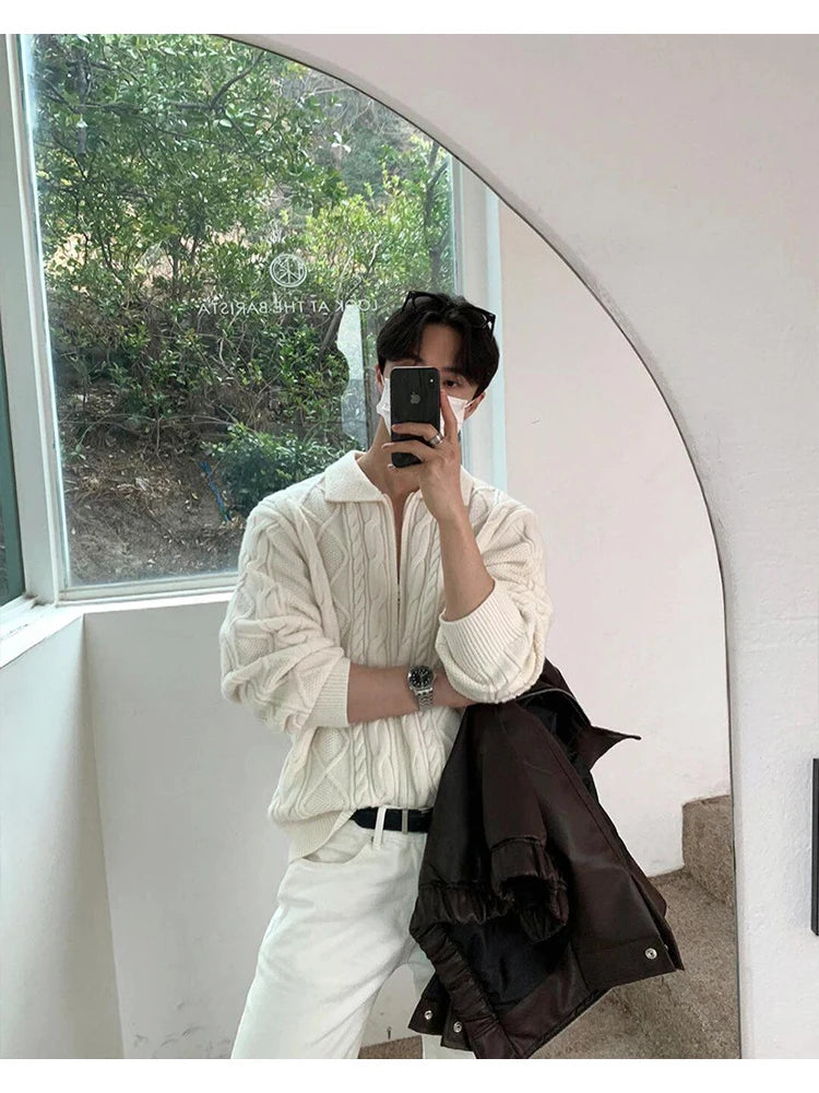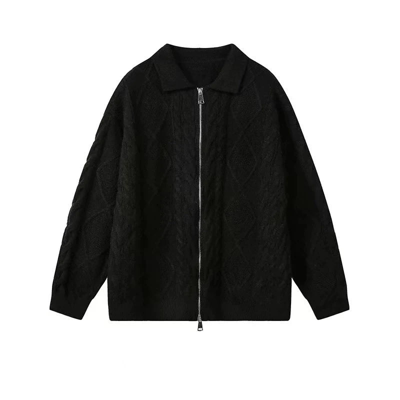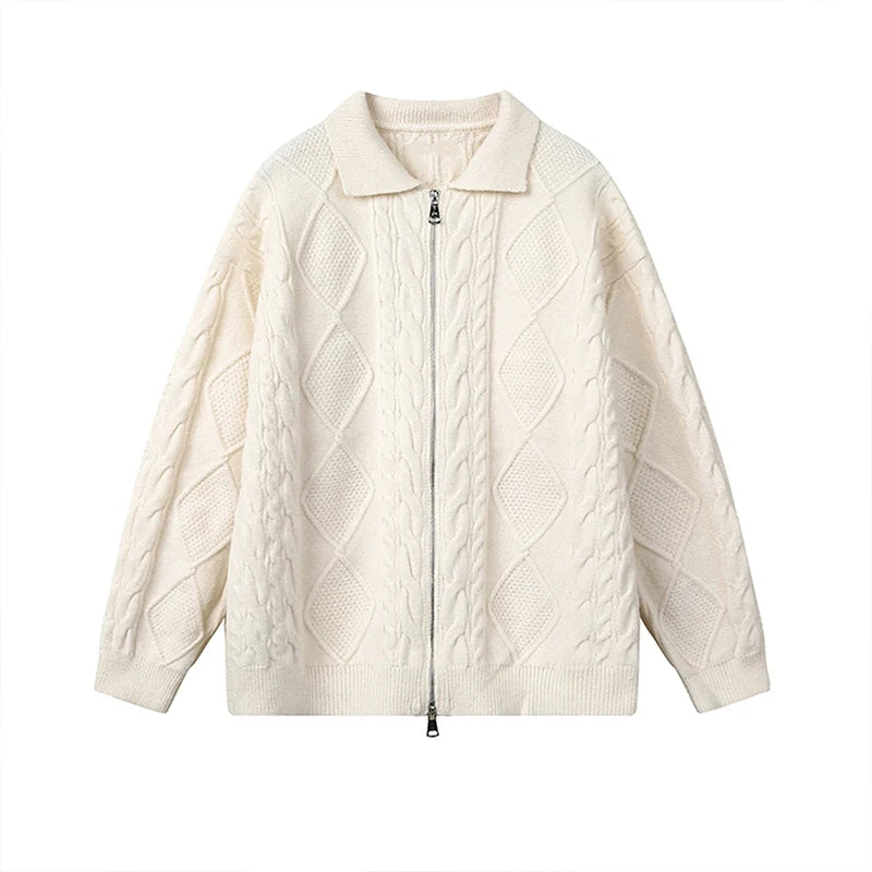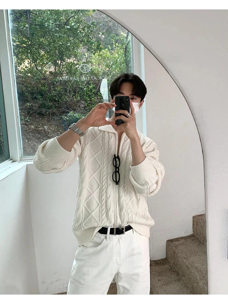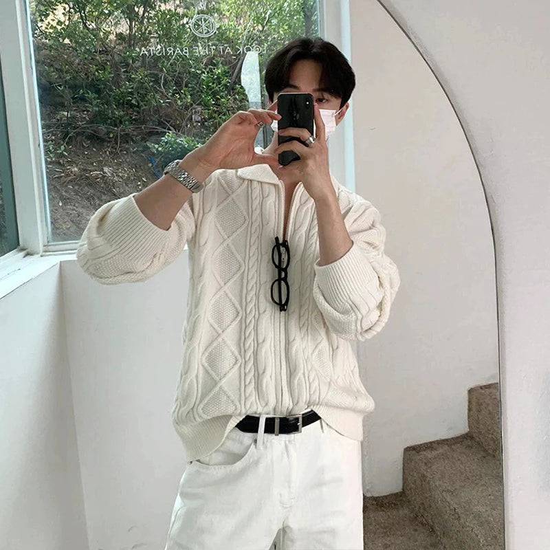 Threebooy Diamond Graphics Textured Twist Zipper Men Cardigan Light Luxury Lapel Long Sleeve Sweater Coats Premium Quality Knitted Jackets