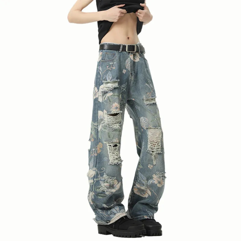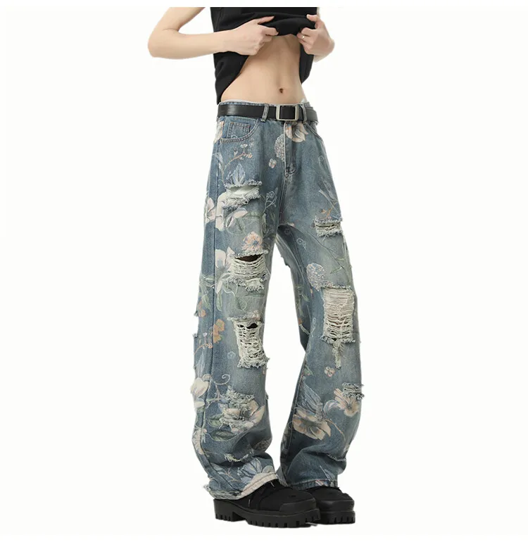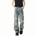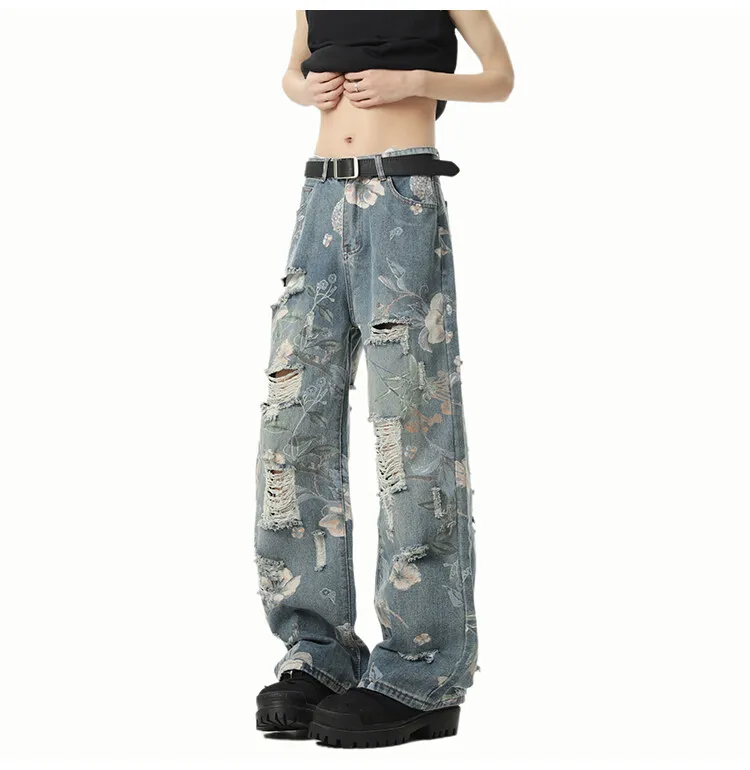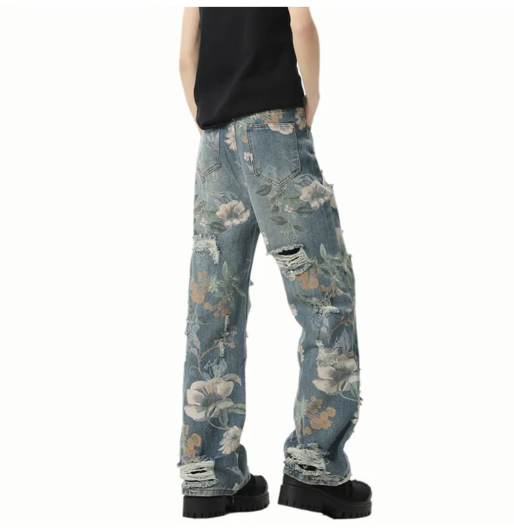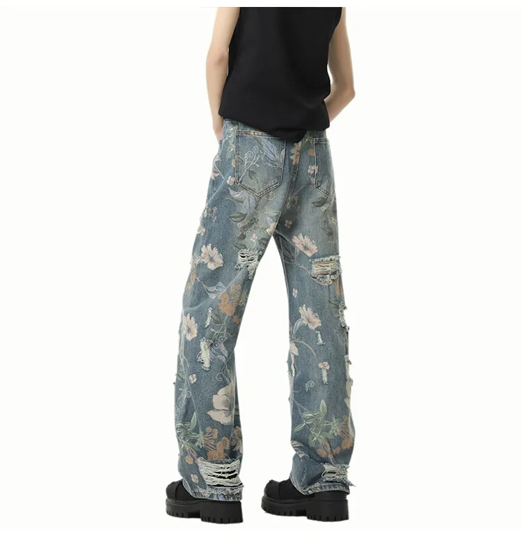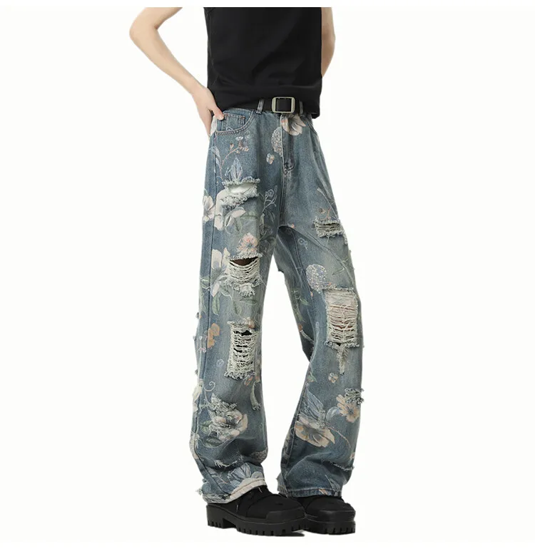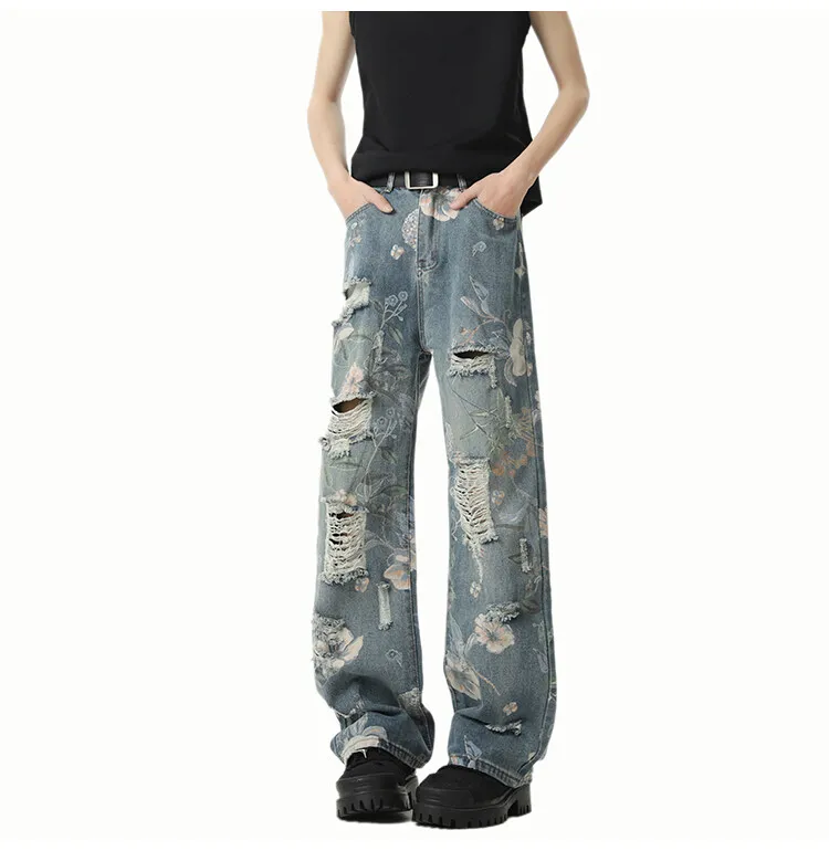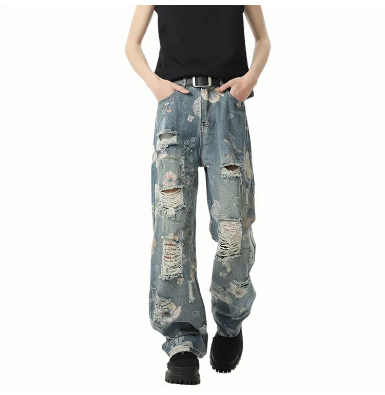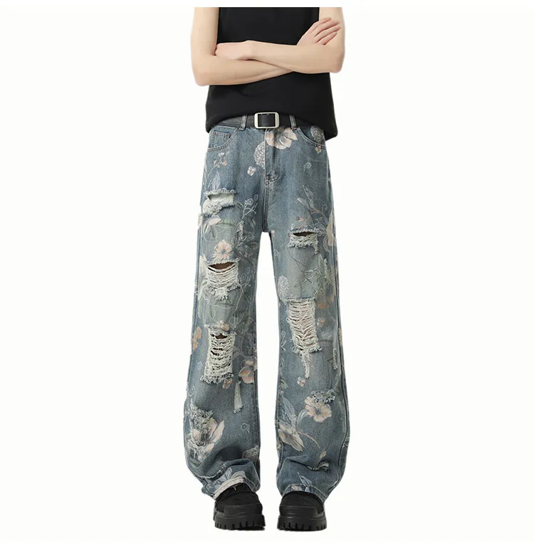 Threebooy Distressed Straight Leg Jeans Ripped Hole Design Urban Streetwear Fashion Men Denim Pants Trendy Casual Edgy Hiphop Style
