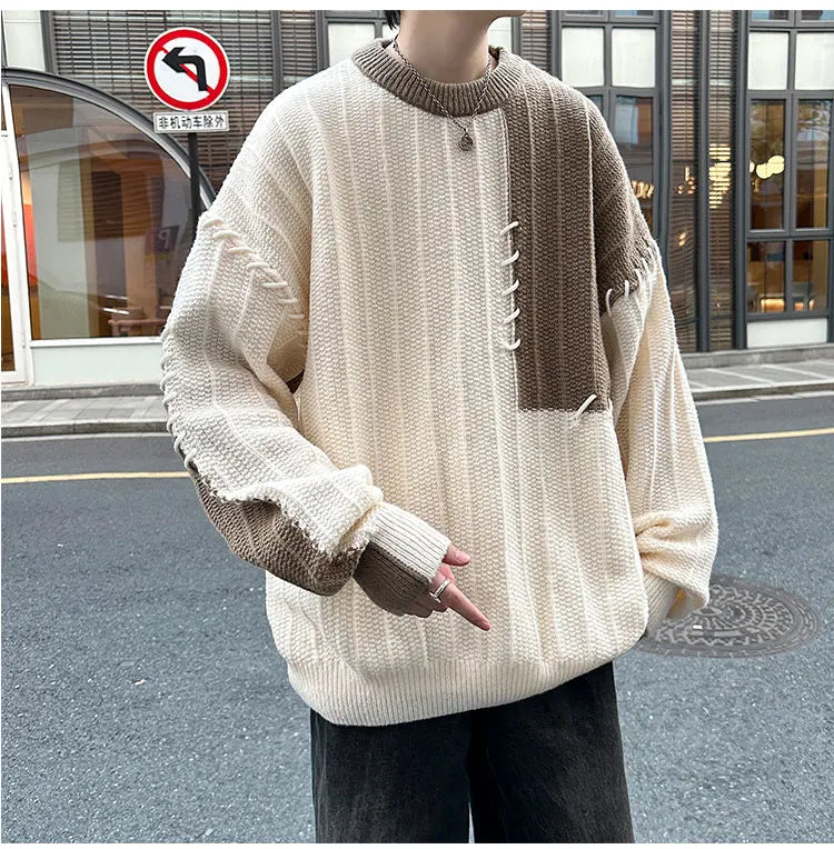 Threebooy Fashion Autumn Winter Men's Oversize Loose Casual Jumpers Male Round Neck Sweater Tops Men Patchwork Knitted Tops S846