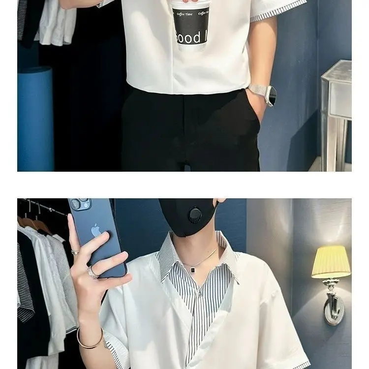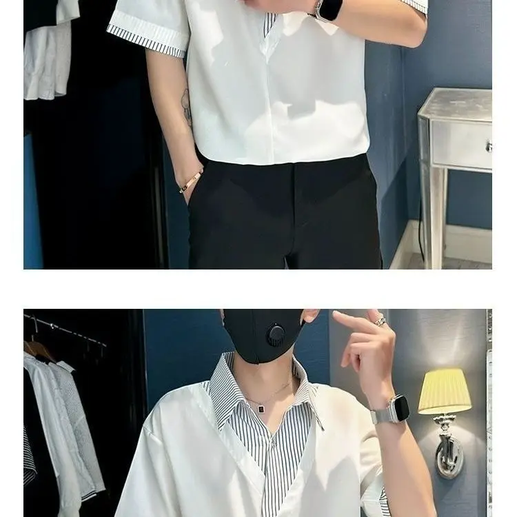 Threebooy Fashion Patchwork Striped Short Sleeve Shirt Men Summer Trendy Casual