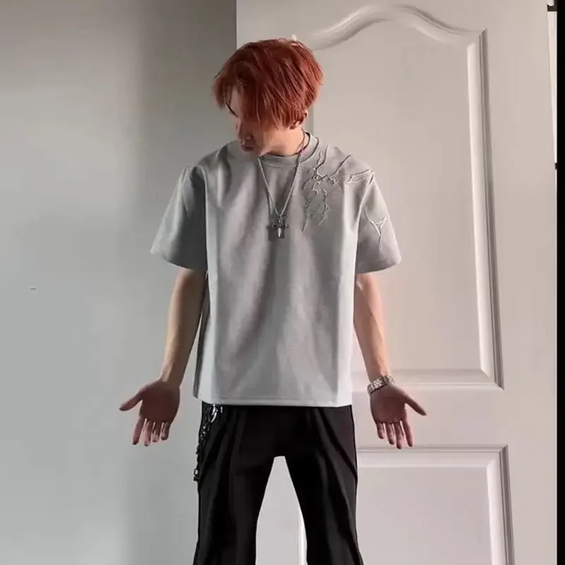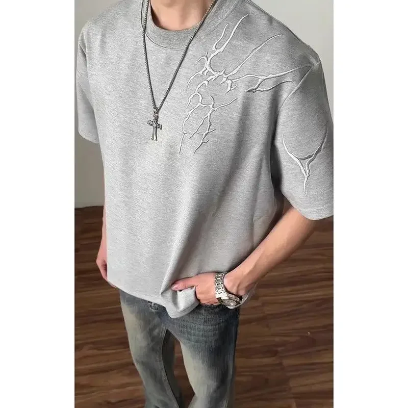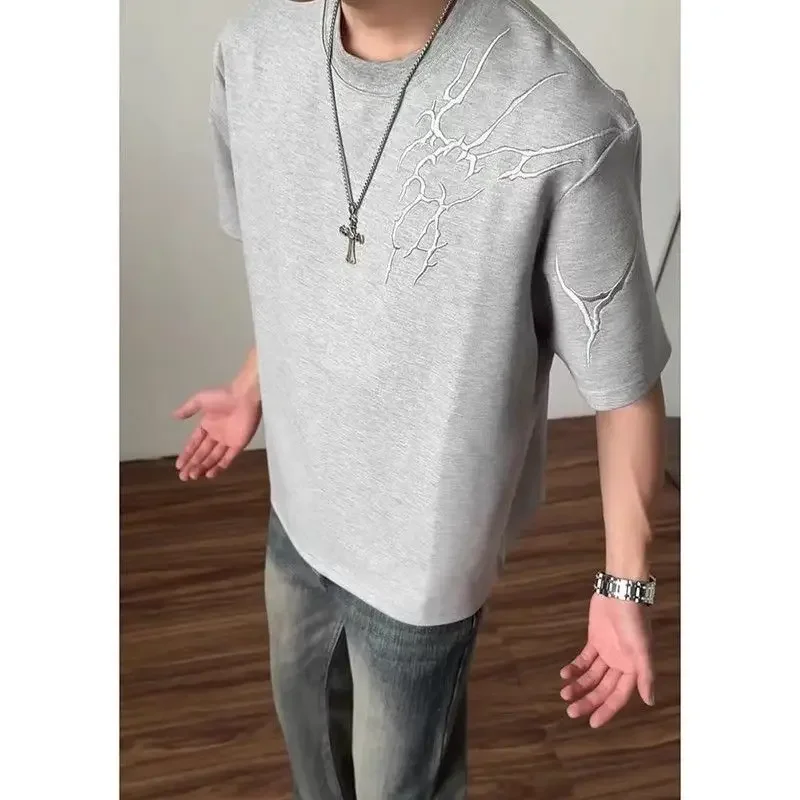 Threebooy Flower Grey Lightning Embroidered Short-sleeved Men's 2025 Summer Versatile Shoulder T-shirt Five-point Sleeve T-shirt Bottoming