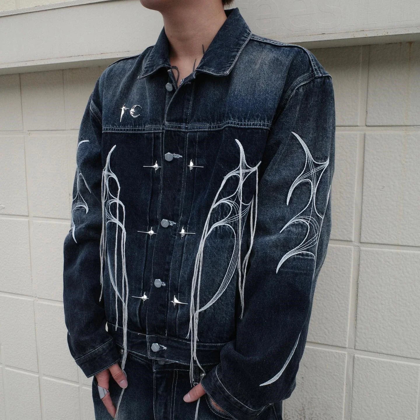 Threebooy Harajuku Wing Embroidery String Tassel Black Jeans Jacket for Men and Women Lapel Washed Casual Bomber Denim Coat Oversized