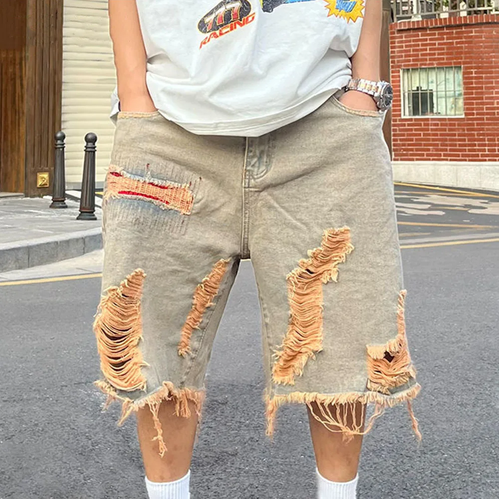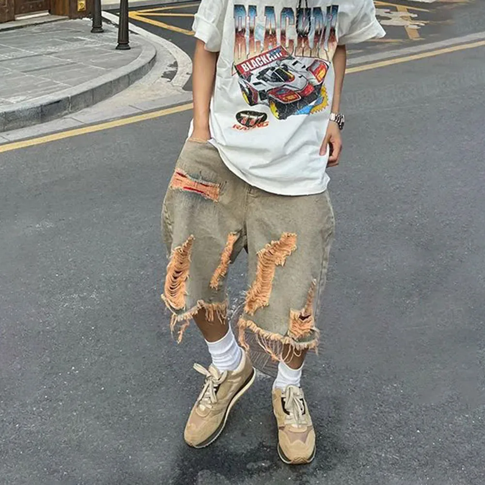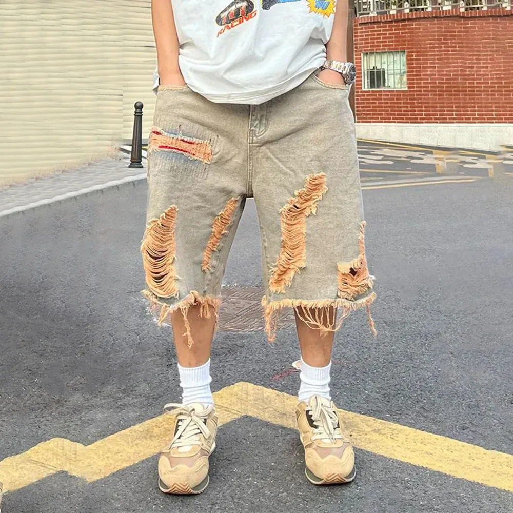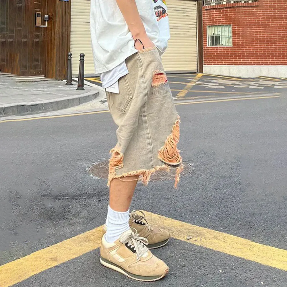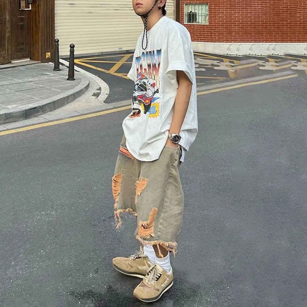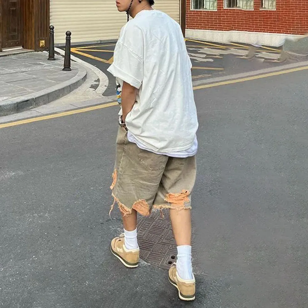 Threebooy High Street Washed Distressed Raw Hem Ripped Denim Shorts Retro Men Clothing Summer Y2k Straight Loose Hip Hop Denim Shorts