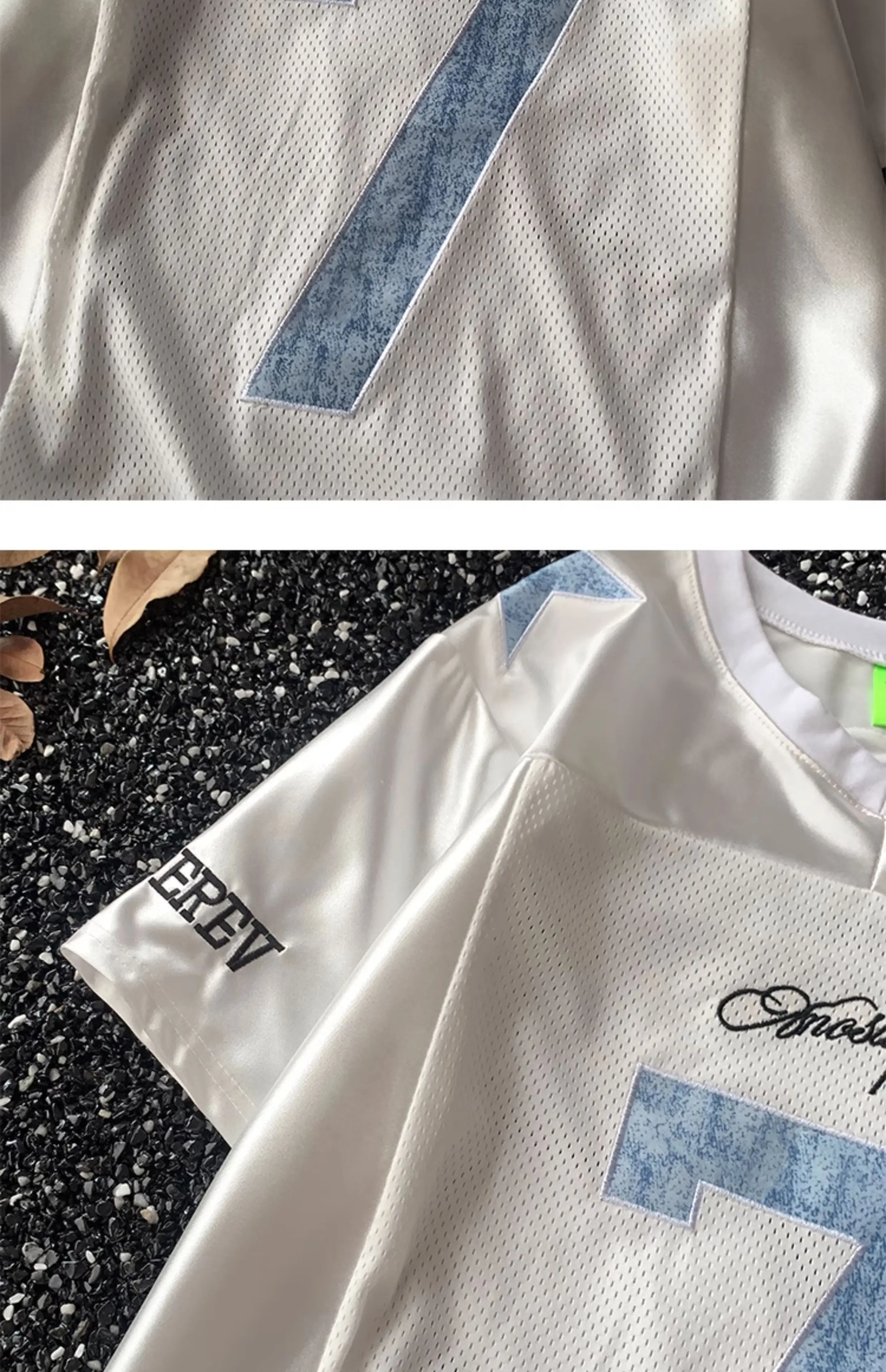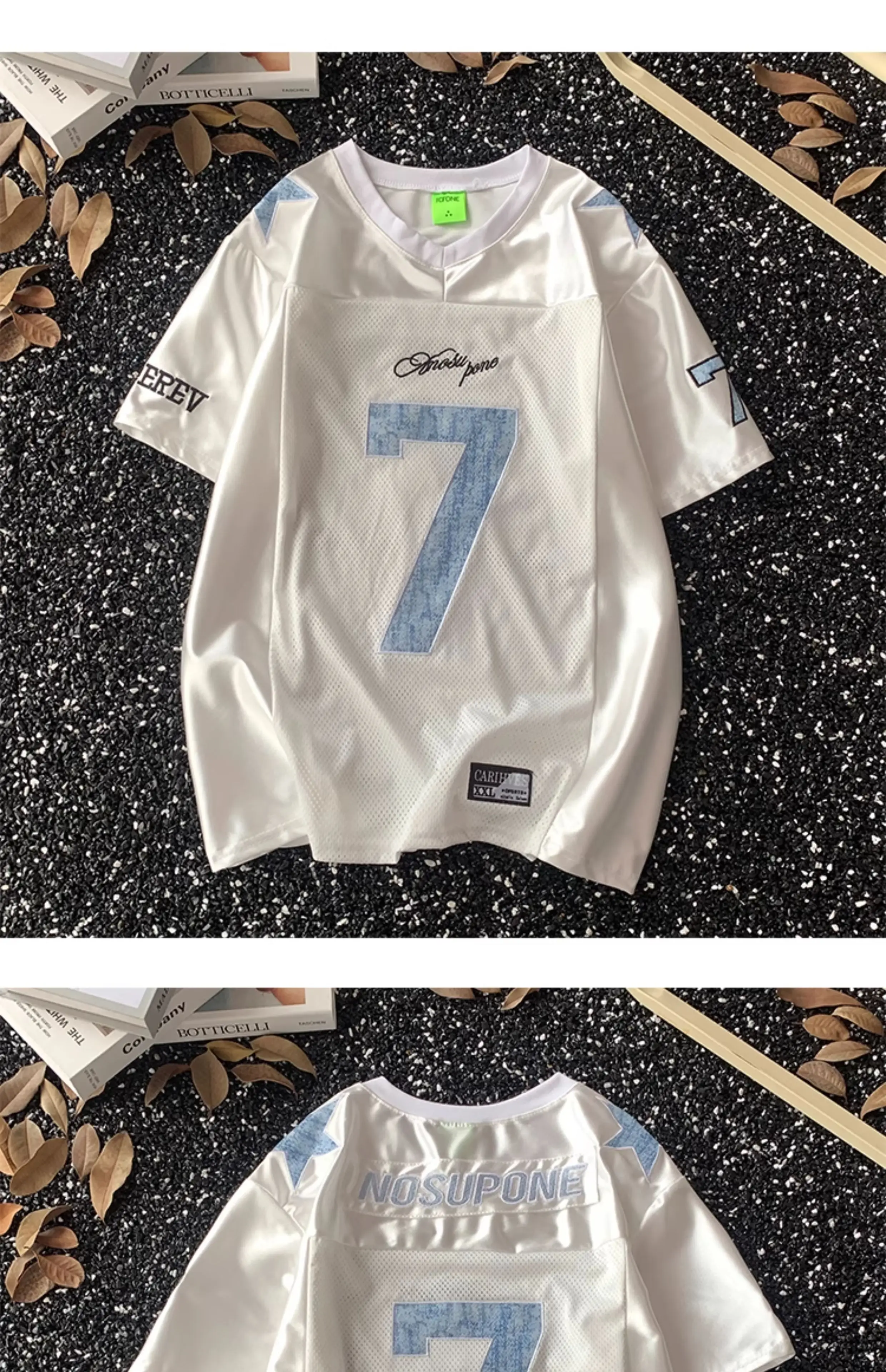 Threebooy Hip-hop American Retro Top V-neck Spliced letter Printed Short-sleeved Shirt Summer Casual Sports Breathable Jersey Men Women
