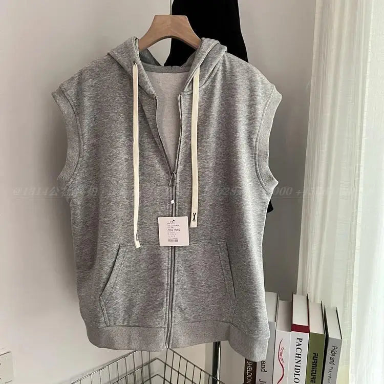 Threebooy Hooded Vest Jacket American Casual Sports Vest Men Women Korean Streetwear 2025 Trendy Loose Sleeveless Zipper Cardigan