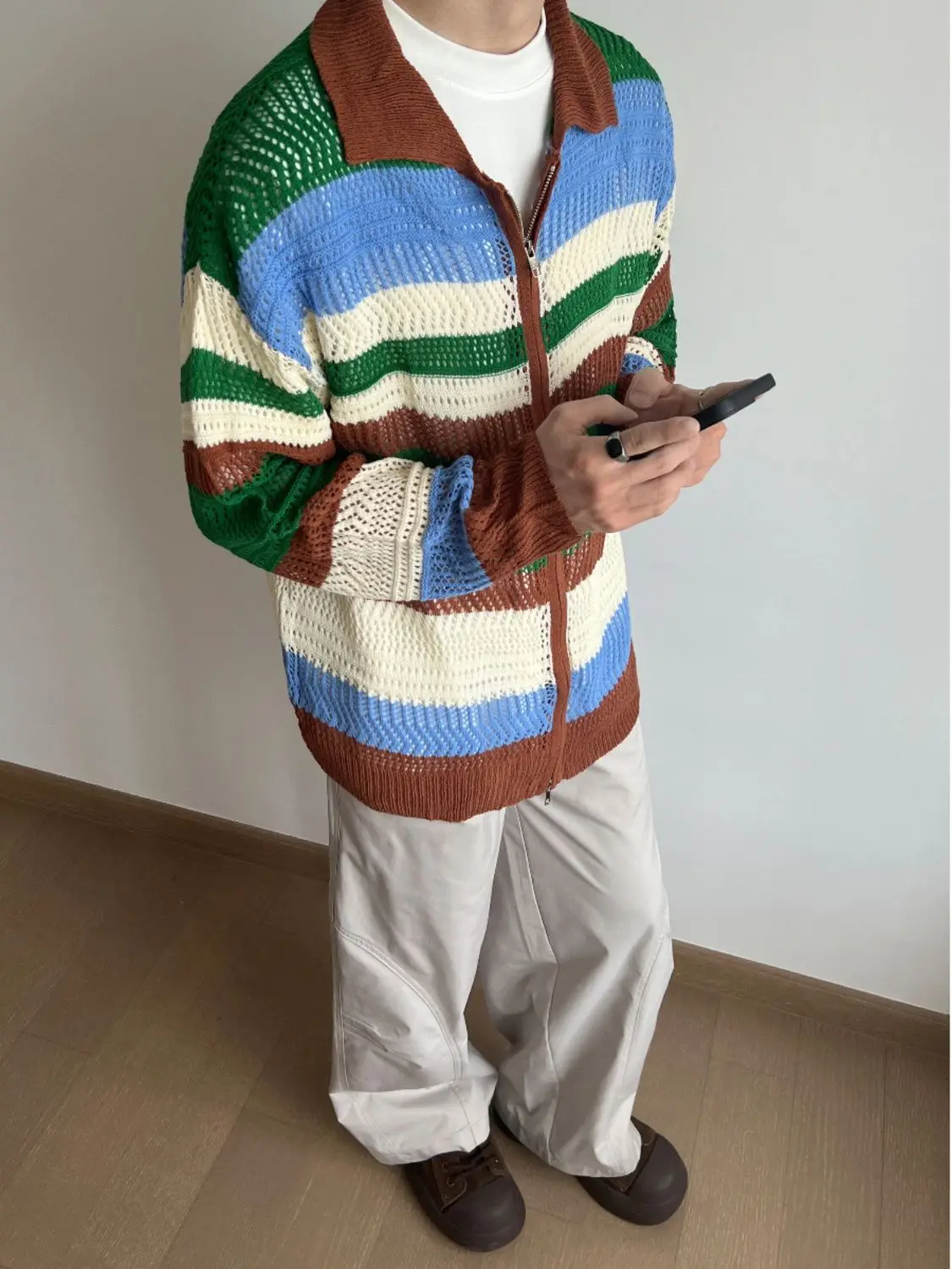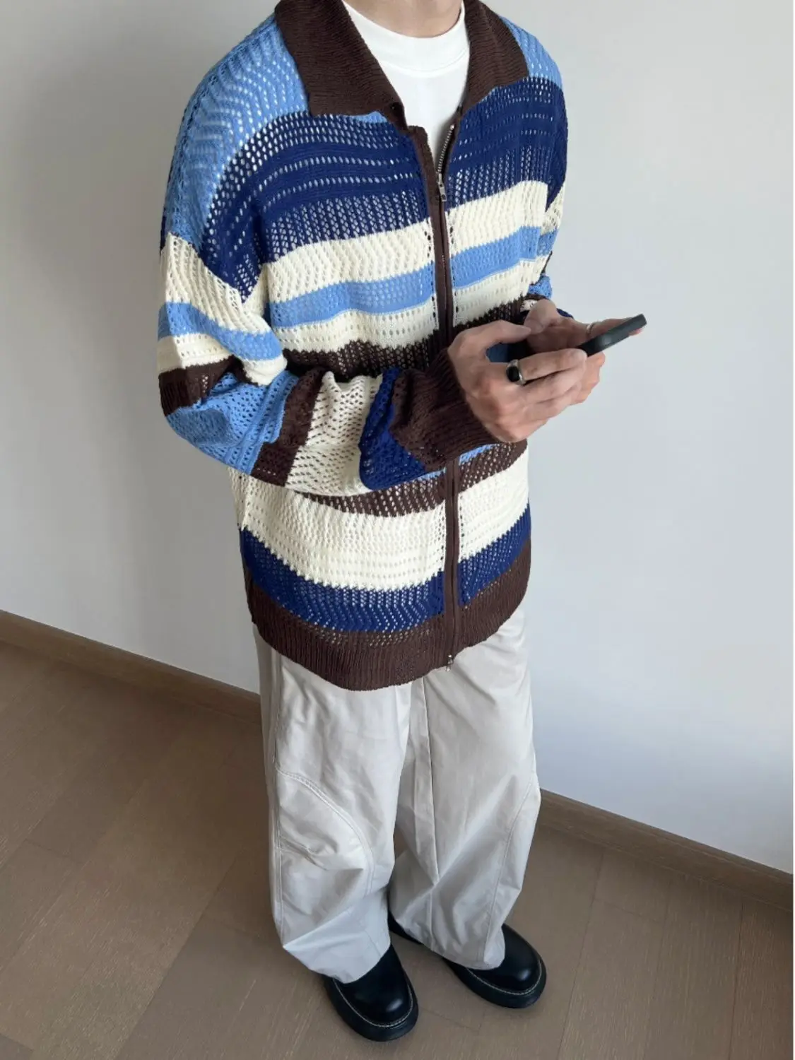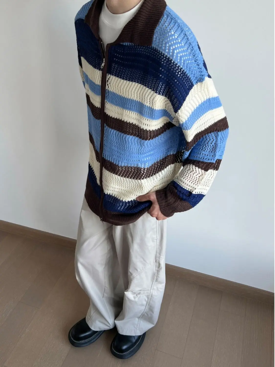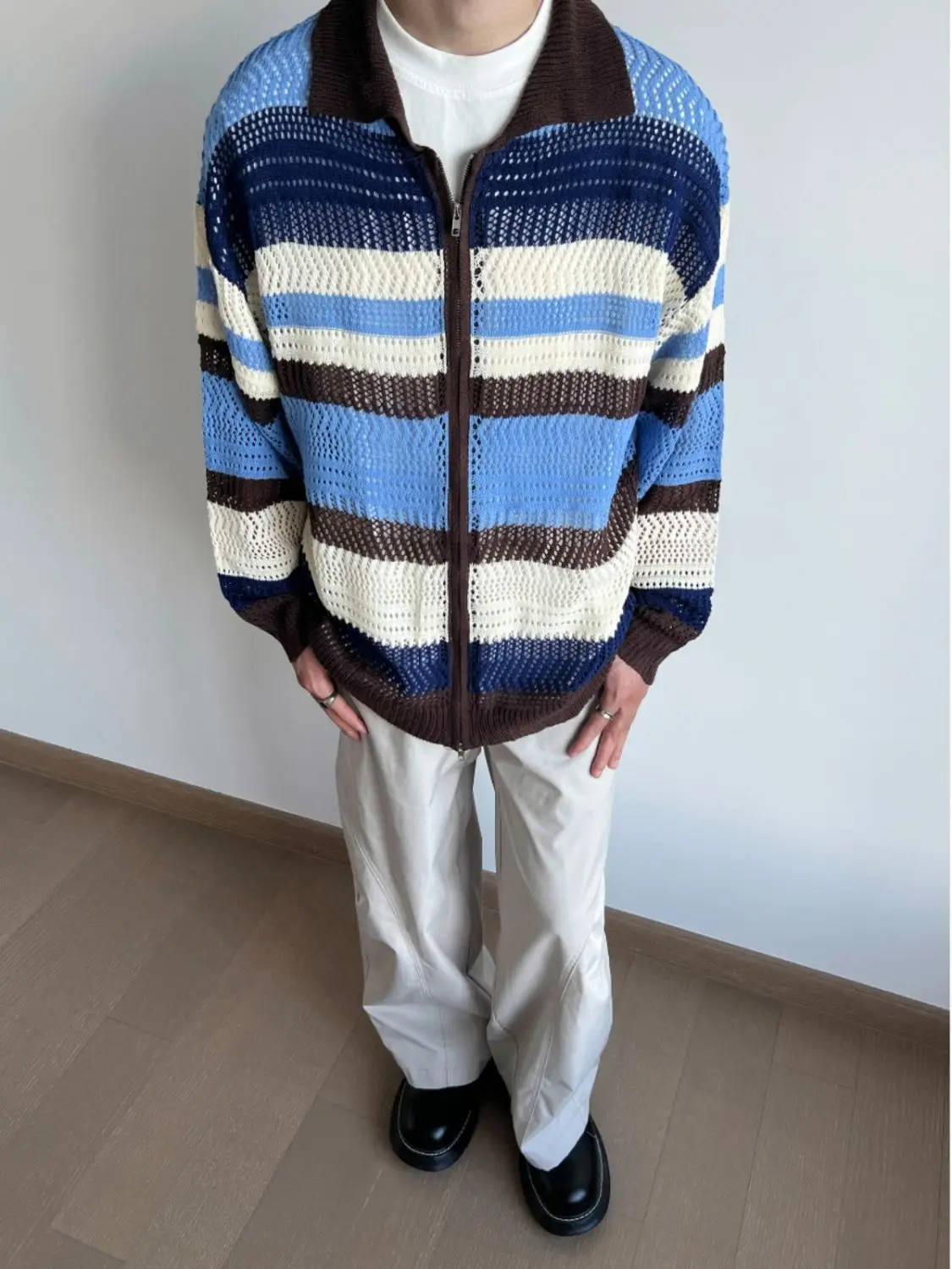 Threebooy Japanese retro striped hollow color-blocked knitted cardigan jacket men's loose contrasting sweater