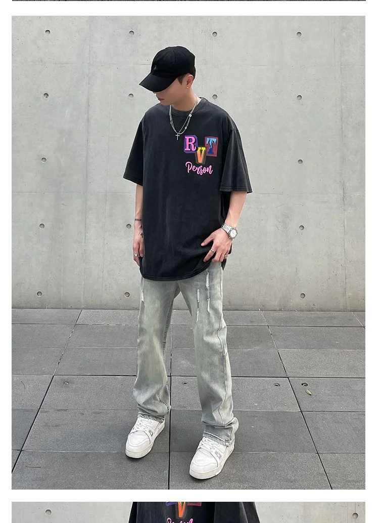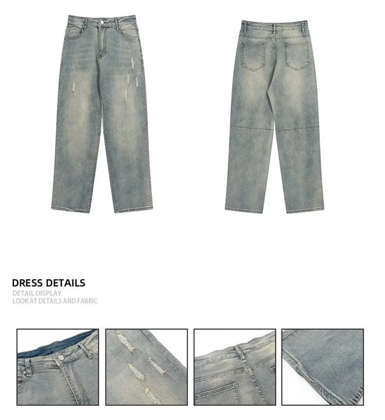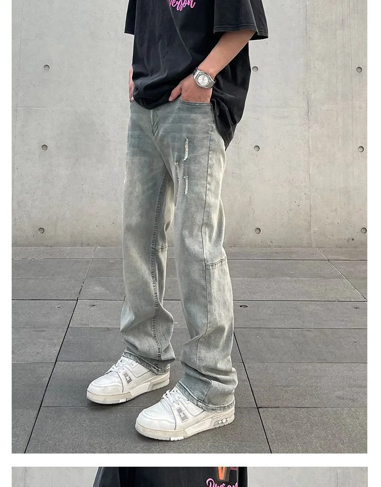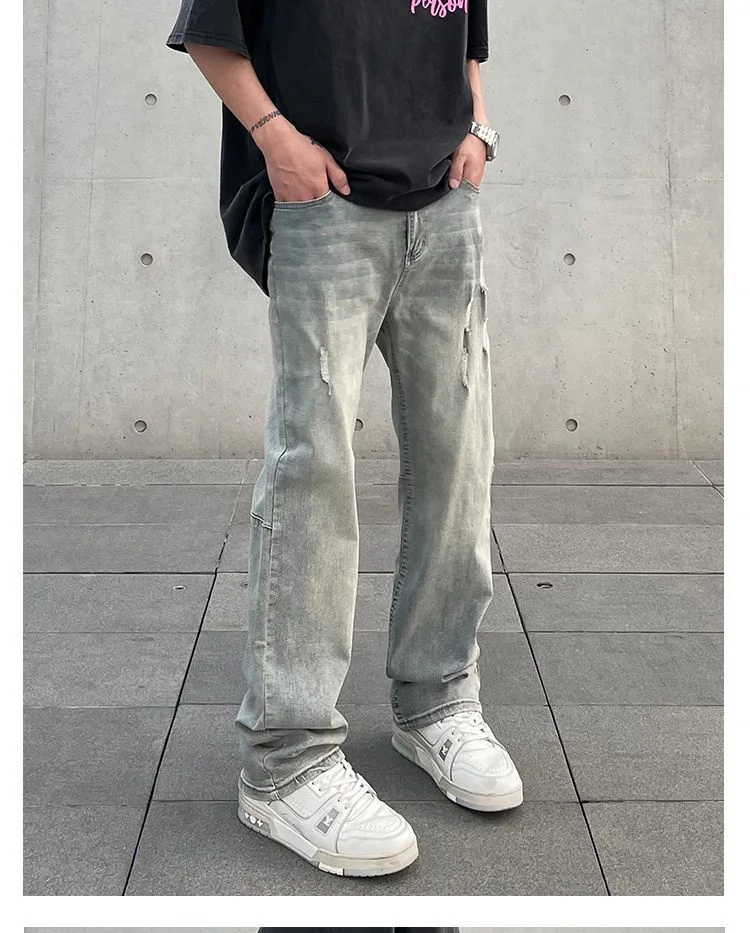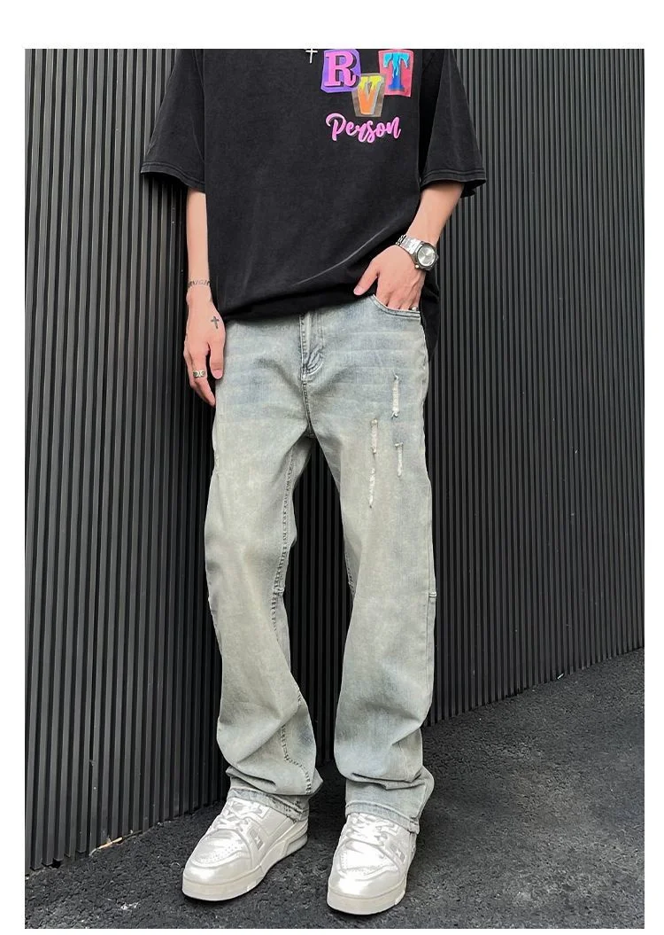 Threebooy Jeans Men's High Street Ripped Straight Trousers Button Pocket Washed Solid Color Loose Trousers