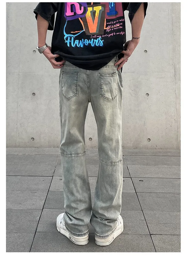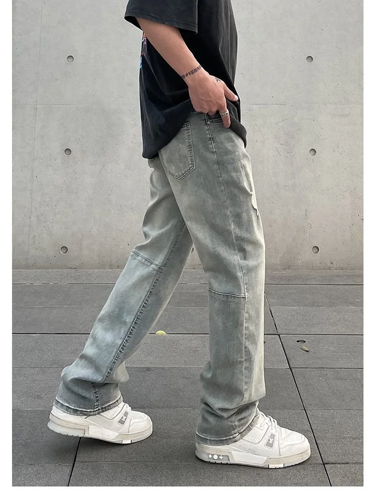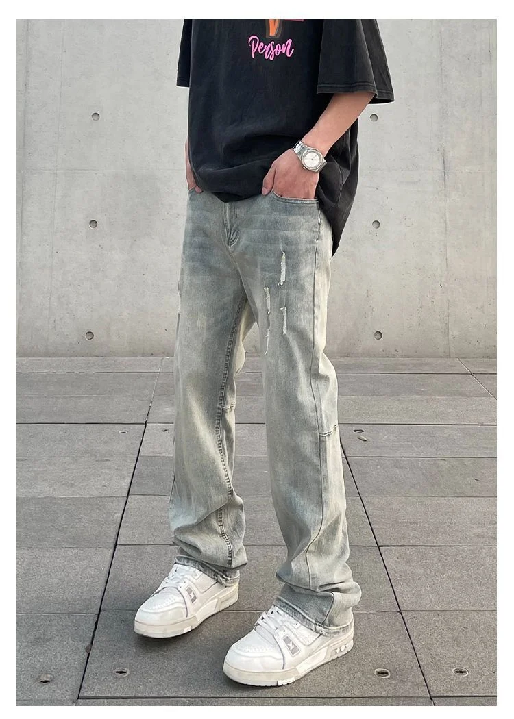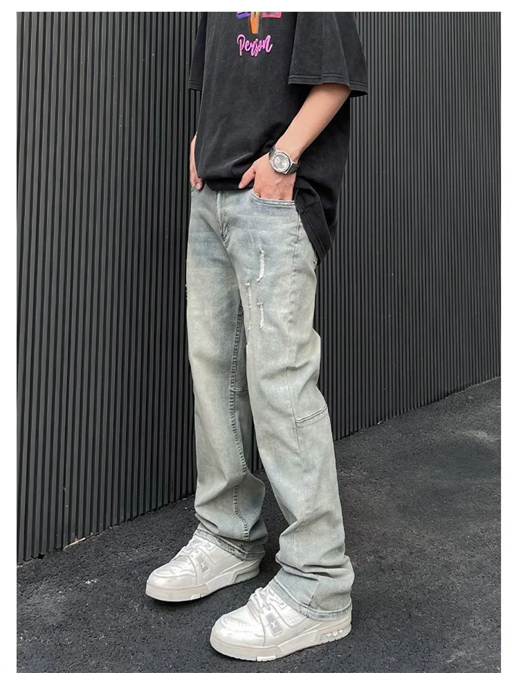 Threebooy Jeans Men's High Street Ripped Straight Trousers Button Pocket Washed Solid Color Loose Trousers