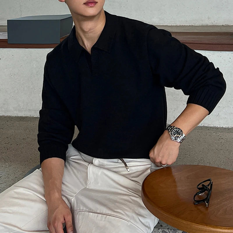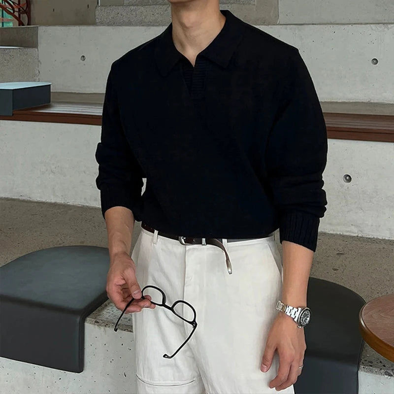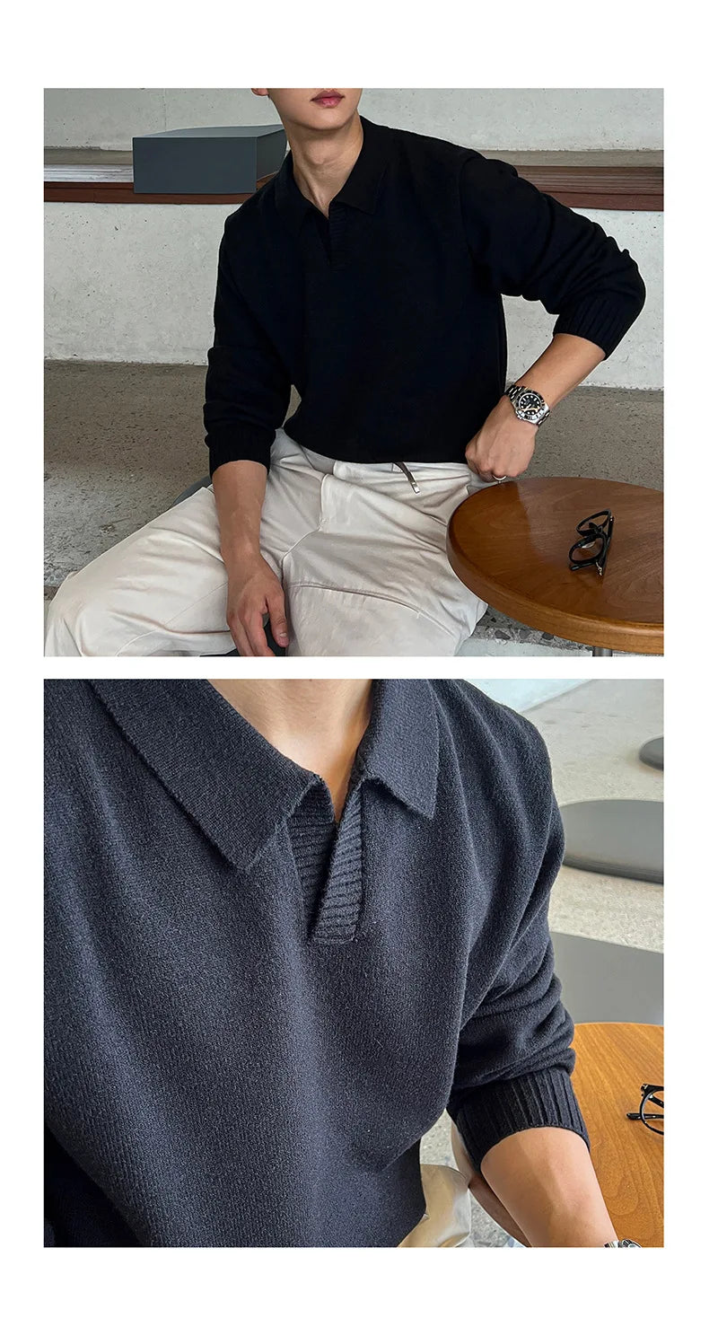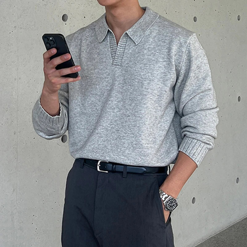 Threebooy Korean Luxury Business Men Polo Sweater Loose V Neck Knit Solid Color Pullover Casual Premium Quality Long Sleeve Knitwear M-3XL