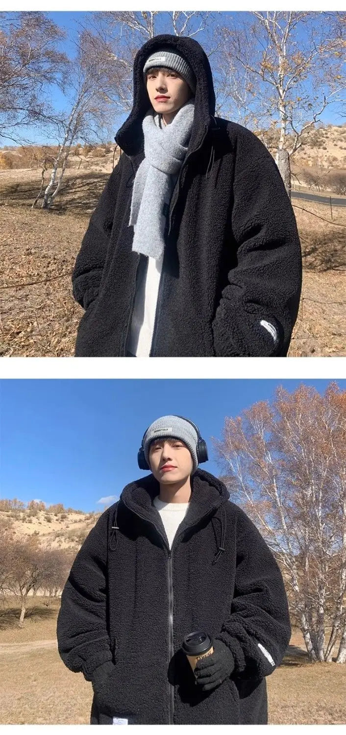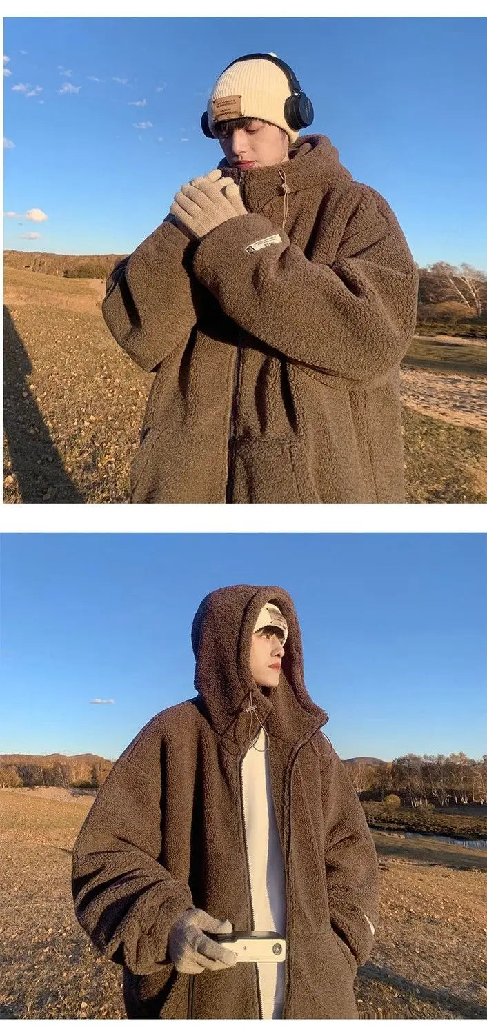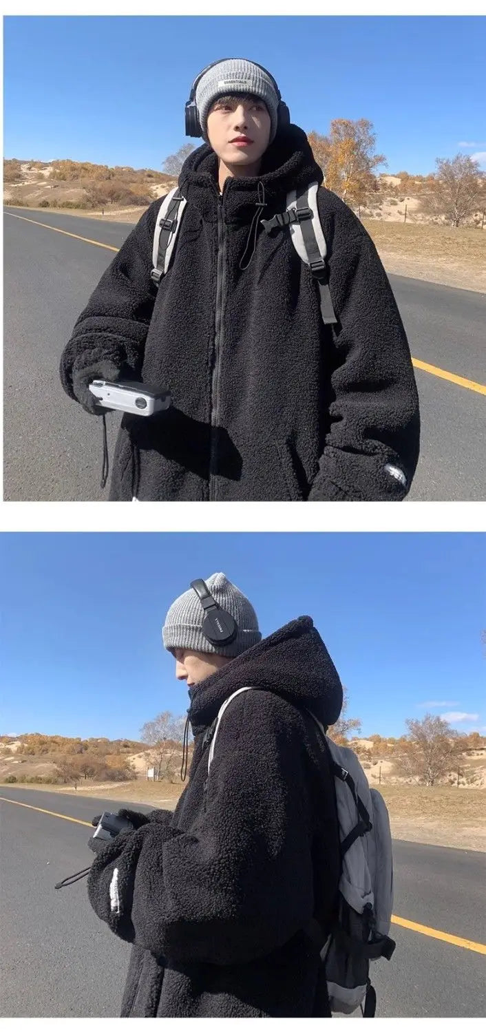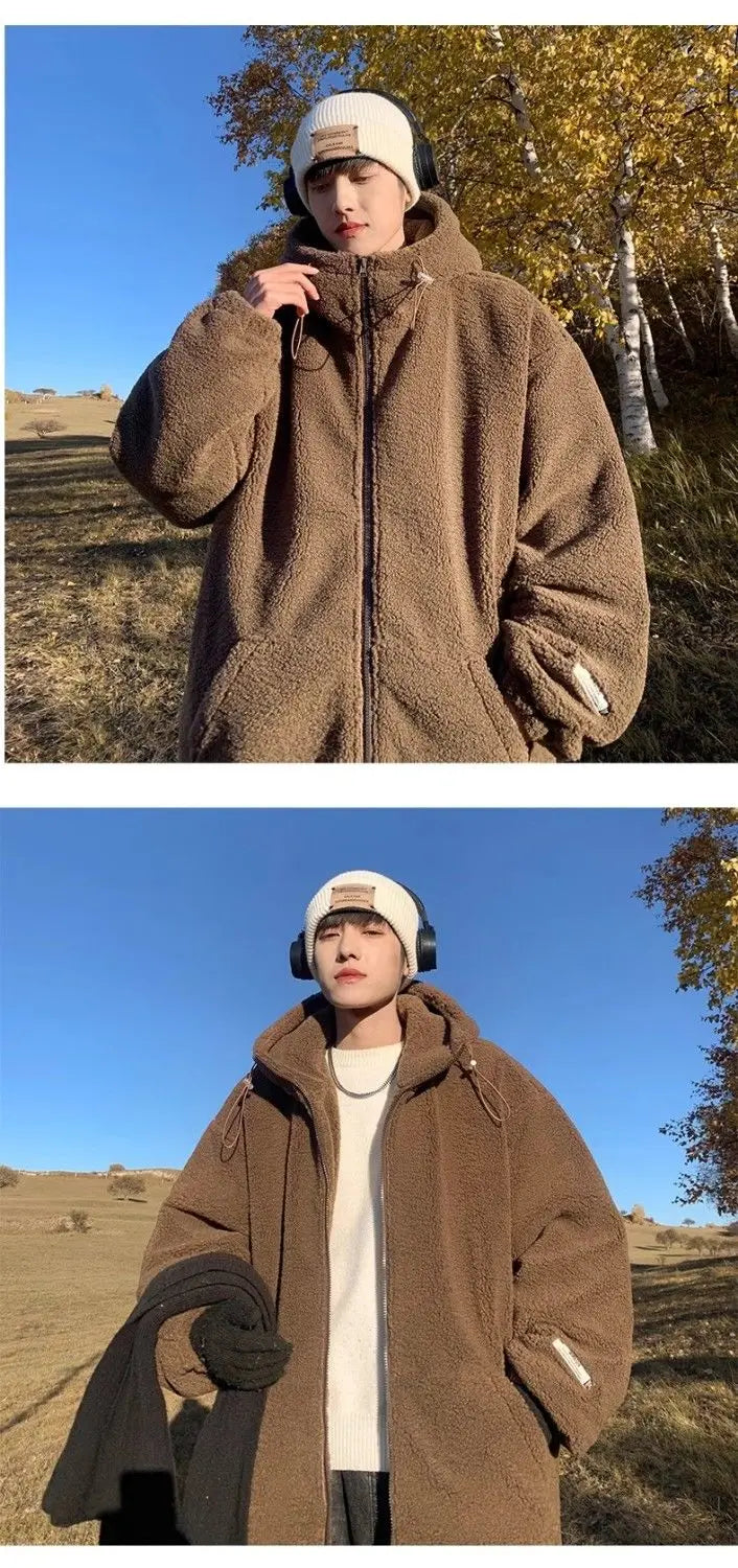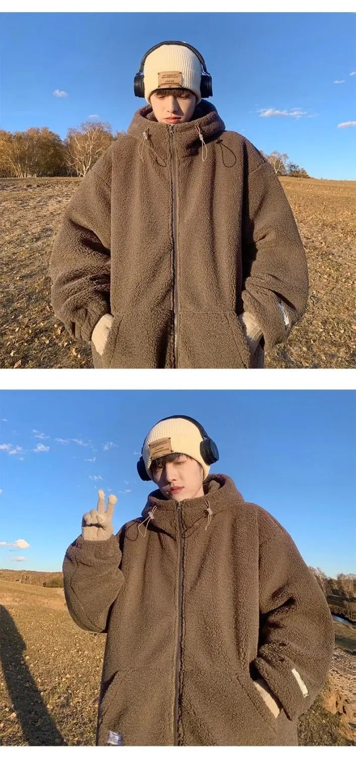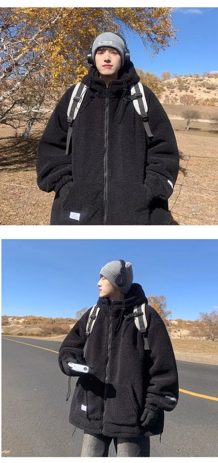 Threebooy Korean Style Polar Fleece Thickened Hooded Lamb Wool Jacket American Fashion Winter Men's Warm Large Size Cotton Coat Aesthetic
