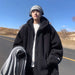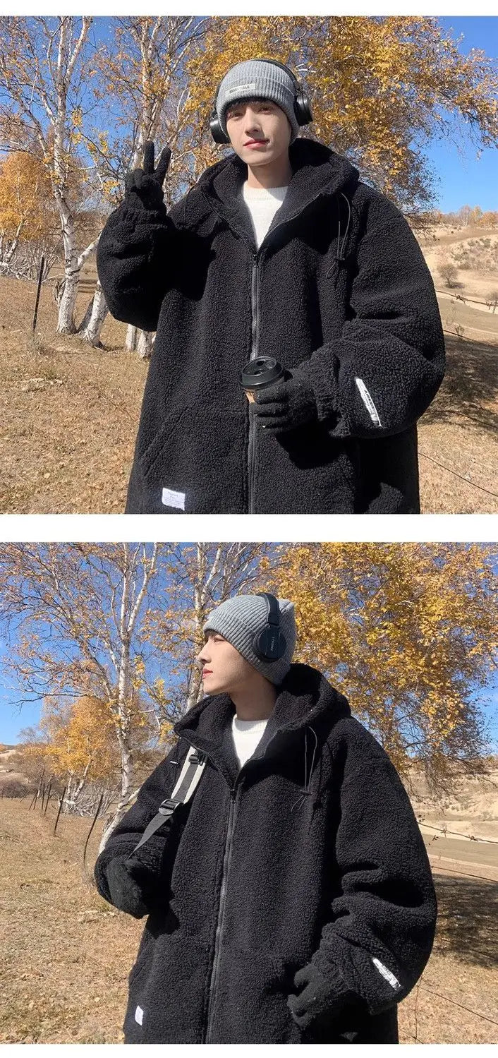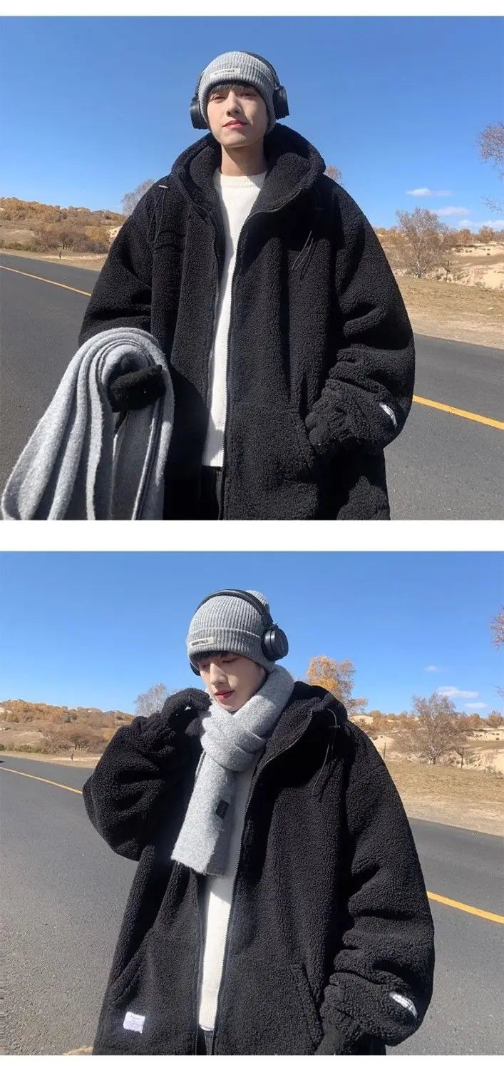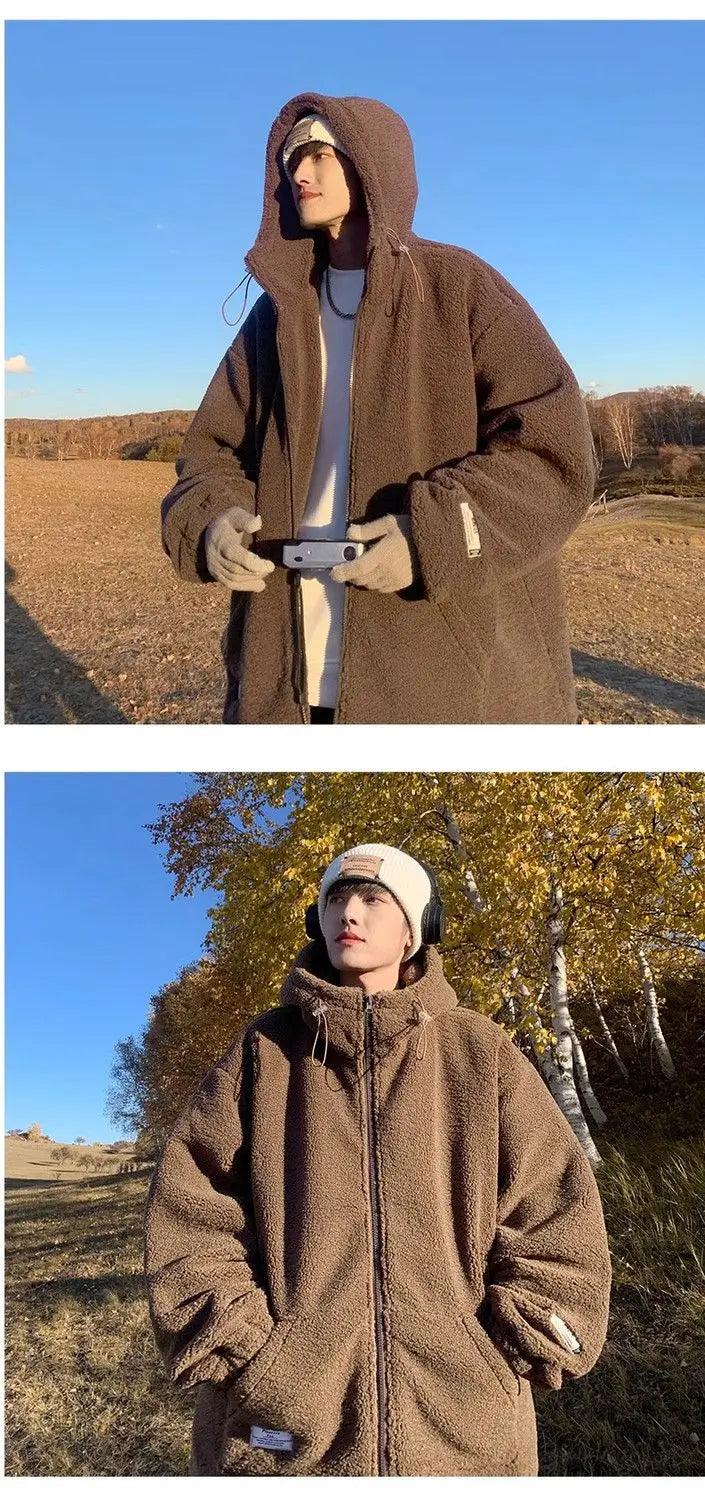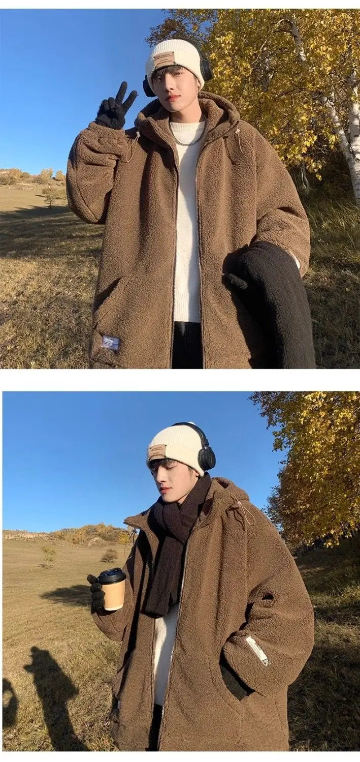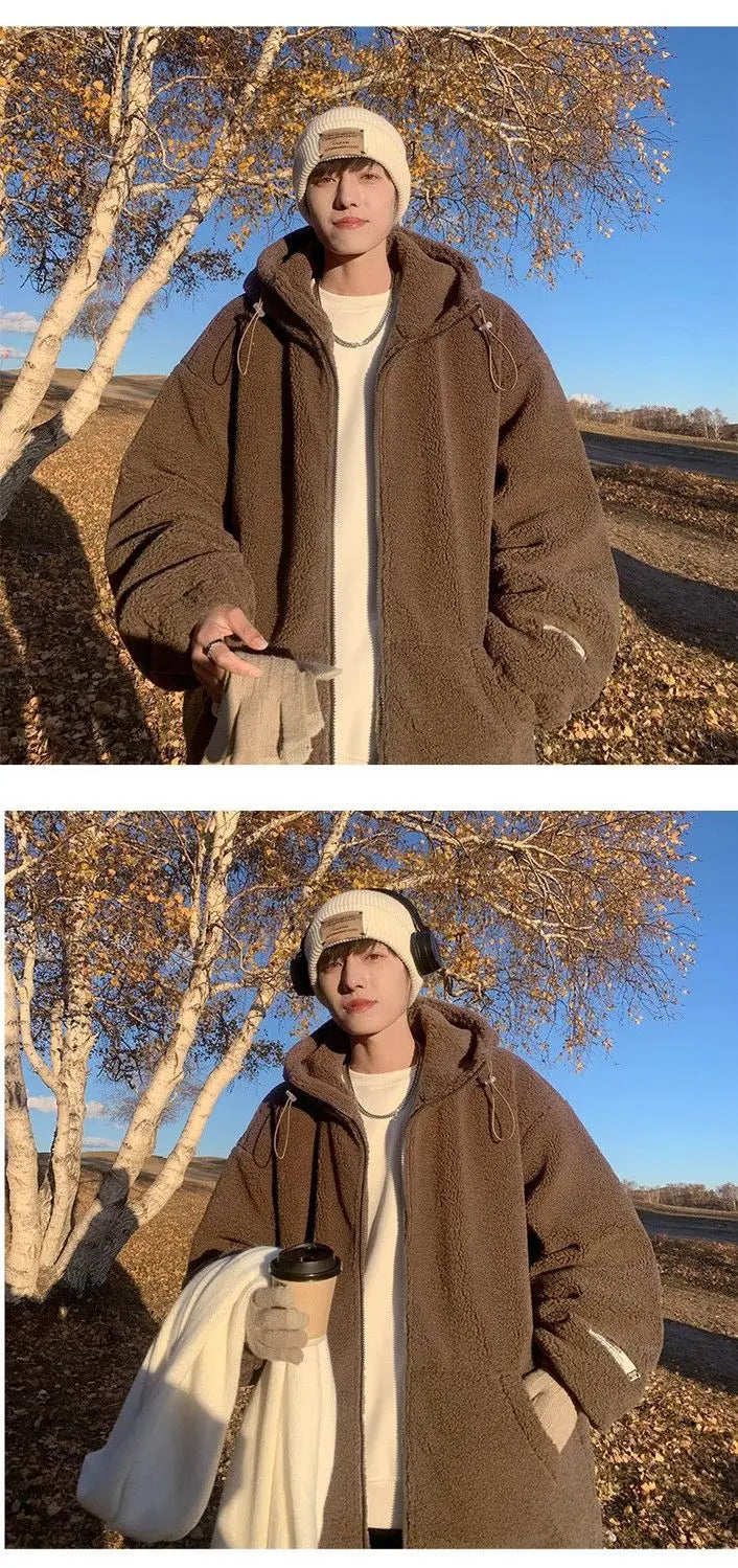 Threebooy Korean Style Polar Fleece Thickened Hooded Lamb Wool Jacket American Fashion Winter Men's Warm Large Size Cotton Coat Aesthetic