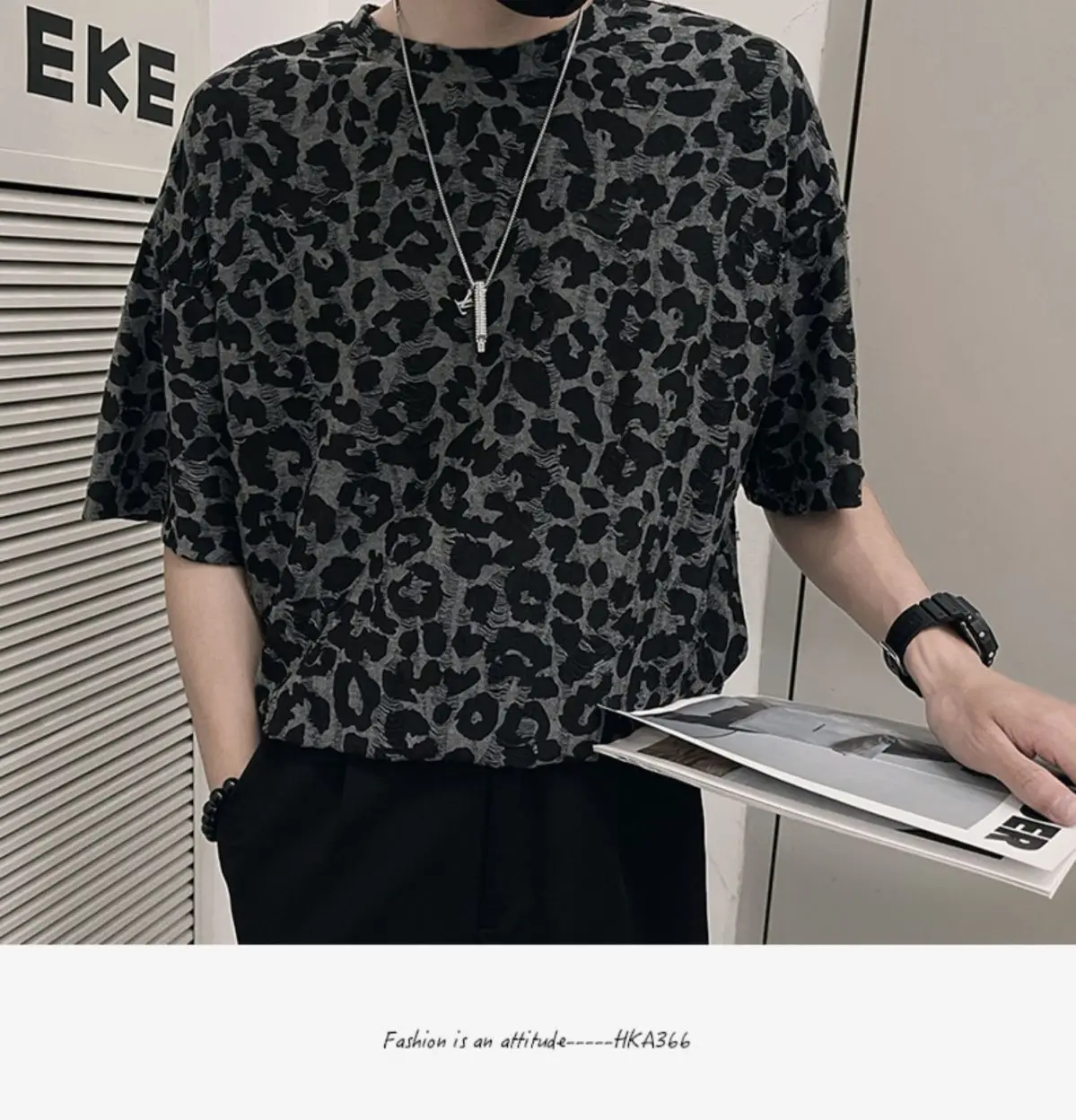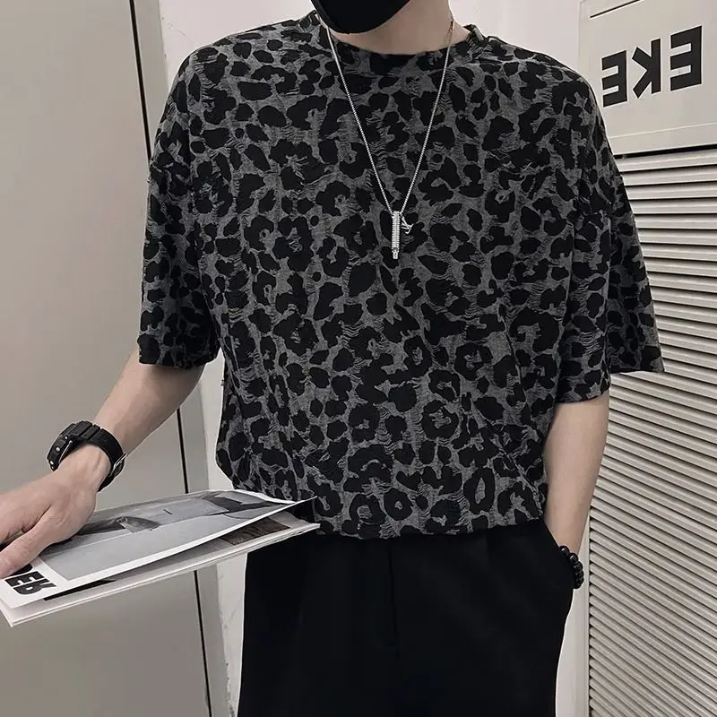 Threebooy Leopard Print Hollow Five-point Sleeve T-shirt Men's Summer Ice Silk Cool Short-sleeved 2025 New Men's Fashion Trend Top Chic