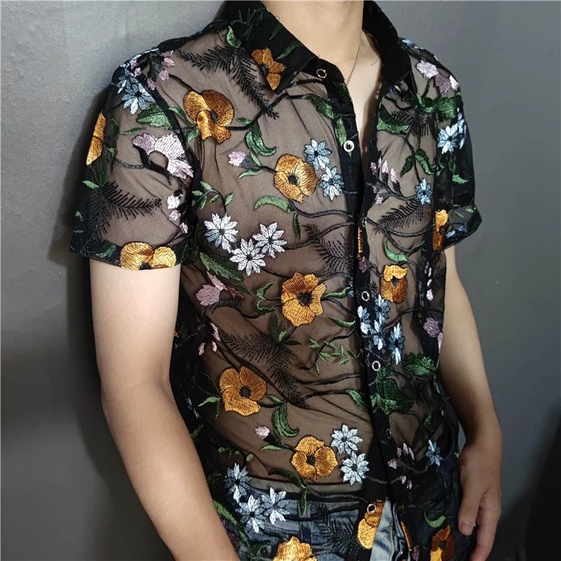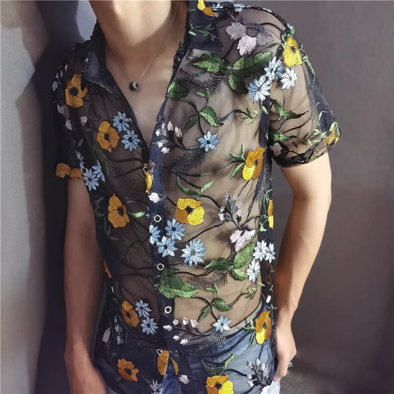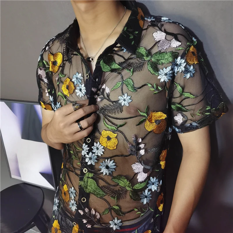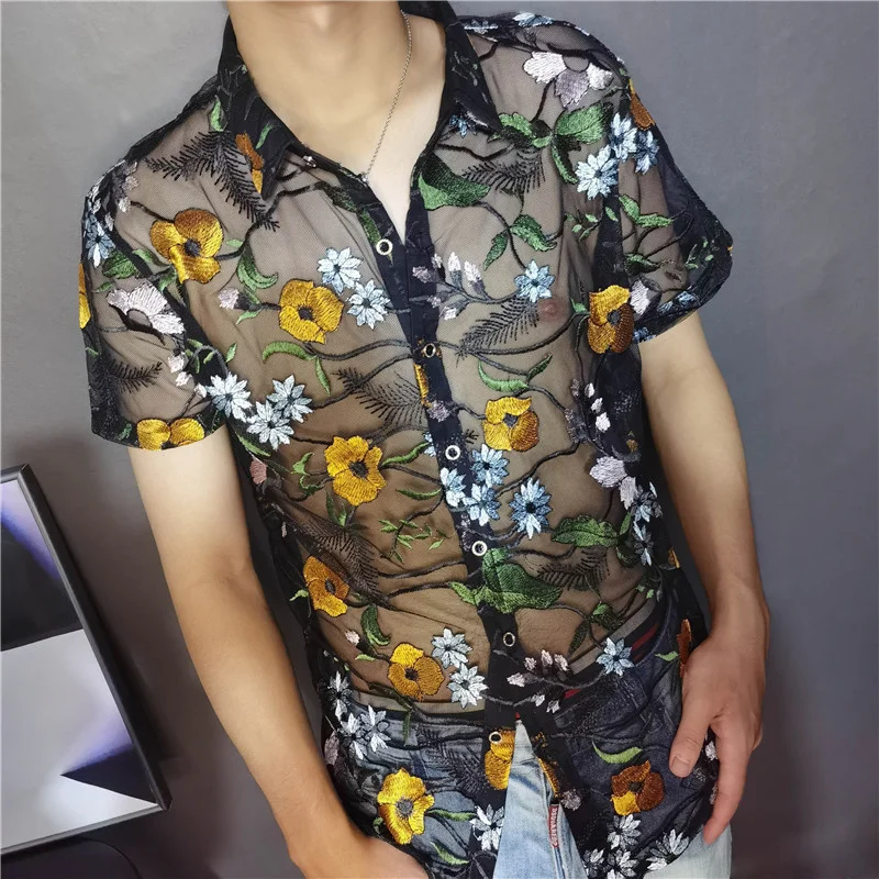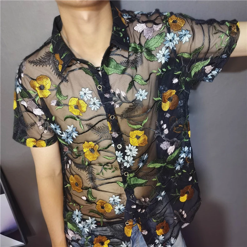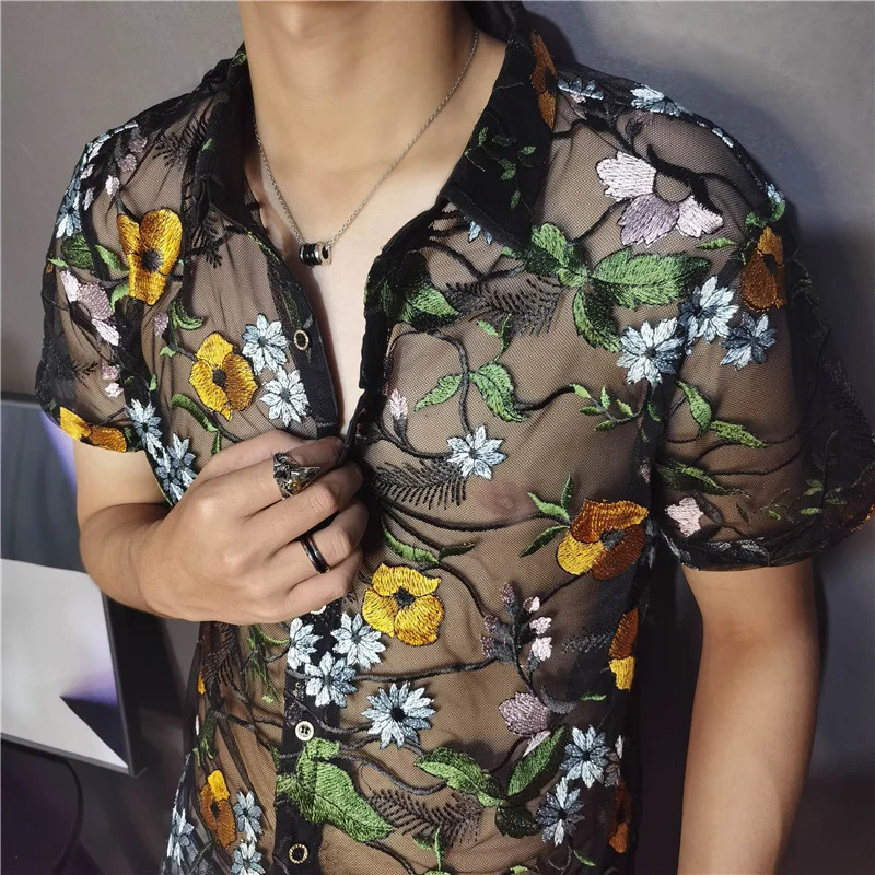 Threebooy Luxe Mesh Transparent Shirt Summer Short Sleeve Shirt Flower Lace Shirt Embroidery See Through Sexy Shirt Men Chemise Homme