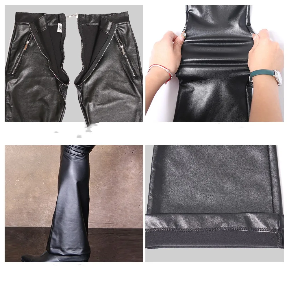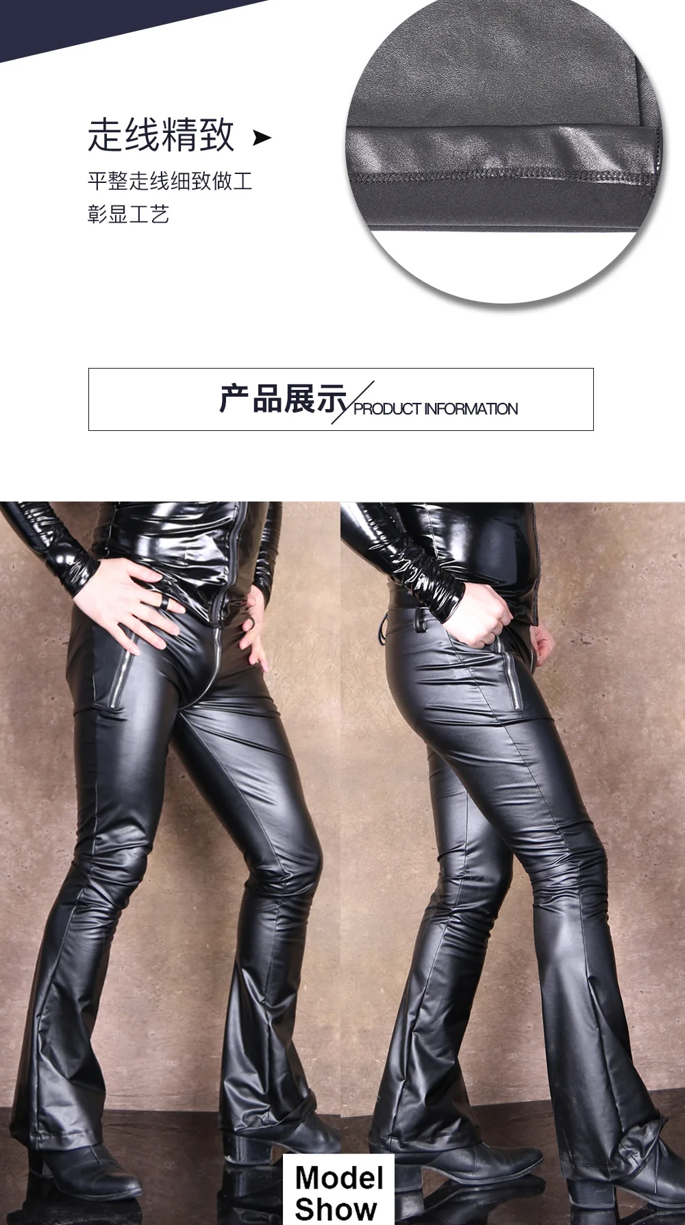 Threebooy masculina New slim-fit men's leather pants PU leather pants tight low-waisted U-flare pants motorcycle pants