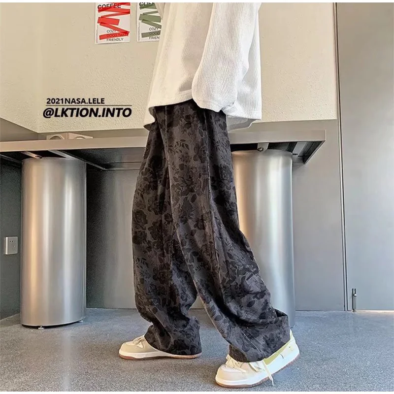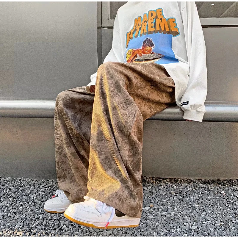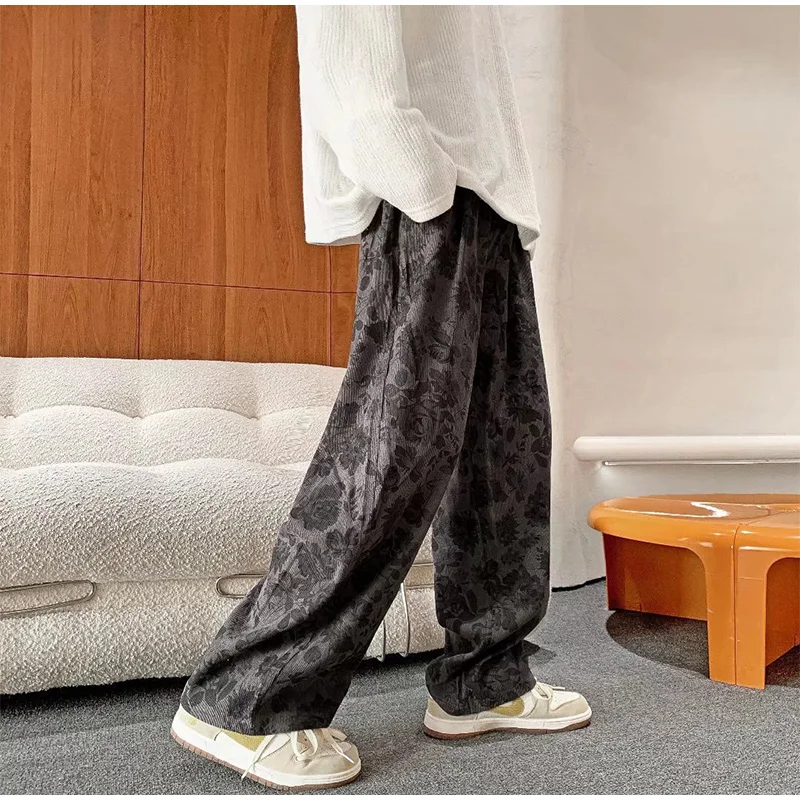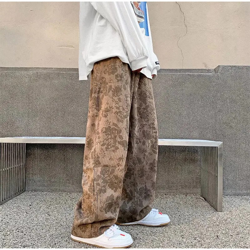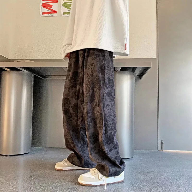 Threebooy Men Casual Pants 2024 New Spring Autumn Vintage Floral Corduroy Y2k Wide leg Oversize Harajuku Pant Male Straight Long Trousers
