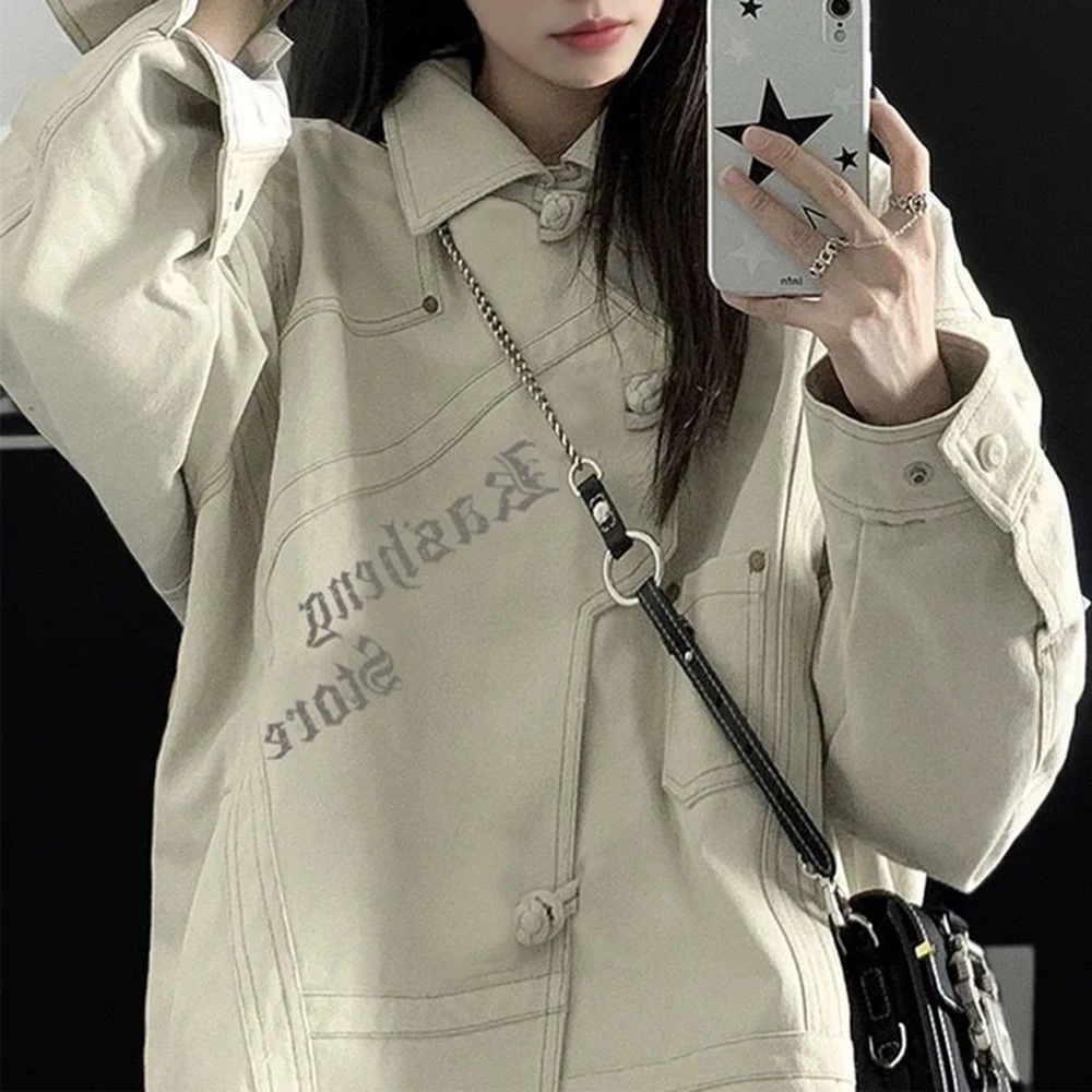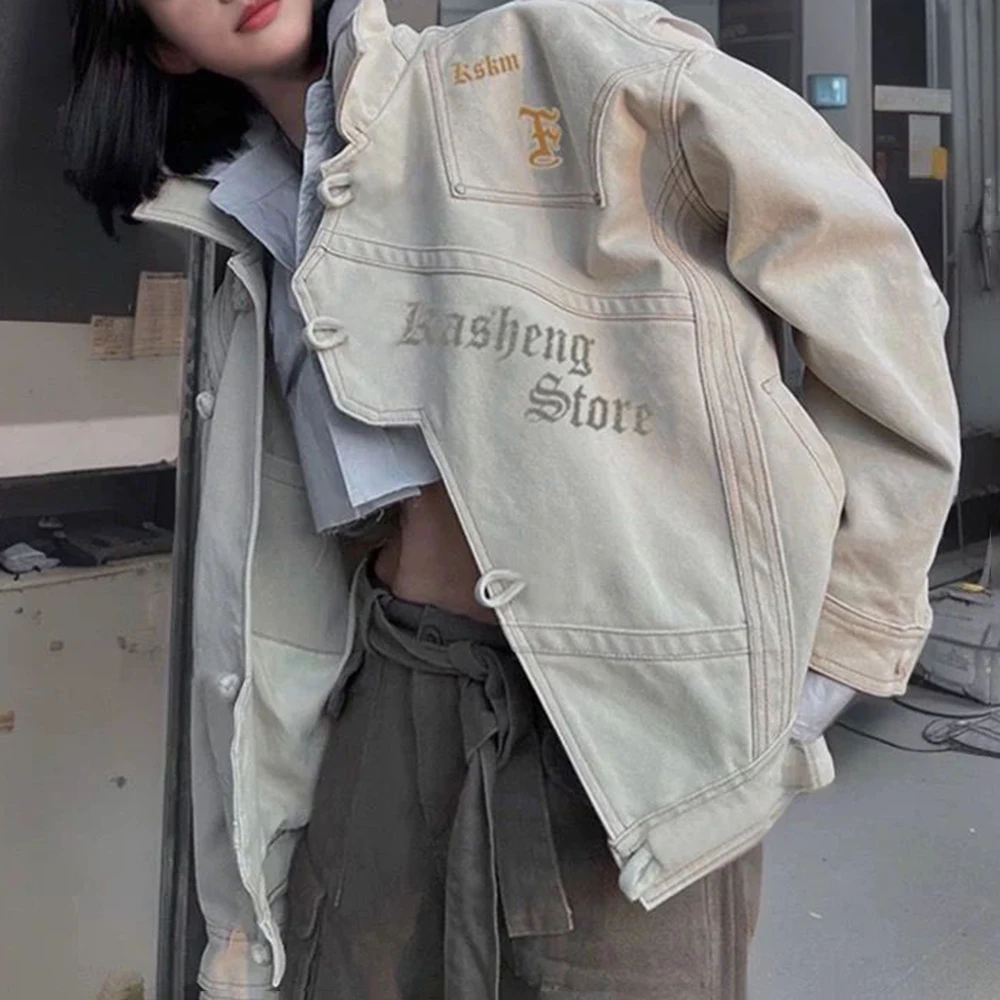 Threebooy Men Denim Jacket Cheongsam Button Letter Print Bomber Jacket Streetwear Fashion Youth Campus Versatile Casual Top Men'S Clothing
