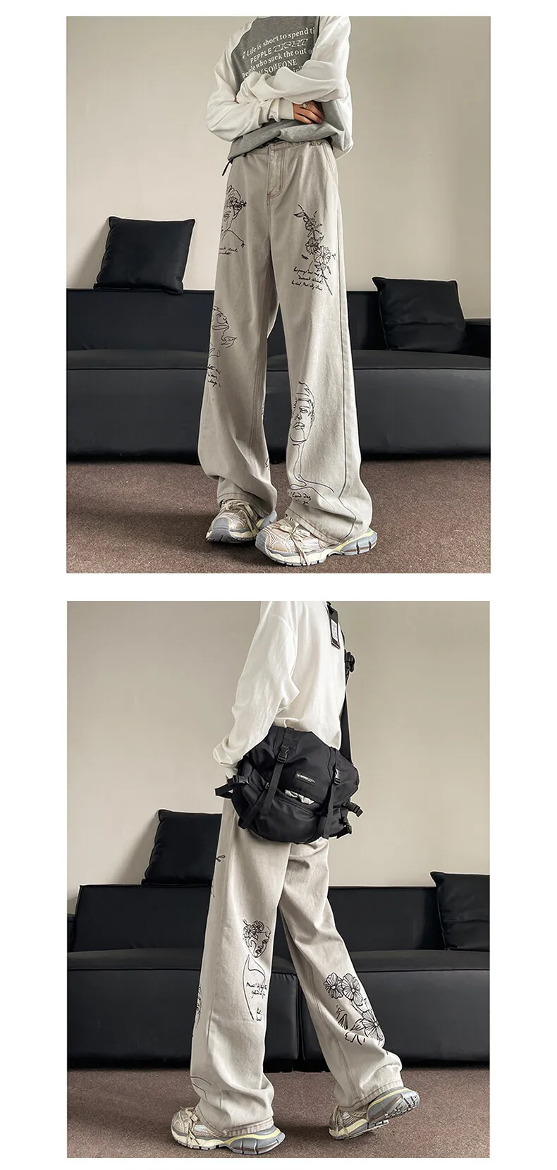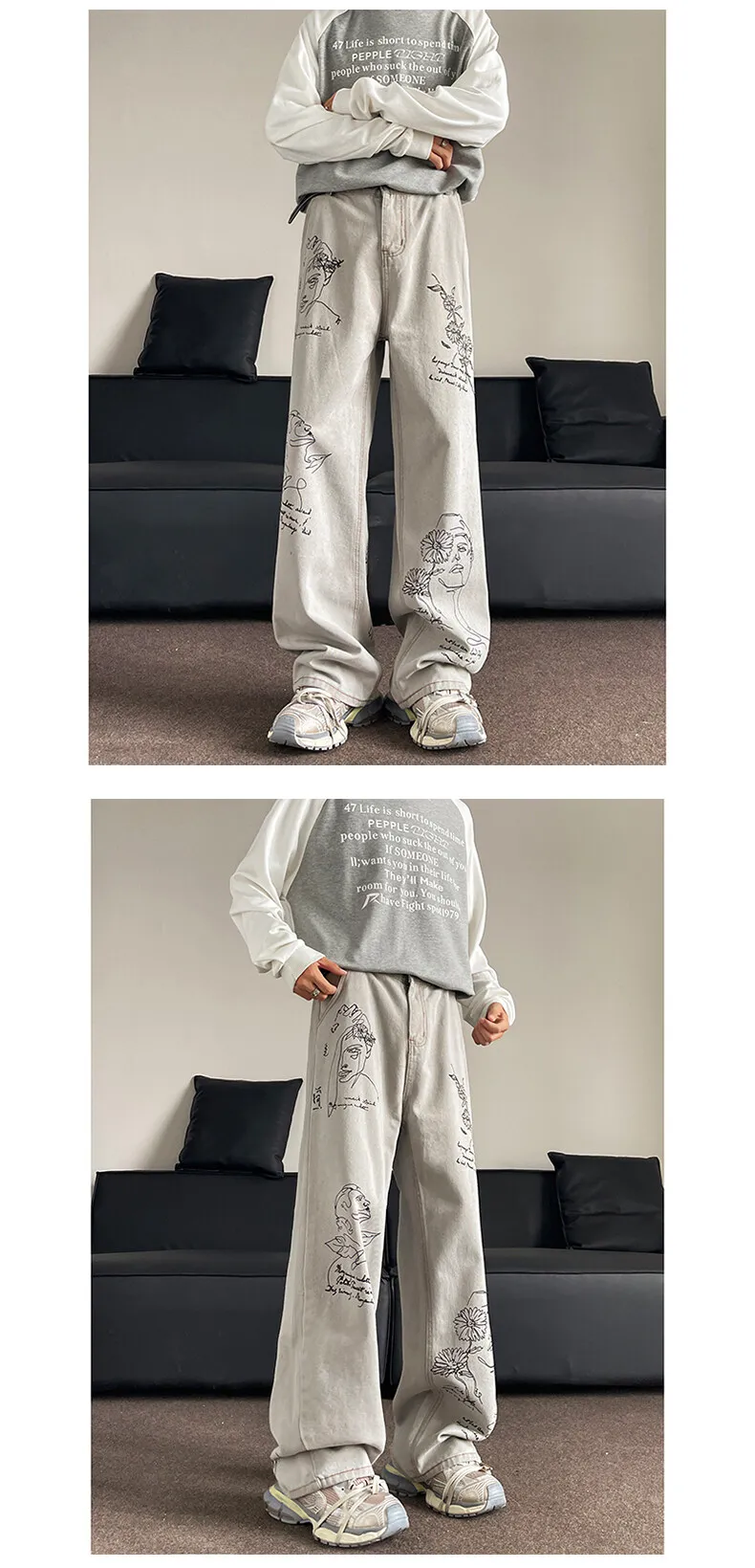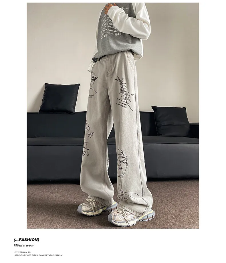 Threebooy Men Loose Fit Straight Leg Printed Jeans Casual Comfort Denim Pants Streetwear Trendy Fashion Hip Hop Baggy Denim Trousers