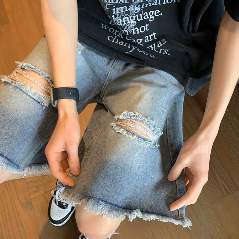 Threebooy Men's Blue Shorts Streetwear Baggy Jeans Jorts Straight Trousers Wide Pants Luxury Man Jeans Ripped Clothing