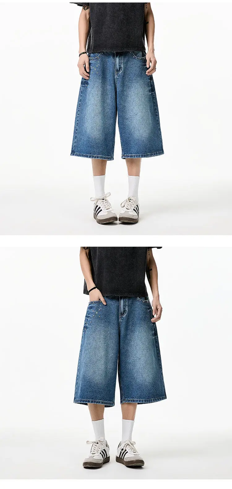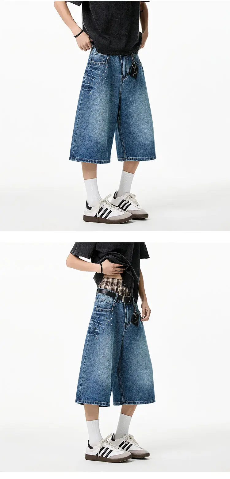 Threebooy Mens Calf length jeans Loose Fit Summer Studded Rivet Casual Streetwear Lightweight Comfort Cool Trendy Fashion weid leg