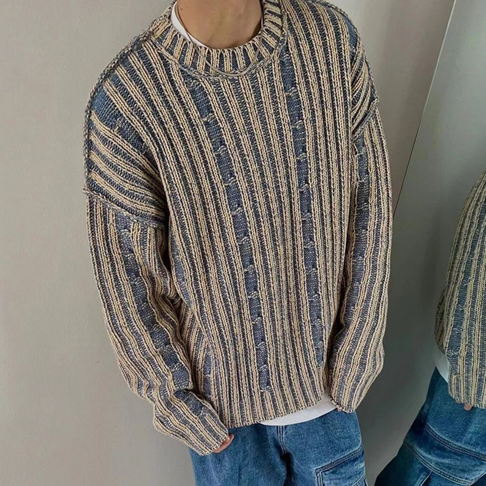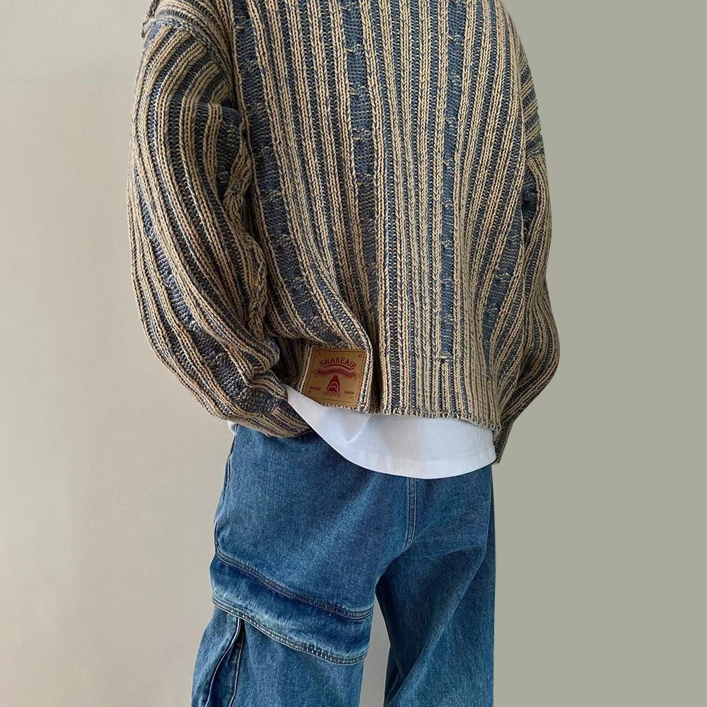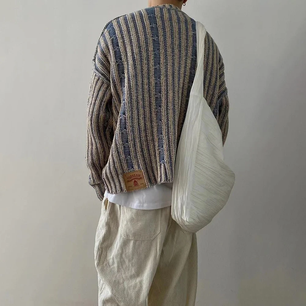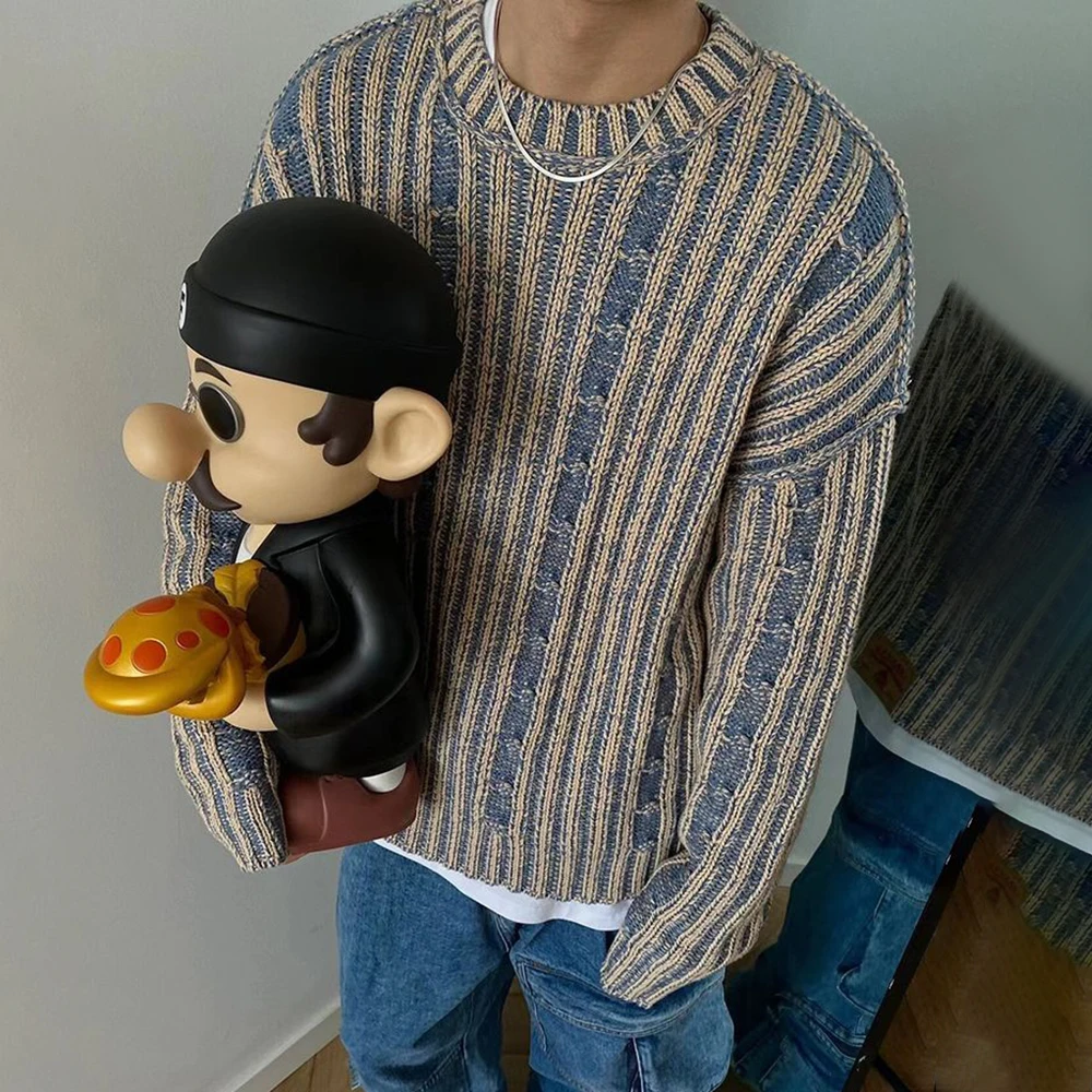 Threebooy Mens Casual Color-Blocked Striped Distressed Knitted Sweater Genderless 2024 New Fashion Personalized Twist New Product Unisex